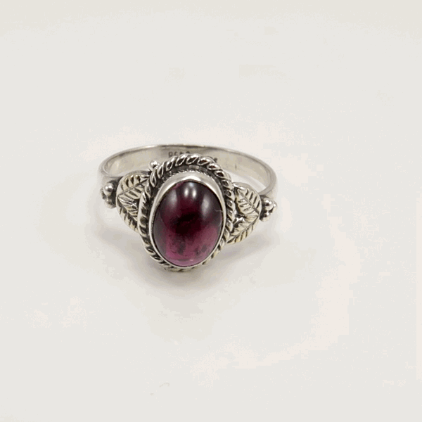 Anel em prata, feito artesanalmente, trabalhado em relevo. Com um design simples e elegante. Contempla uma Pedra de Granada natural da melhor qualidade!