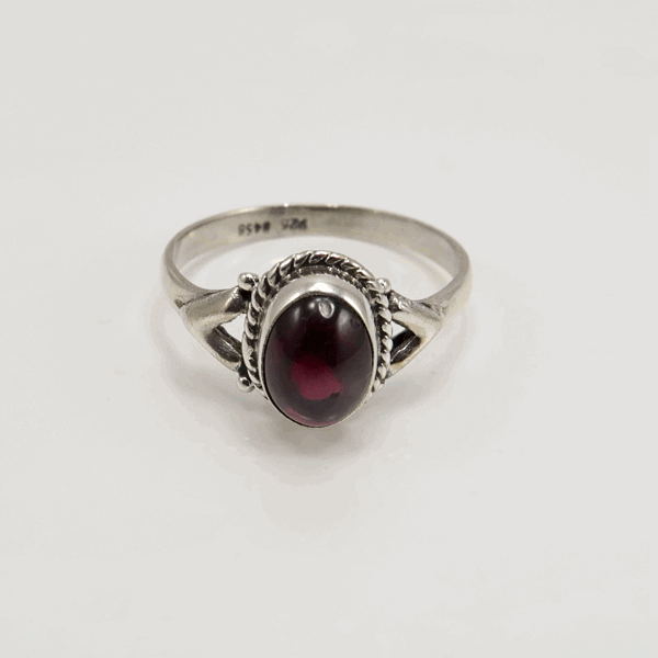Anel em prata, feito artesanalmente, trabalhado em relevo. Com um design simples e elegante. Contempla uma Pedra de Granada natural da melhor qualidade!