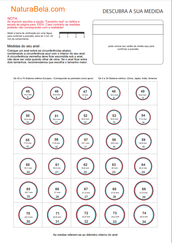 NOTA: Confirme a sua medida antes de adquirir o anel. Pode calcular a sua medida no seguinte documento.