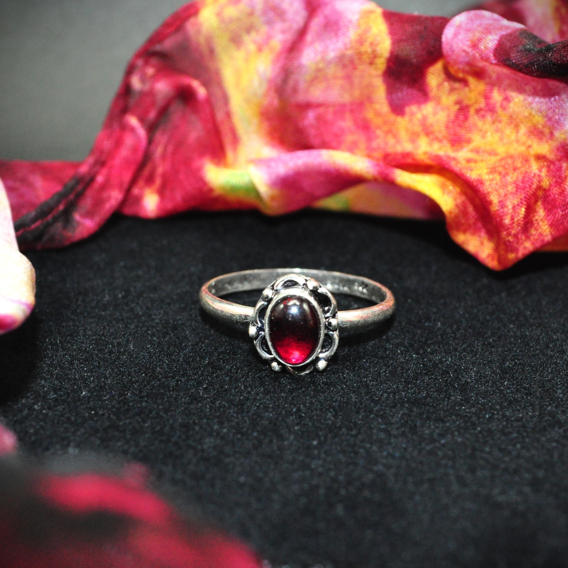 No centro da peça, uma Pedra de Granada natural se destaca com seu vermelho profundo e vibrante, adicionando um toque de cor e brilho ao anel.