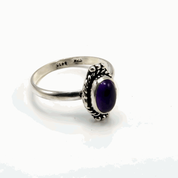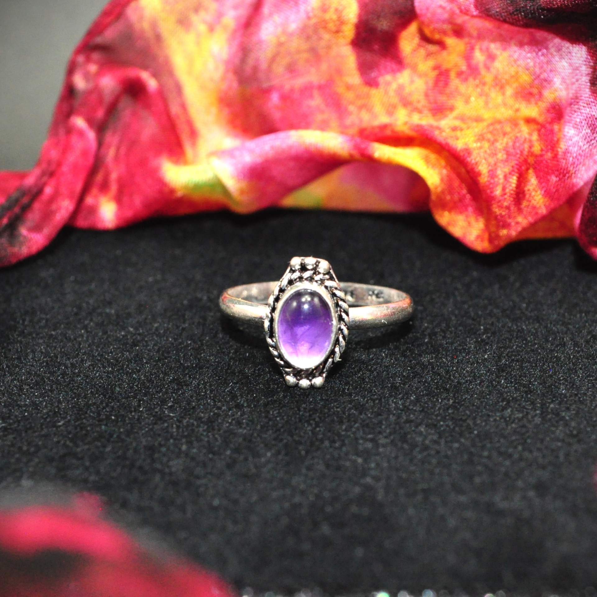 A peça apresenta uma pedra preciosa de ametista, conhecida pela sua tonalidade roxa intensa e propriedades calmantes e protetoras.