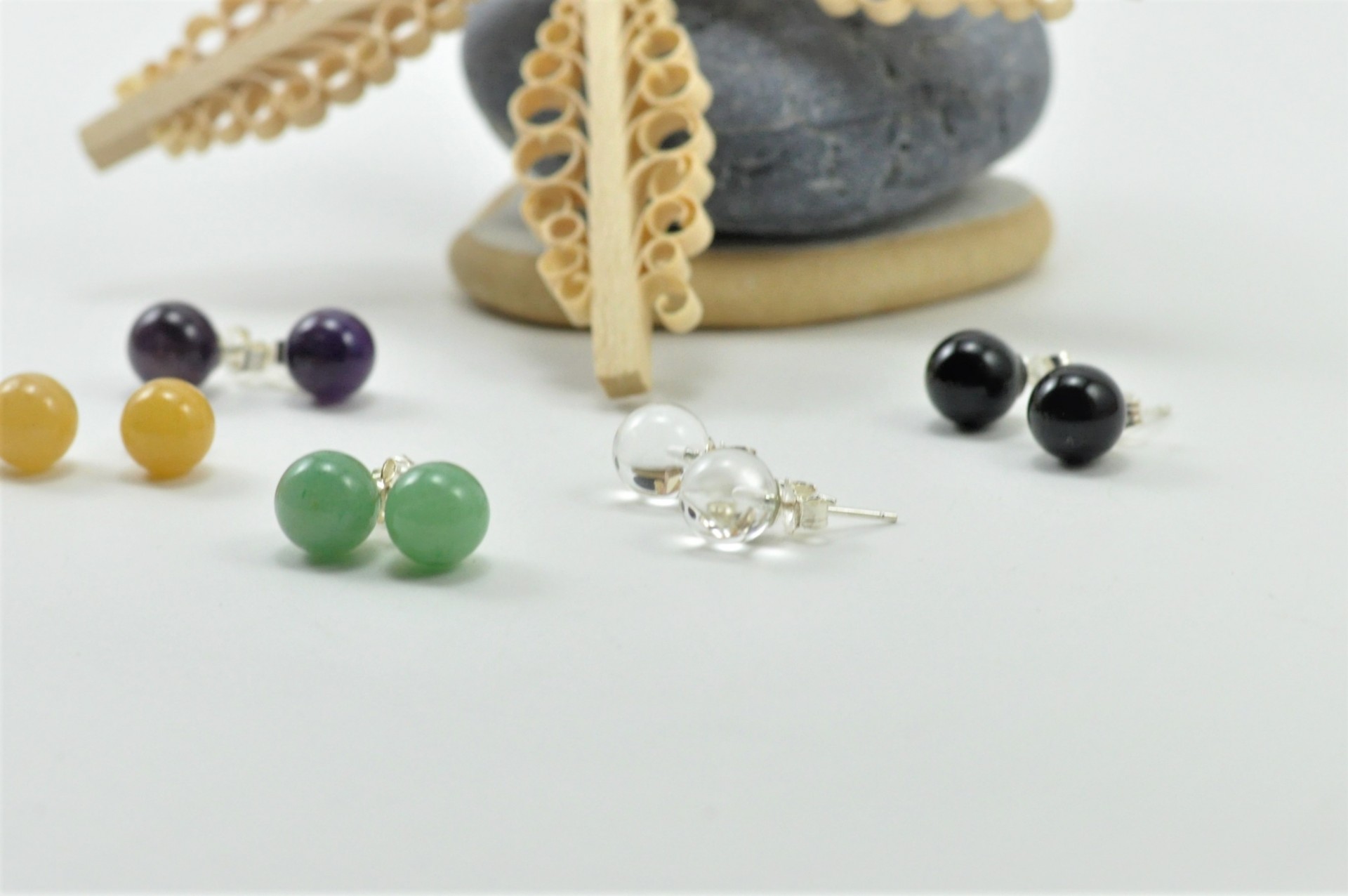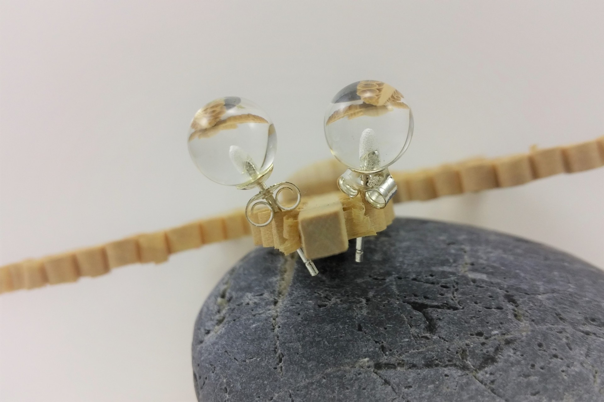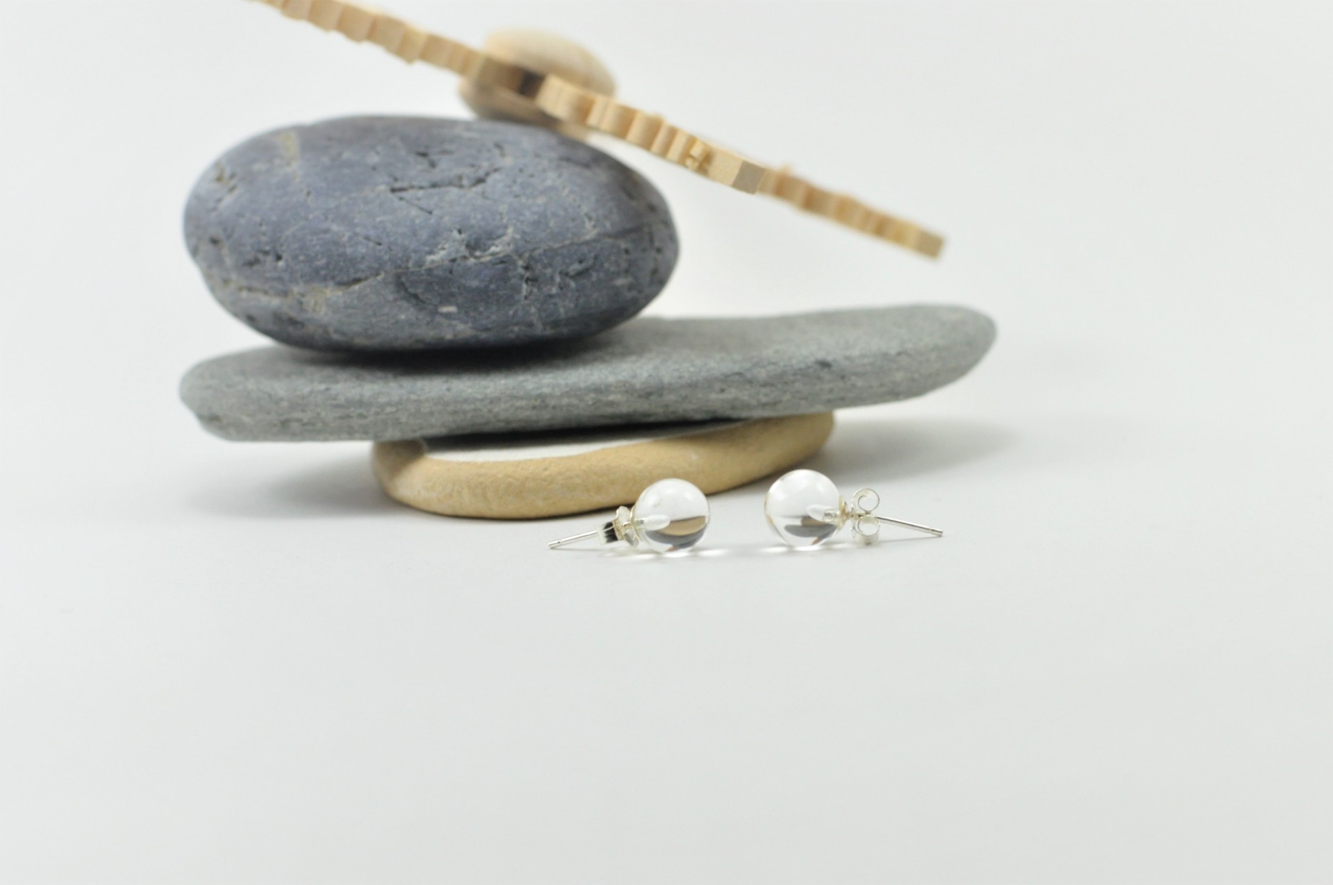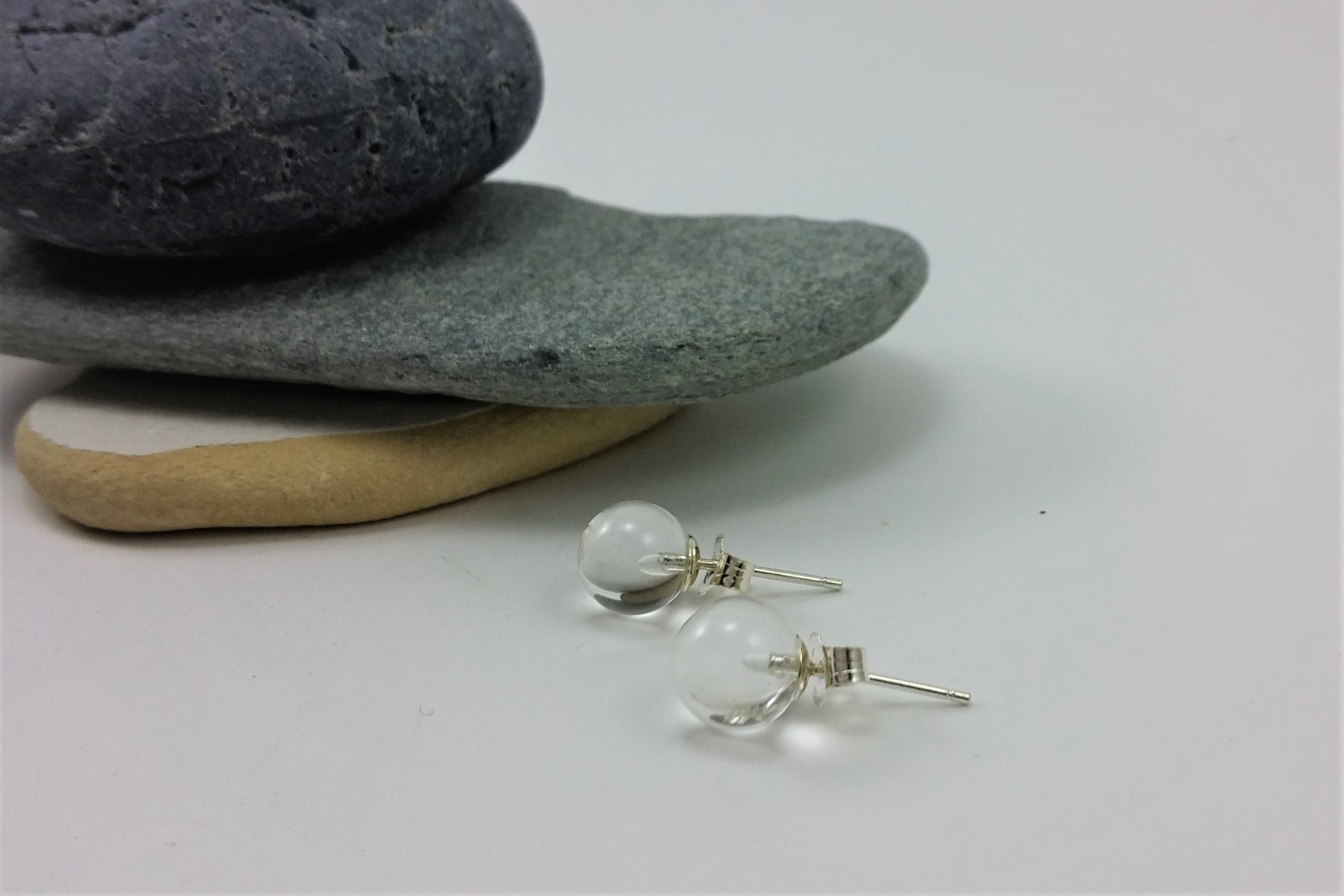 Brincos com bolas de 8mm de diâmetro em Quartzo Cristal com fecho em prata de lei 925.