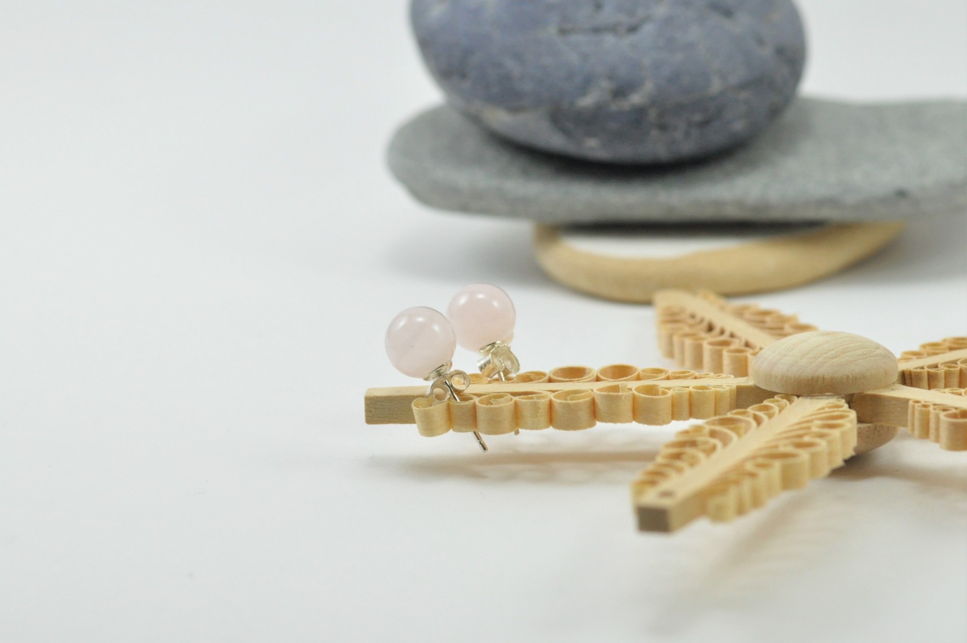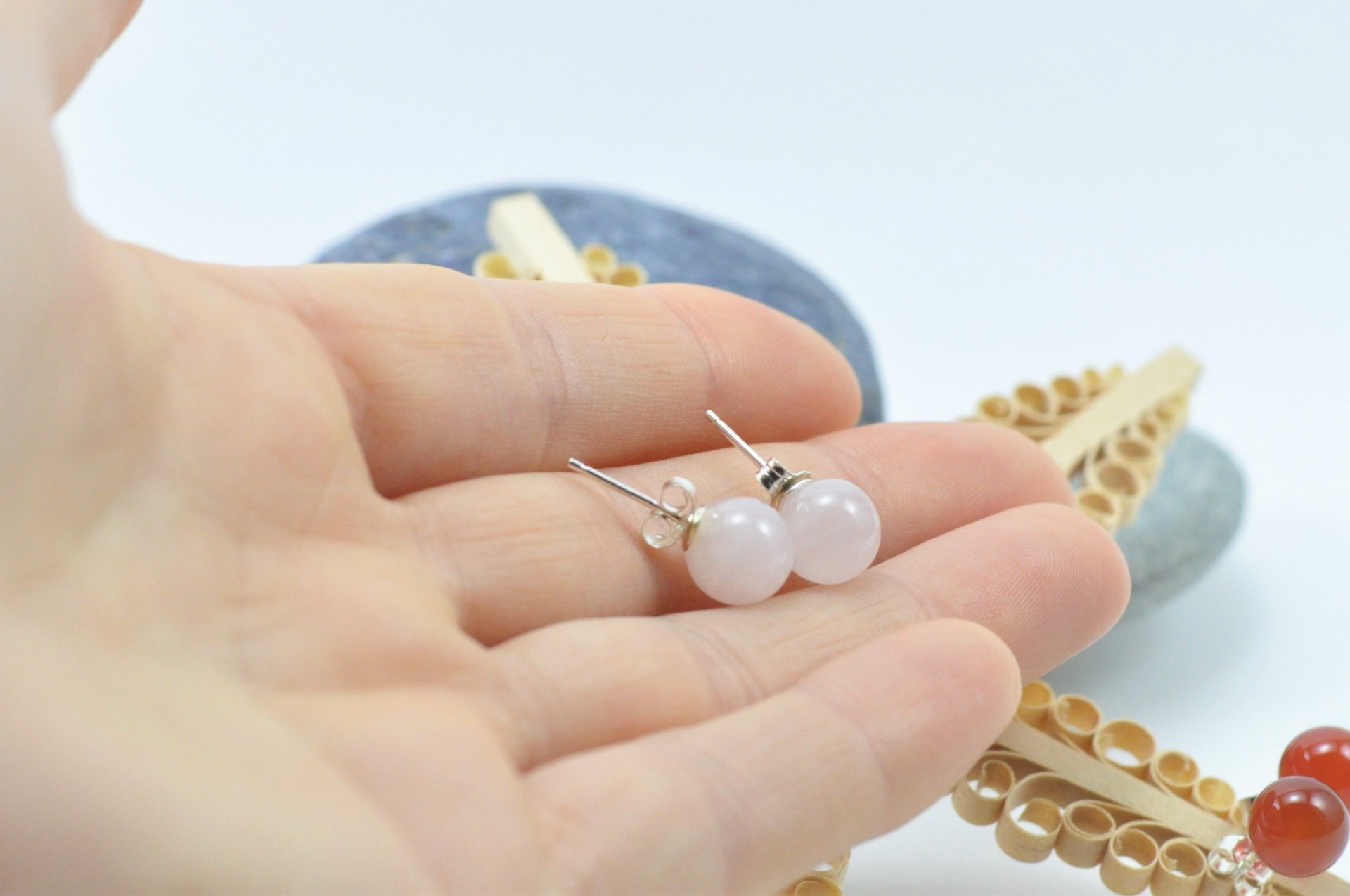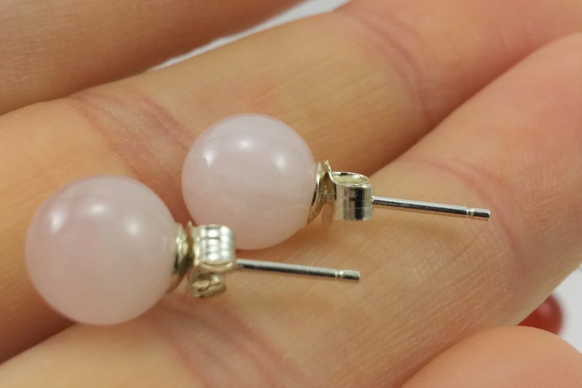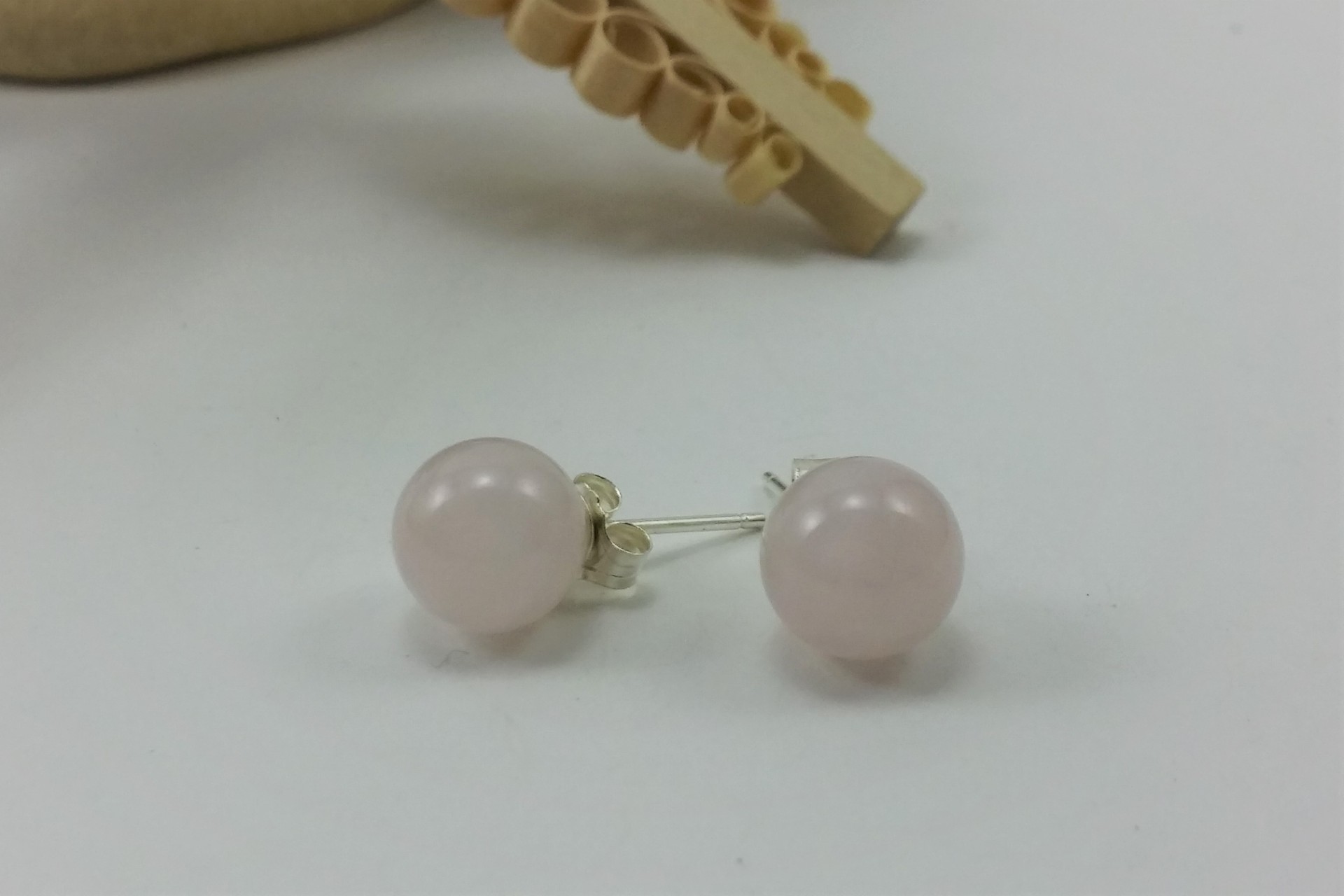 Brincos com bolas de 8mm de diâmetro em Quartzo Rosa com fecho em prata de lei 925.