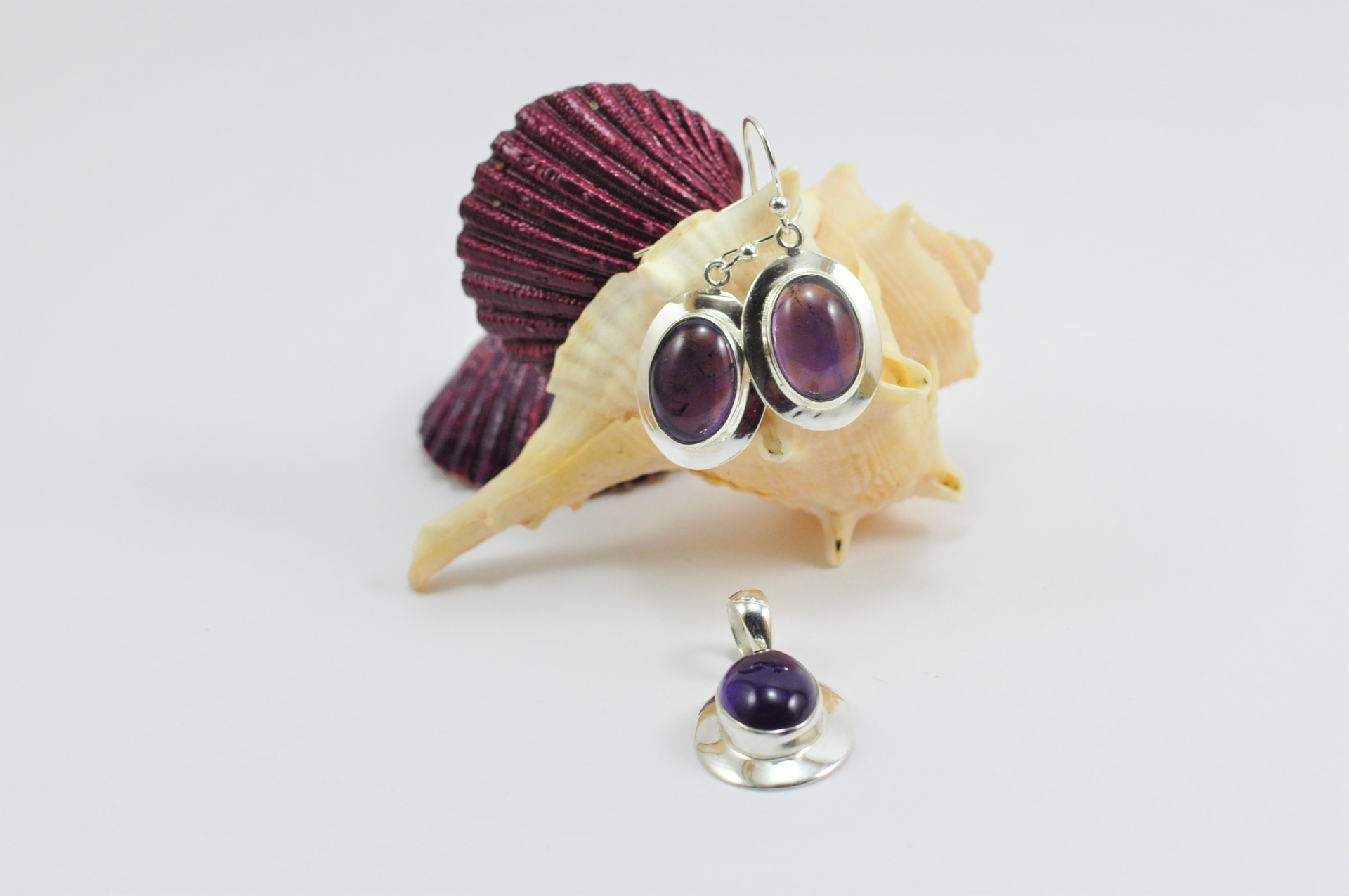 Brincos em prata de lei com ametista oval. A estrutura do pendente é em prata lisa, o que faz realçar a pedra de Ametista. Apresenta um desenho moderno e elegante.