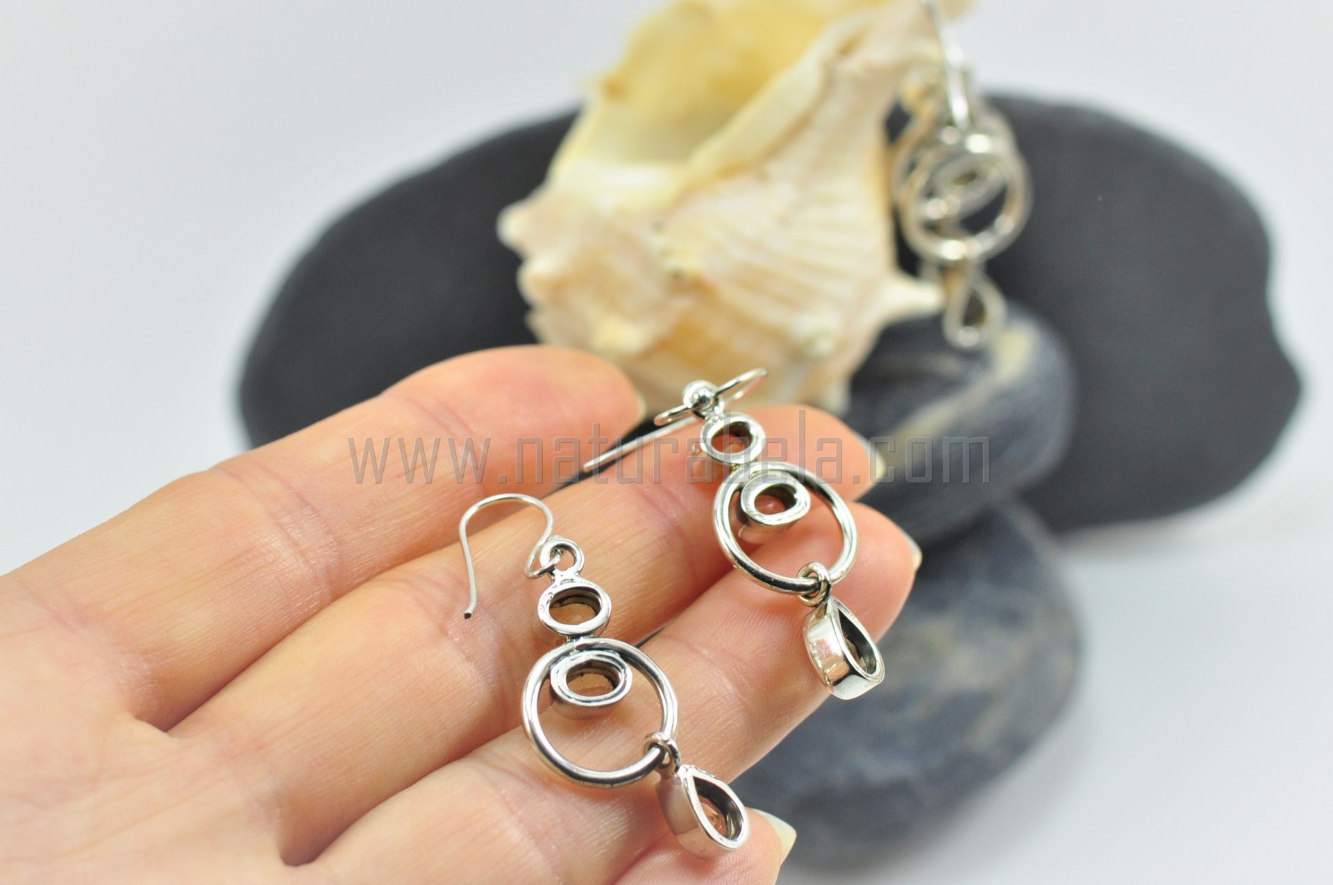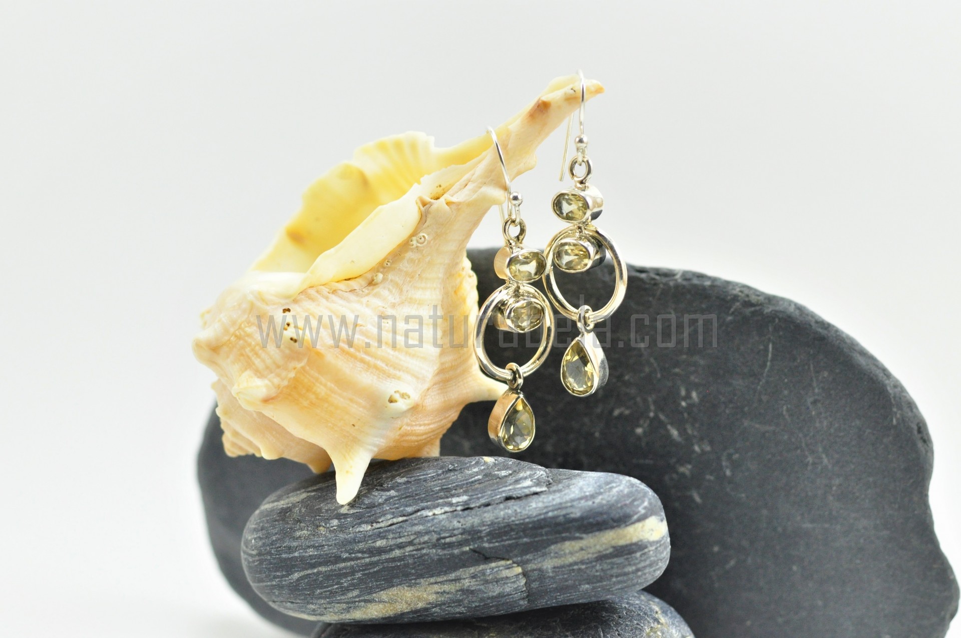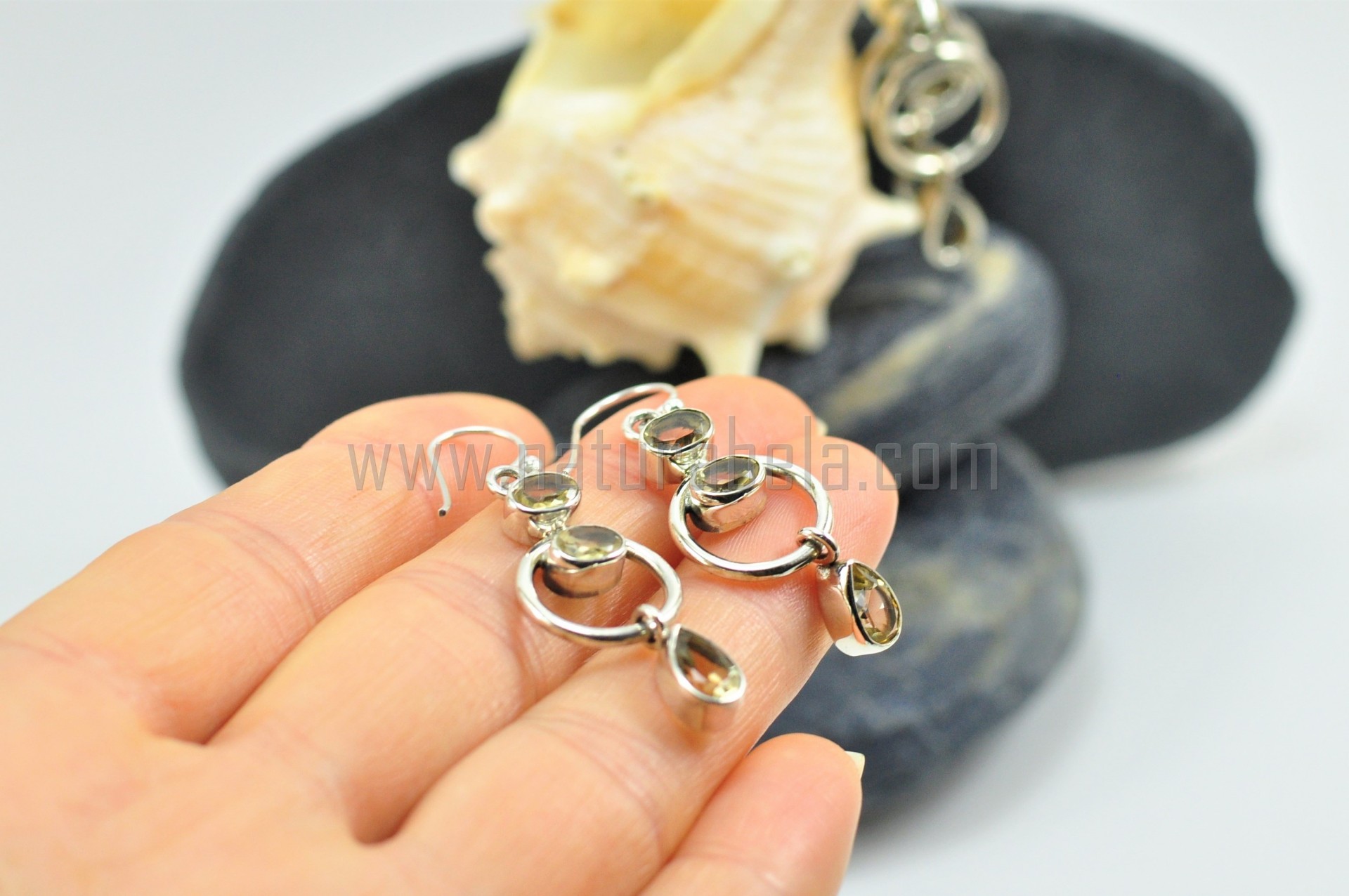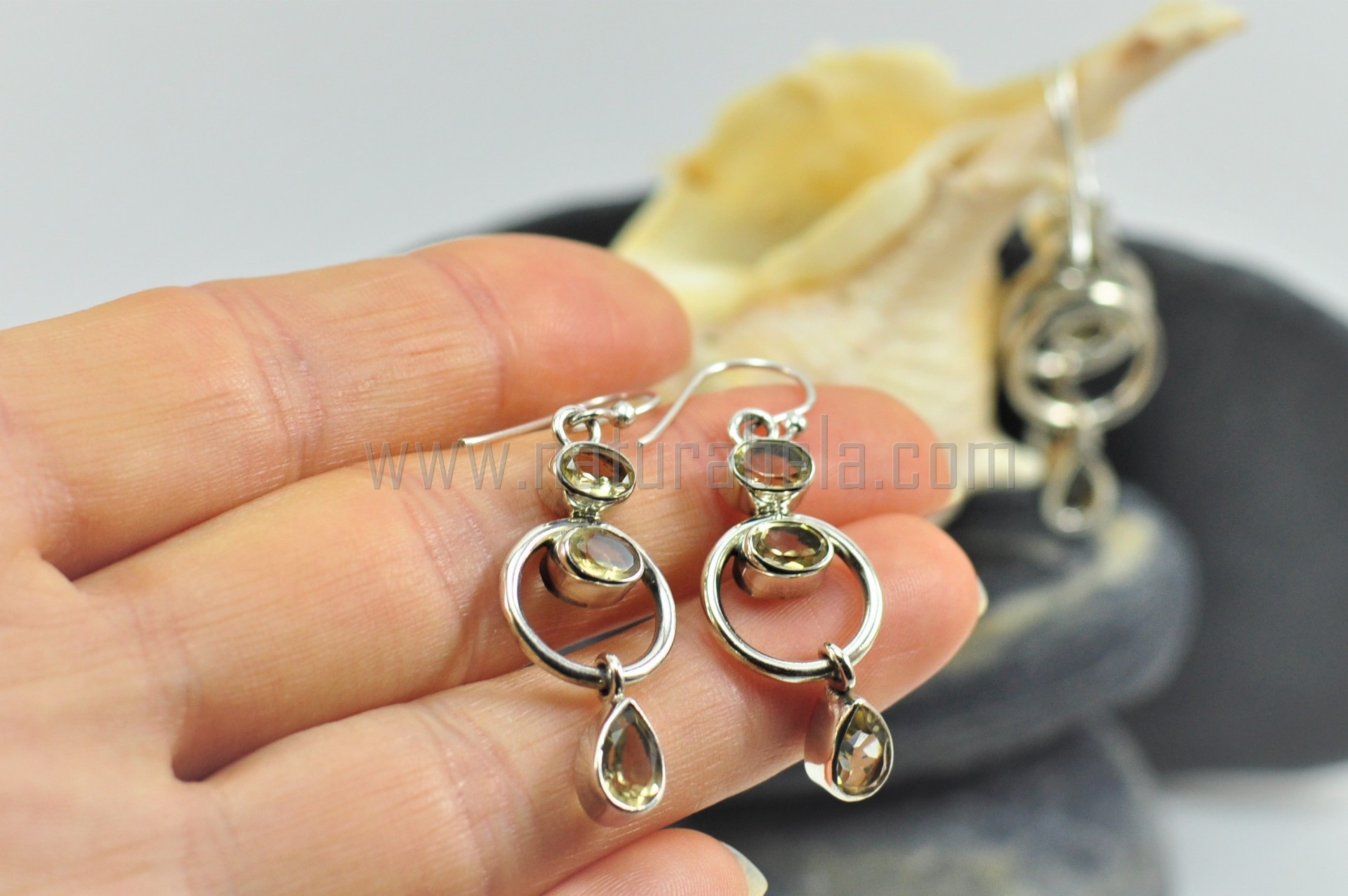 Estes brincos são em prata com pedras naturais facetadas de citrino. Tem um comprimento desde o gancho de 4,5cm e peso de 6g.