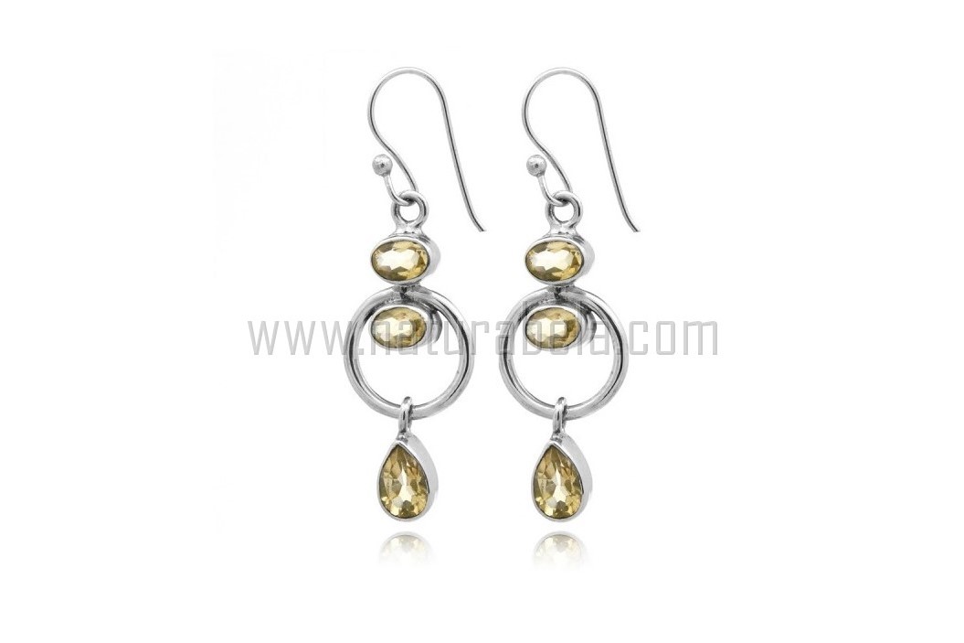 Este modelo de brincos é bastante original e elegante, contém 3 pedras facetadas de citrino onde duas são em formato oval e uma em formato de lágrima.