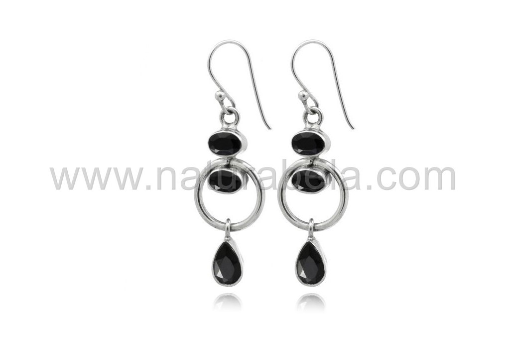 Este modelo de brincos é bastante original e elegante, contém 3 pedras facetadas de Ónix onde duas são em formato oval e uma em formato de lágrima.