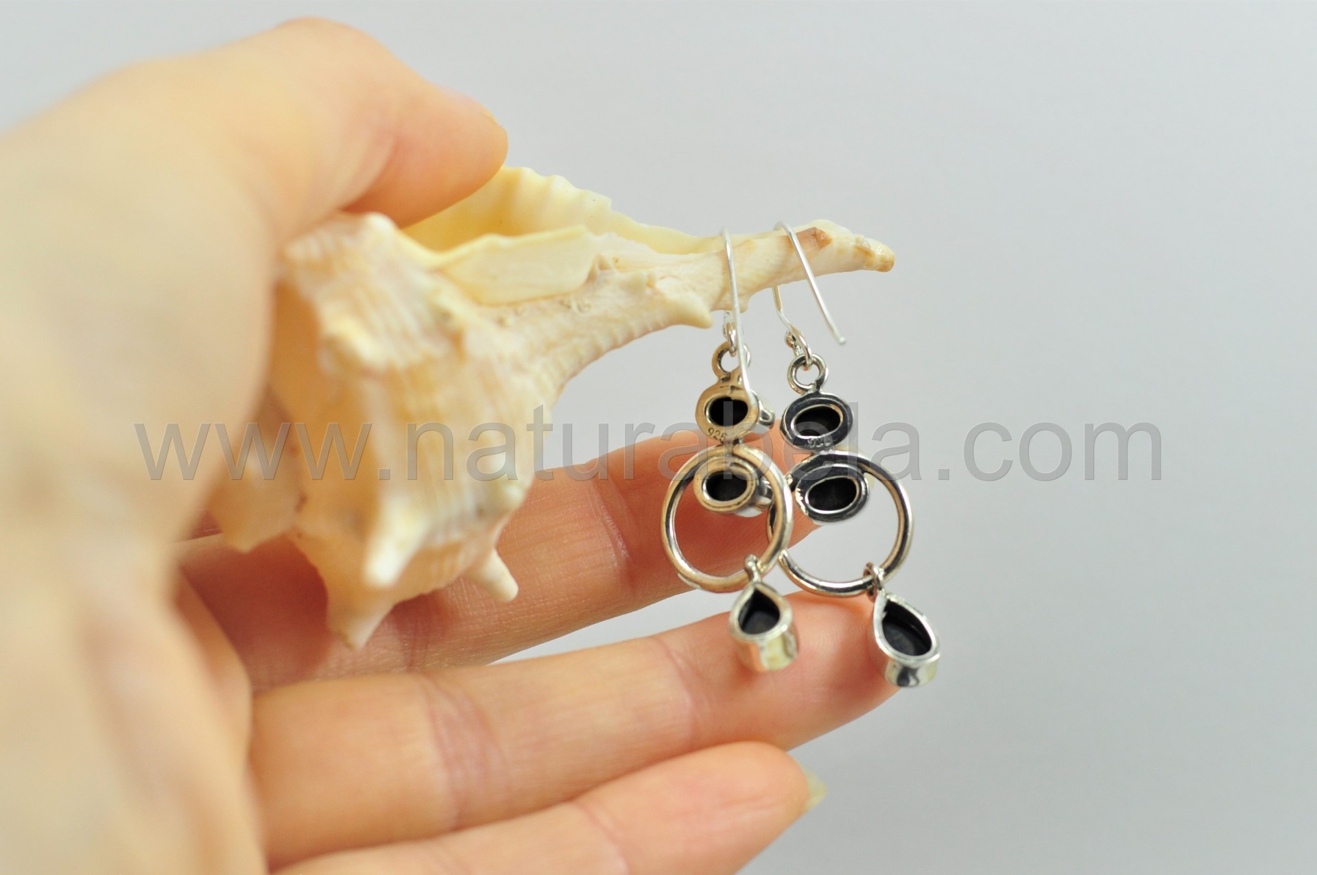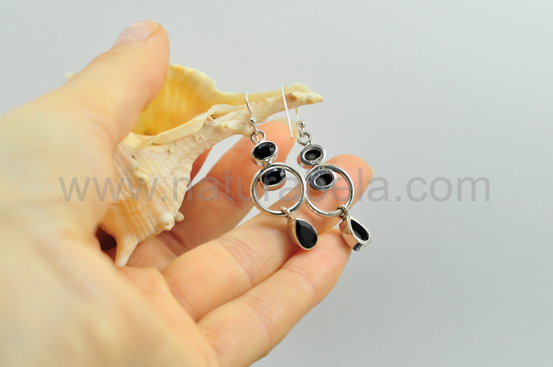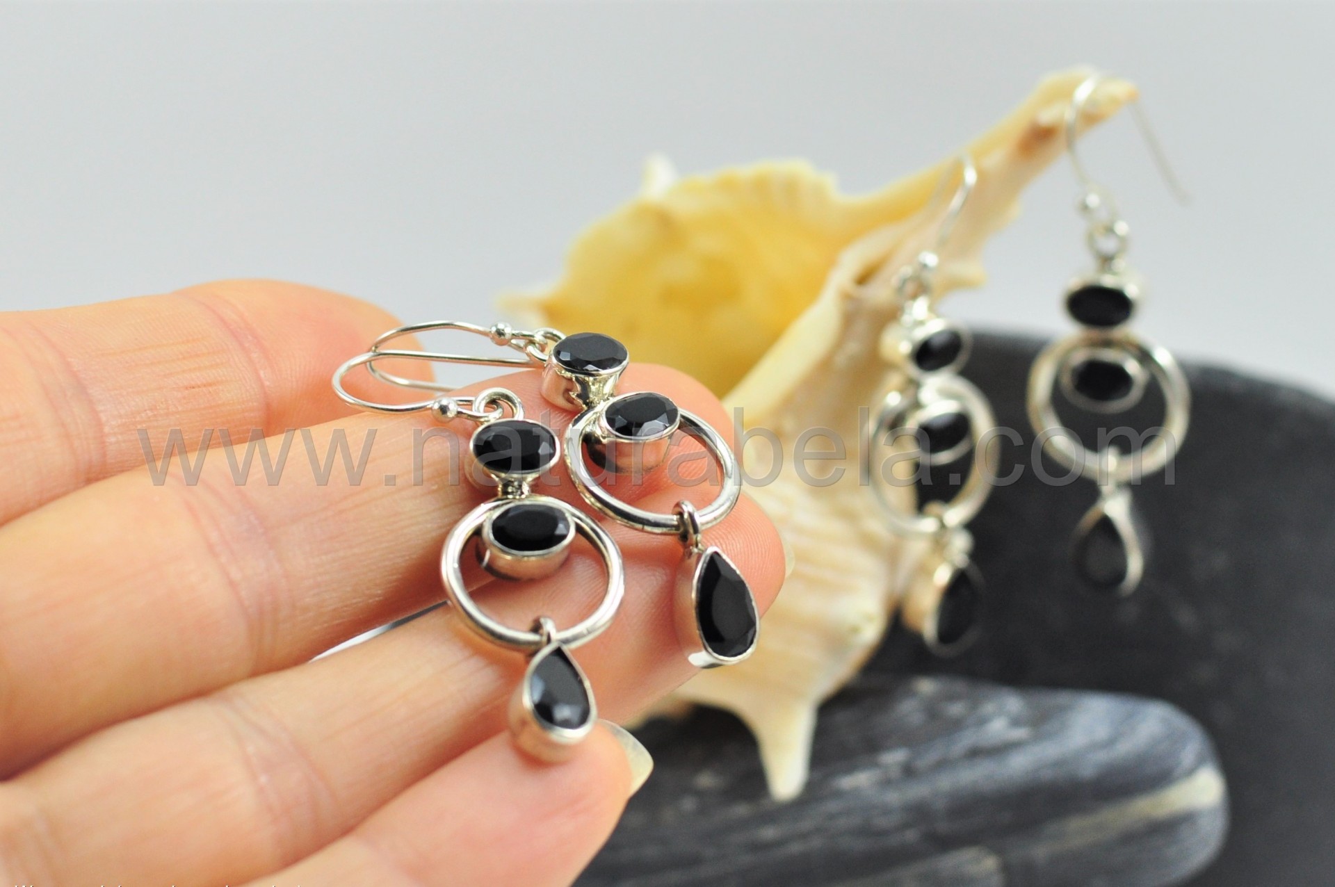 Estes brincos são em prata com pedras naturais facetadas de Ónix. Tem um comprimento desde o gancho de 4,5cm e peso de 8g.