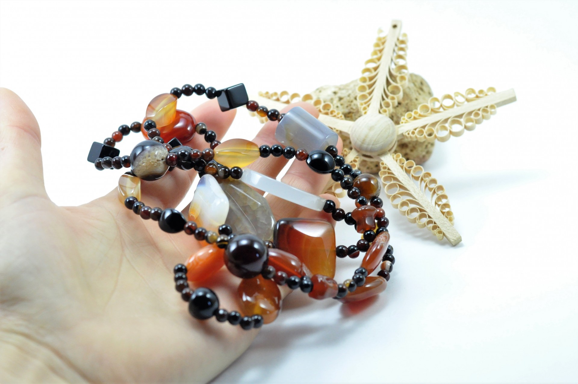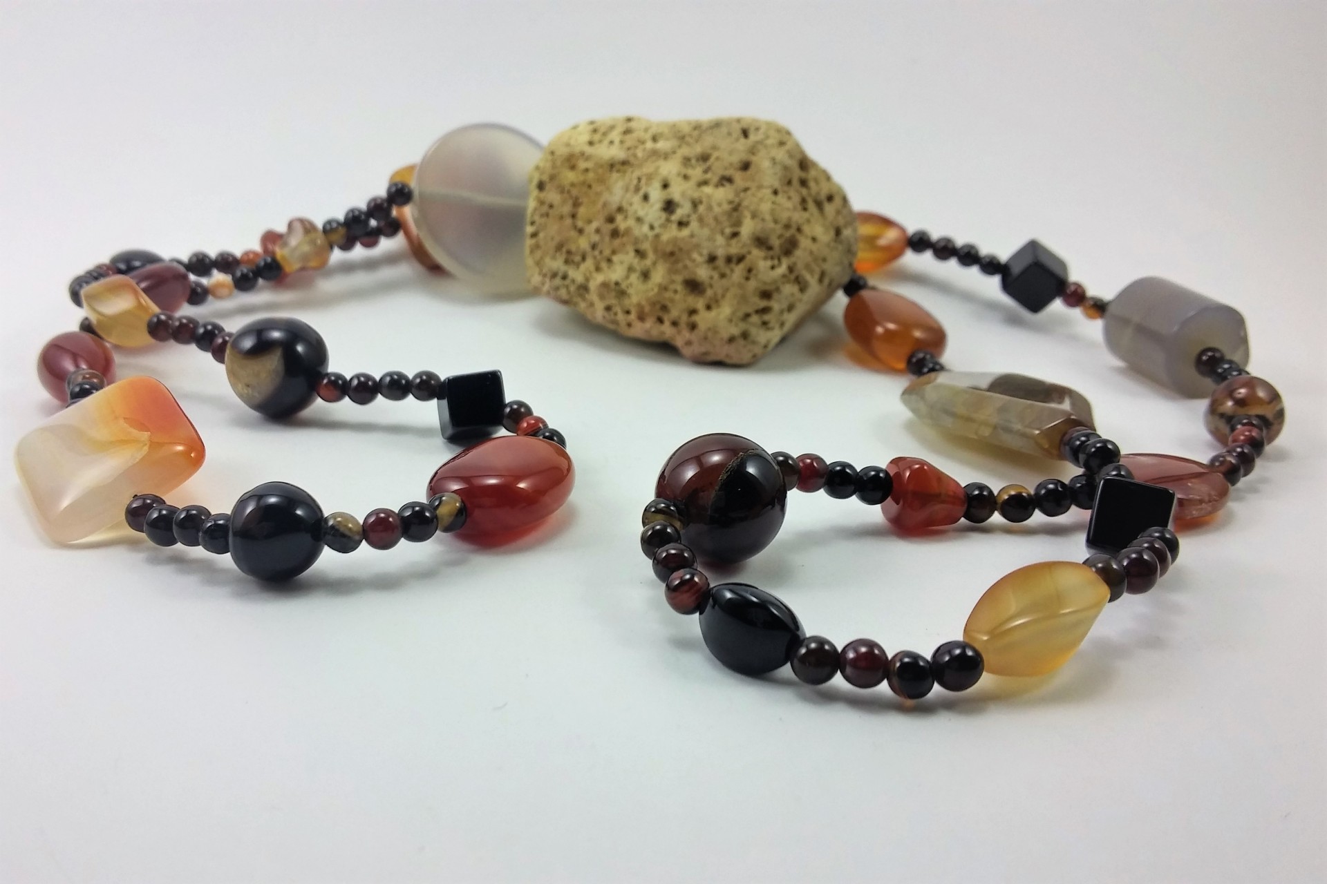 Este Colar artesanal de minerais é constituído por várias contas de Ágata com tonalidades pretas, castanhas, vermelhas e cinzentas. Está elaborado por bolas de 4mm de diâmetro intercaladas com bonitas contas de tamanhos diferentes.