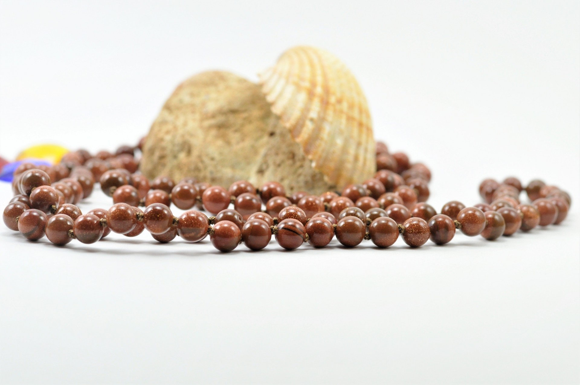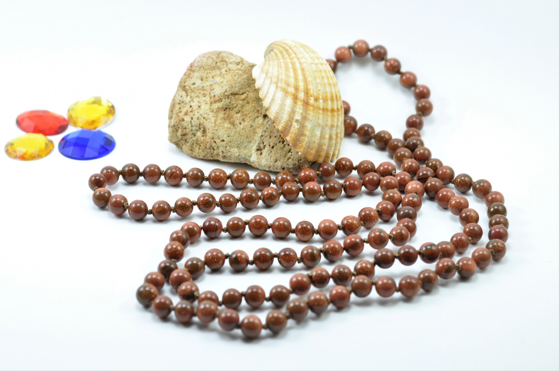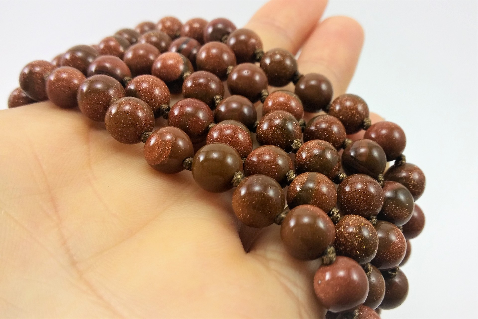 Este Colar clássico é formado por bolas de pedra sol/ouro, onde entre cada bola tem um nó.