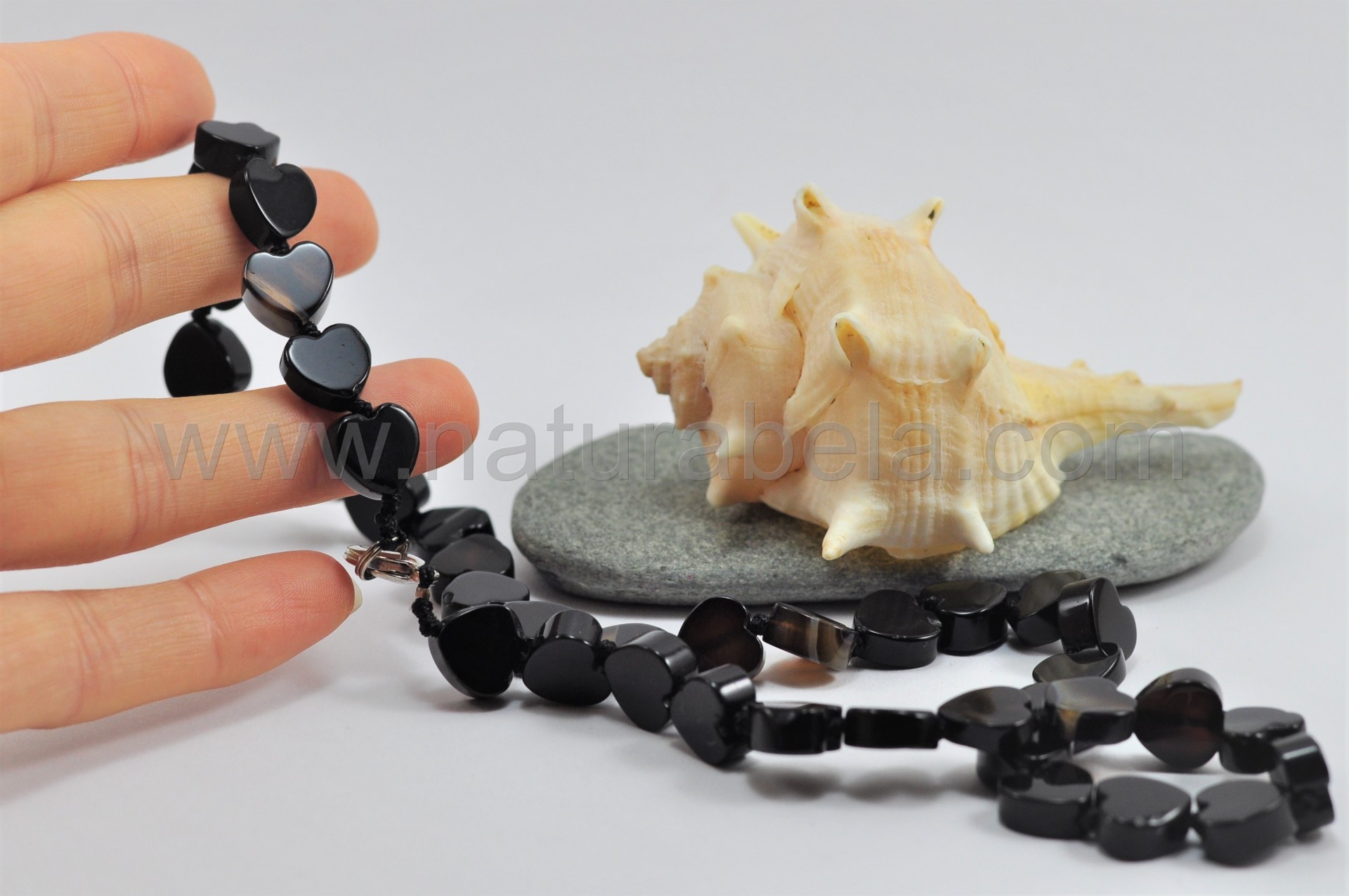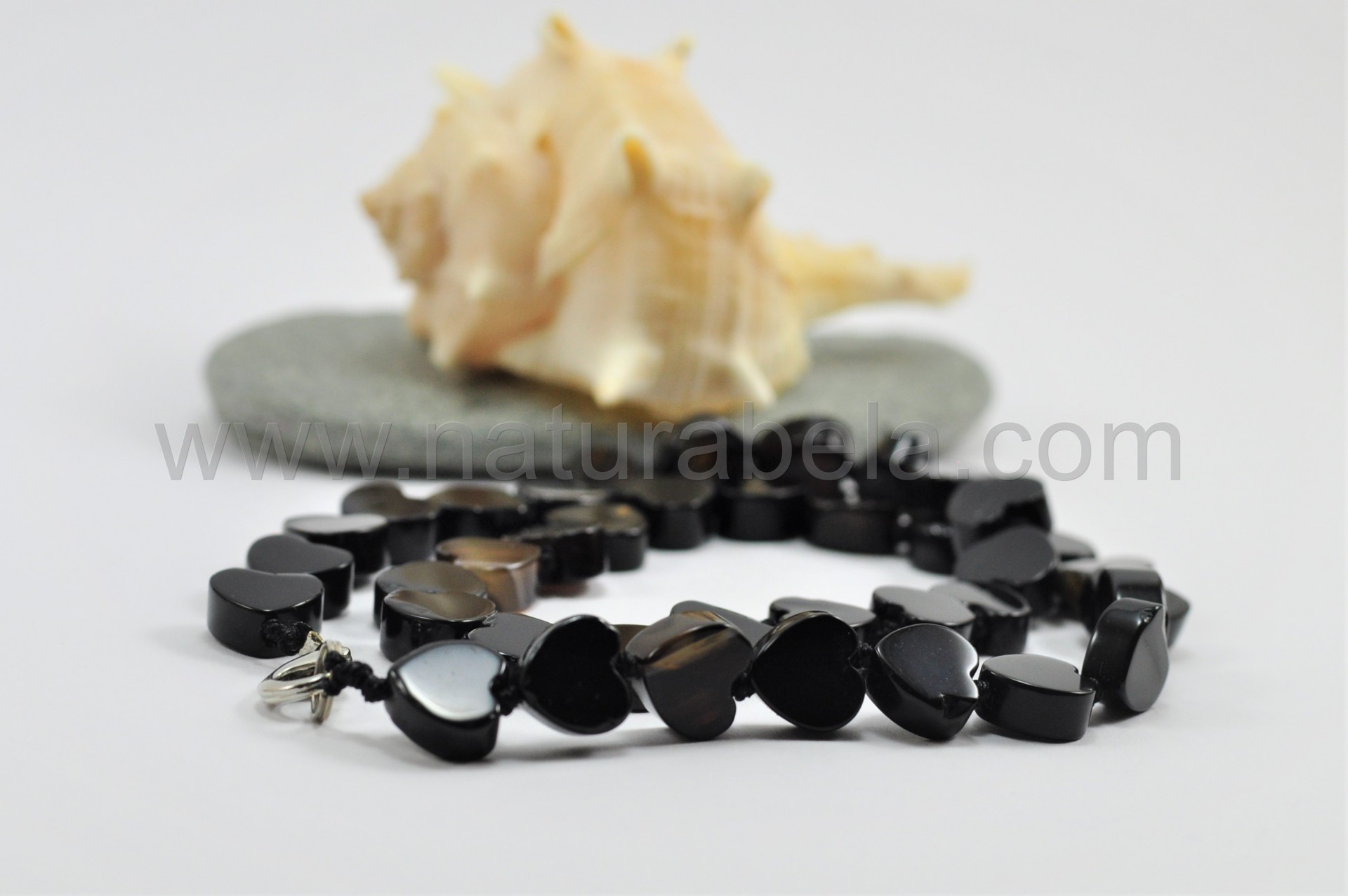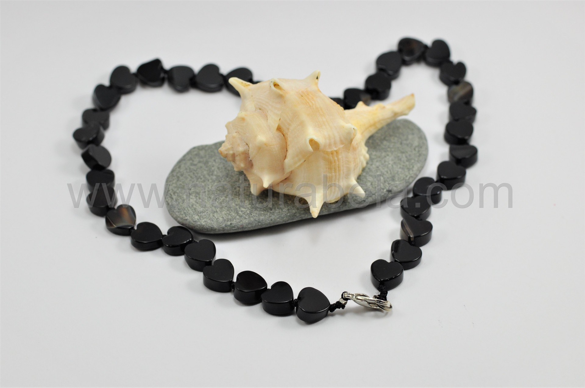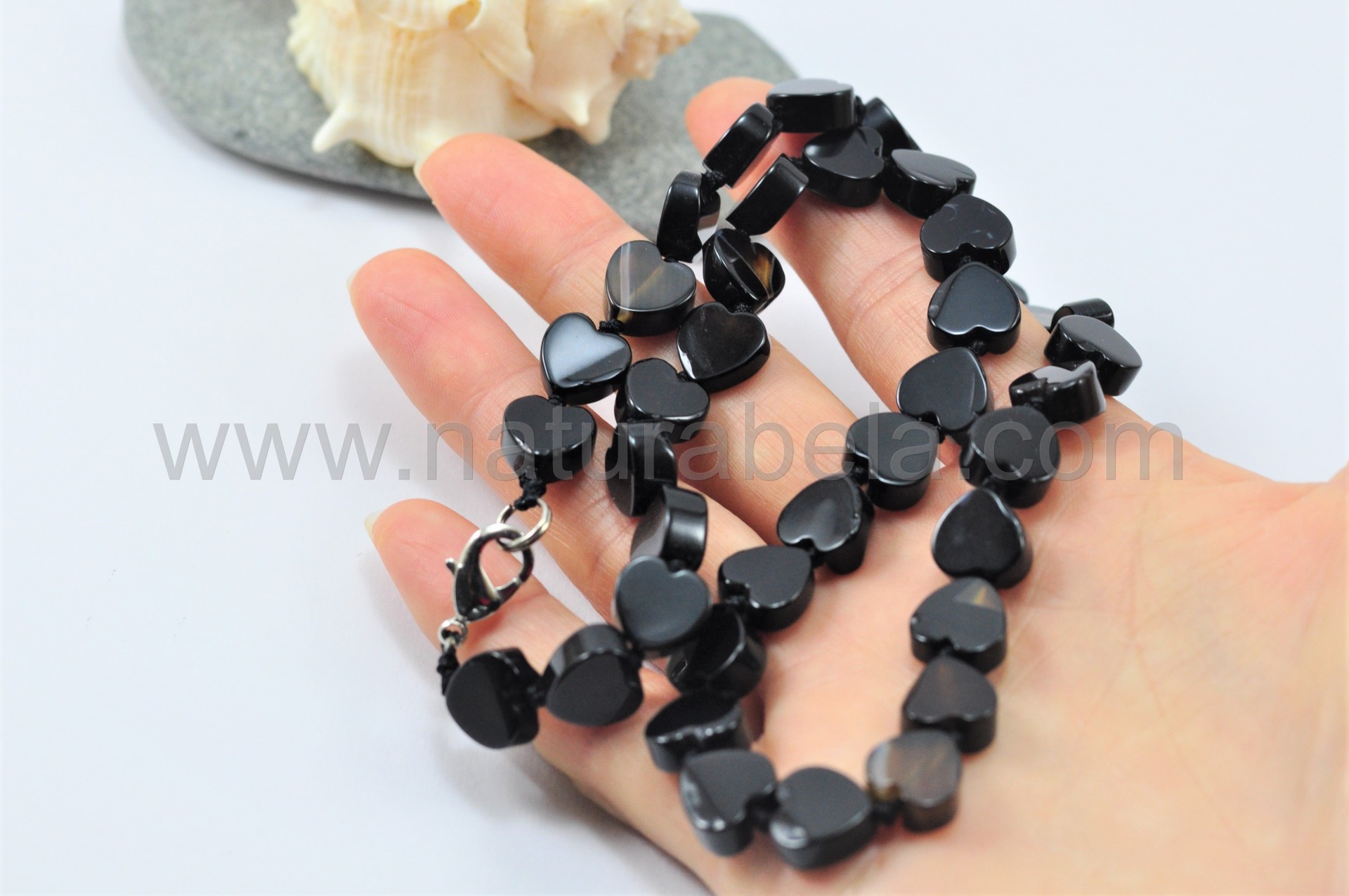 É um delicado modelo de colar composto por pequenos corações talhados em pedra Ágata negra e separados por elegantes nós da mesma cor.