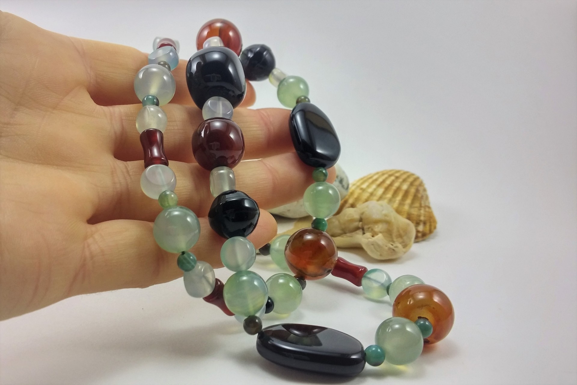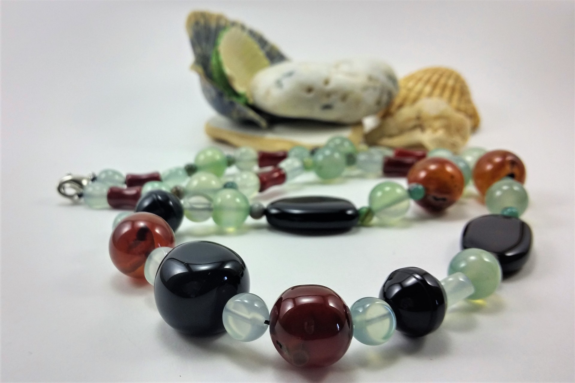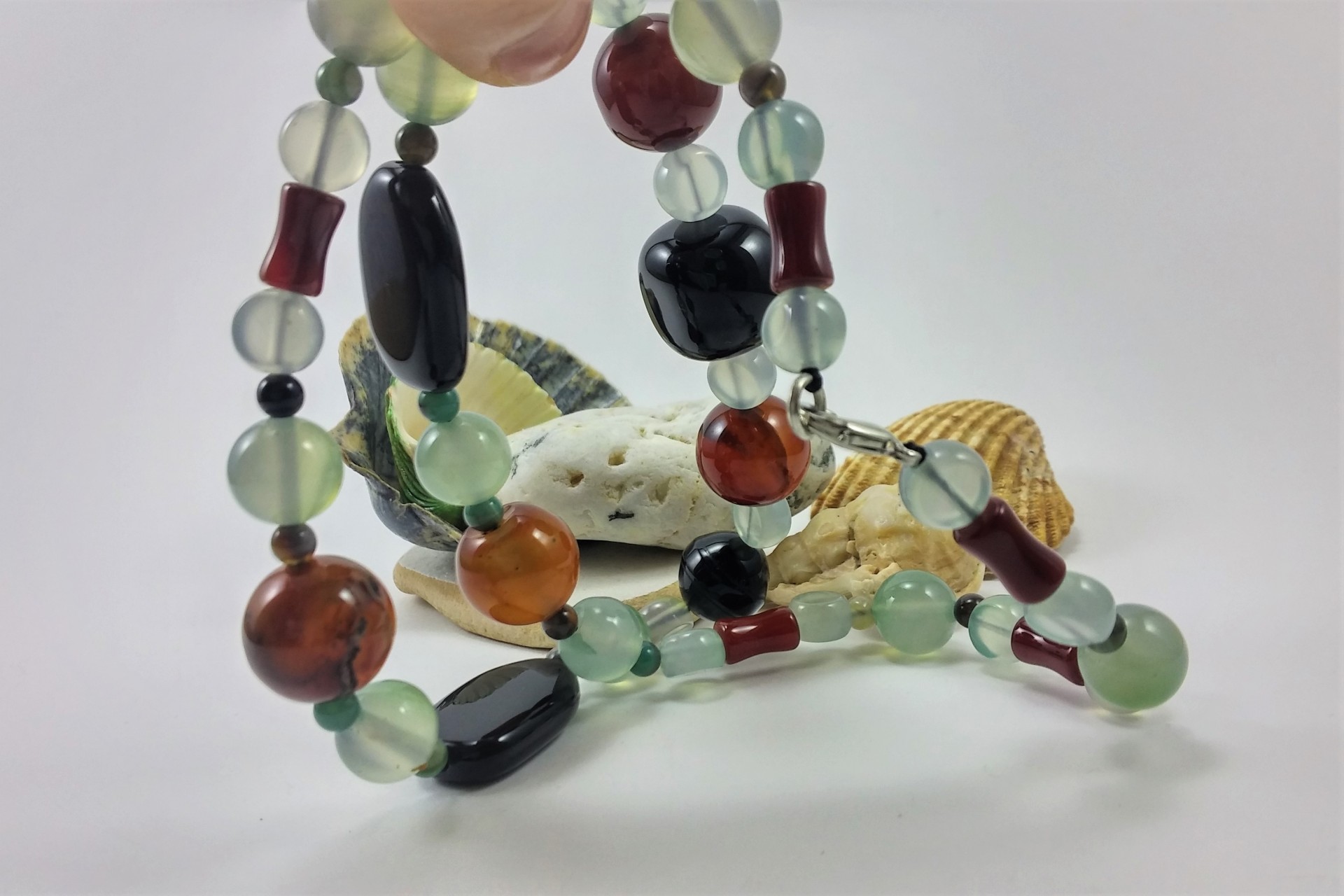 Este lindo Colar é constituído por várias contas de Ágata. Tem uma combinação muito elegante e bonita de, Ágata verde, Ágata negra ou preta e de Cornalina (Ágata vermelha), realizado com contas de diversas formas e tamanhos.