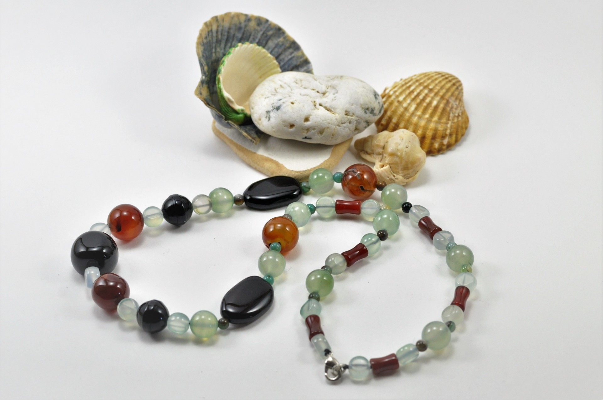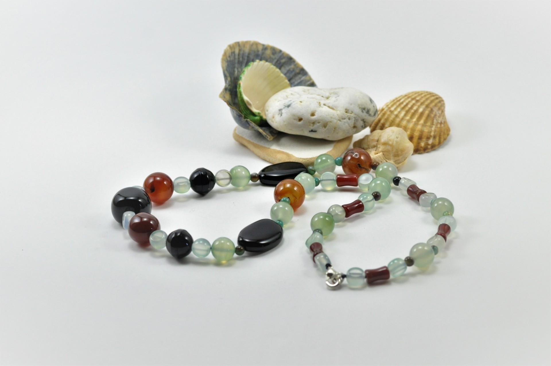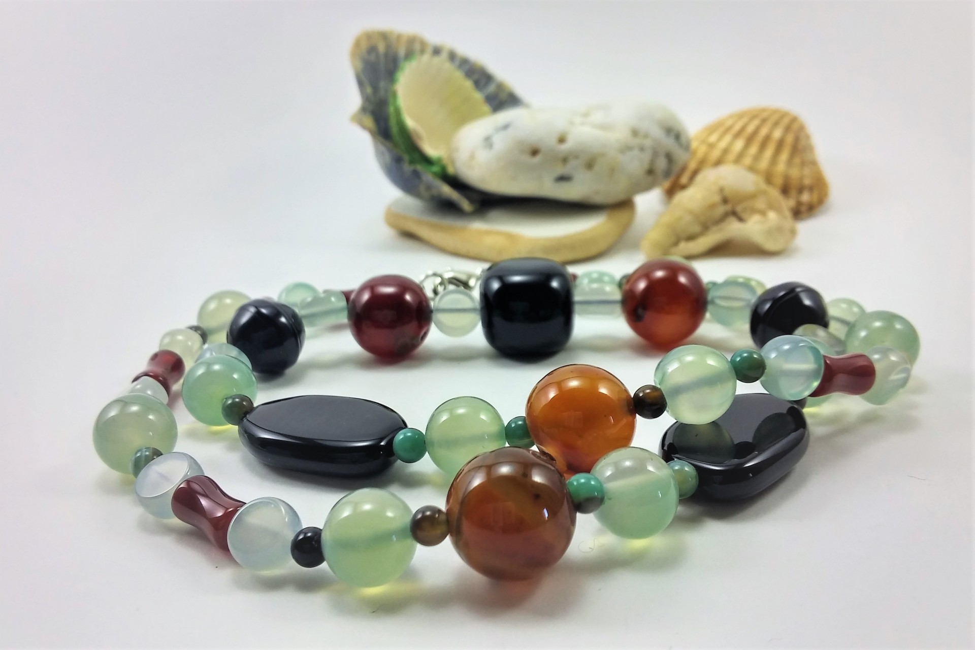 Este lindo Colar é constituído por várias contas de Ágata. Tem uma combinação muito elegante e bonita de, Ágata verde, Ágata negra ou preta e de Cornalina (Ágata vermelha), realizado com contas de diversas formas e tamanhos.