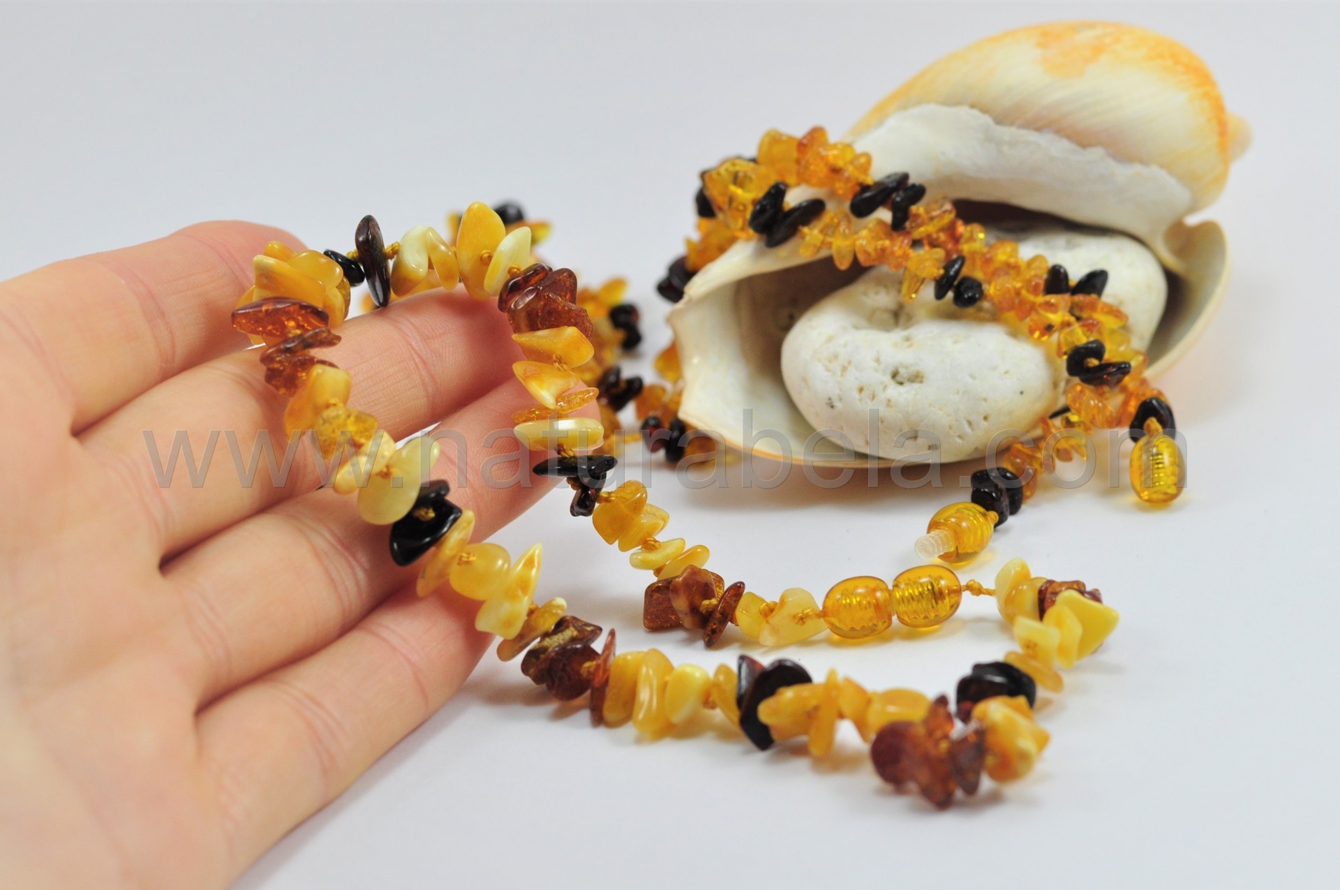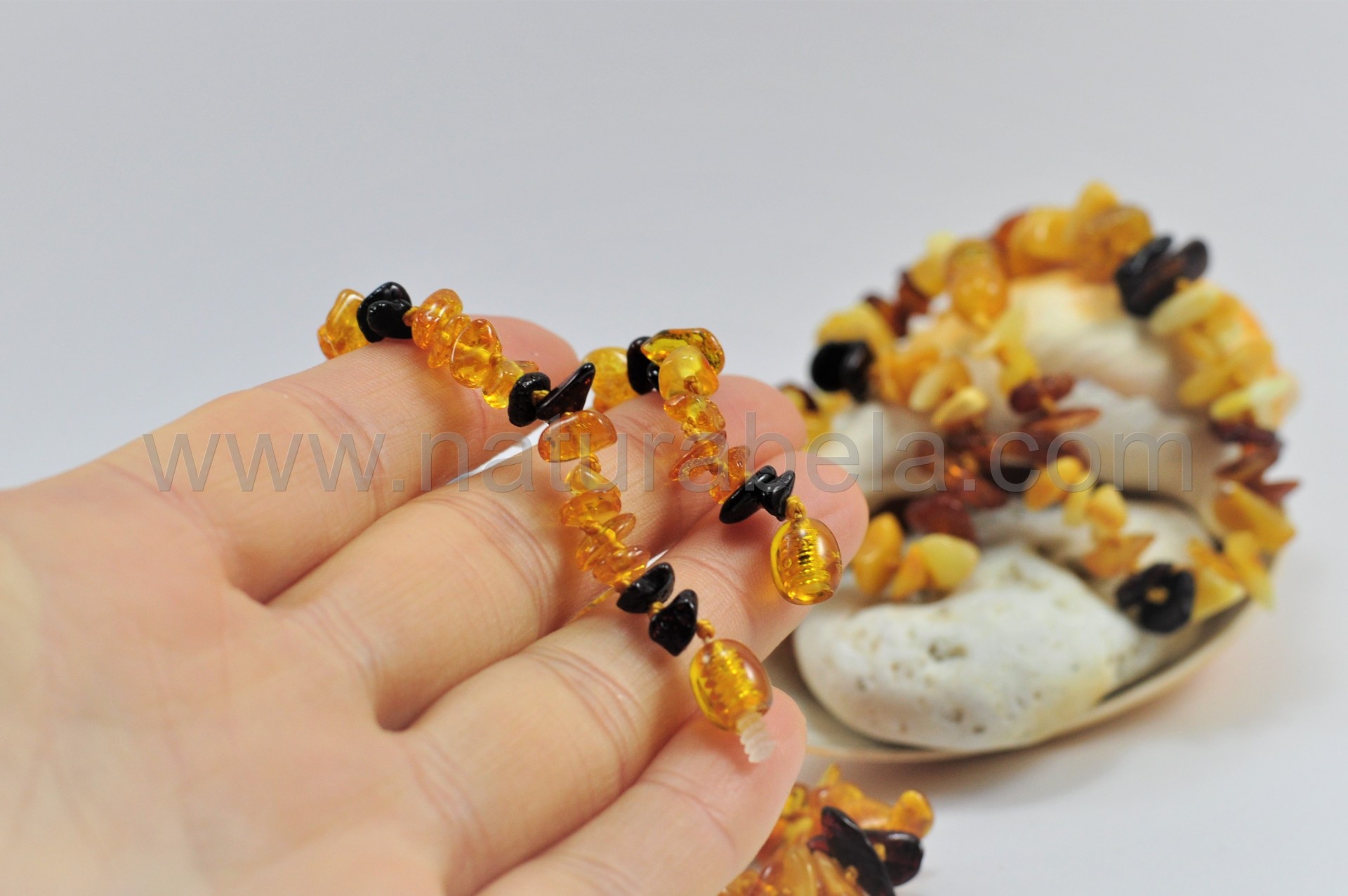 Este colar é realizado em Âmbar e é destinada para crianças mais pequenas. Entre cada pedra chip de âmbar tem um nó para caso rebente o colar as peças não se soltarem. Mas atenção, como é para crianças pequenas deve-se ter muita atenção para elas não colocarem as peças na boca ou nariz e se engasgarem. Dizem que não deve ser usado por crianças até aos 3 anos. E quando a criança for dormir deve-se retirar o colar á criança.