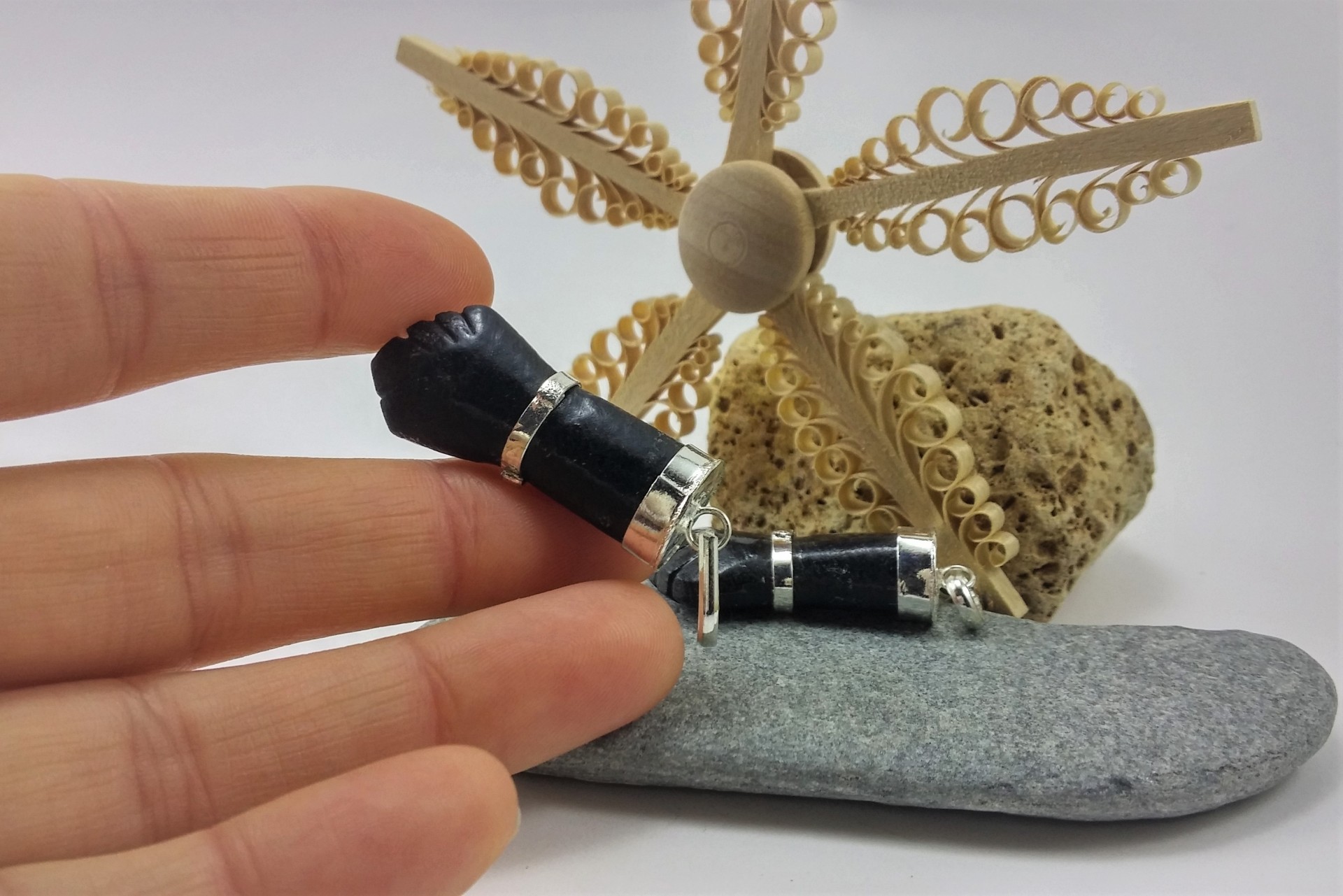O tamanho médio deste pendente é de 2 a 3 cm de comprimento X 1 cm de largura. O peso varia entre 6 a 10g (tudo depende do tamanho).