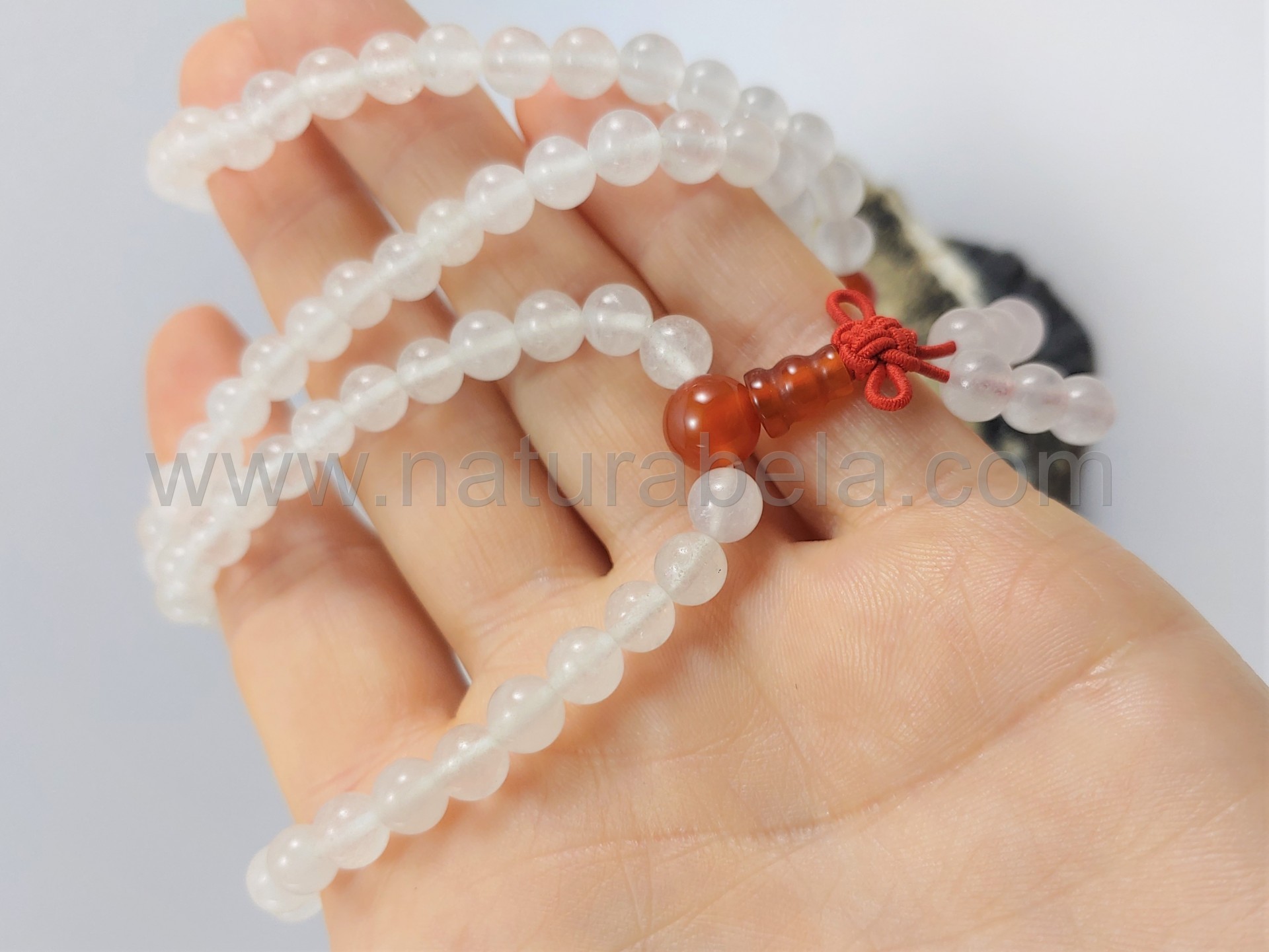 Japamala artesanal elástico com 108 contas de 6mm de Jade branco em Pedra natural. Pode ser colocado a fazer de pulseira pois é elástico.