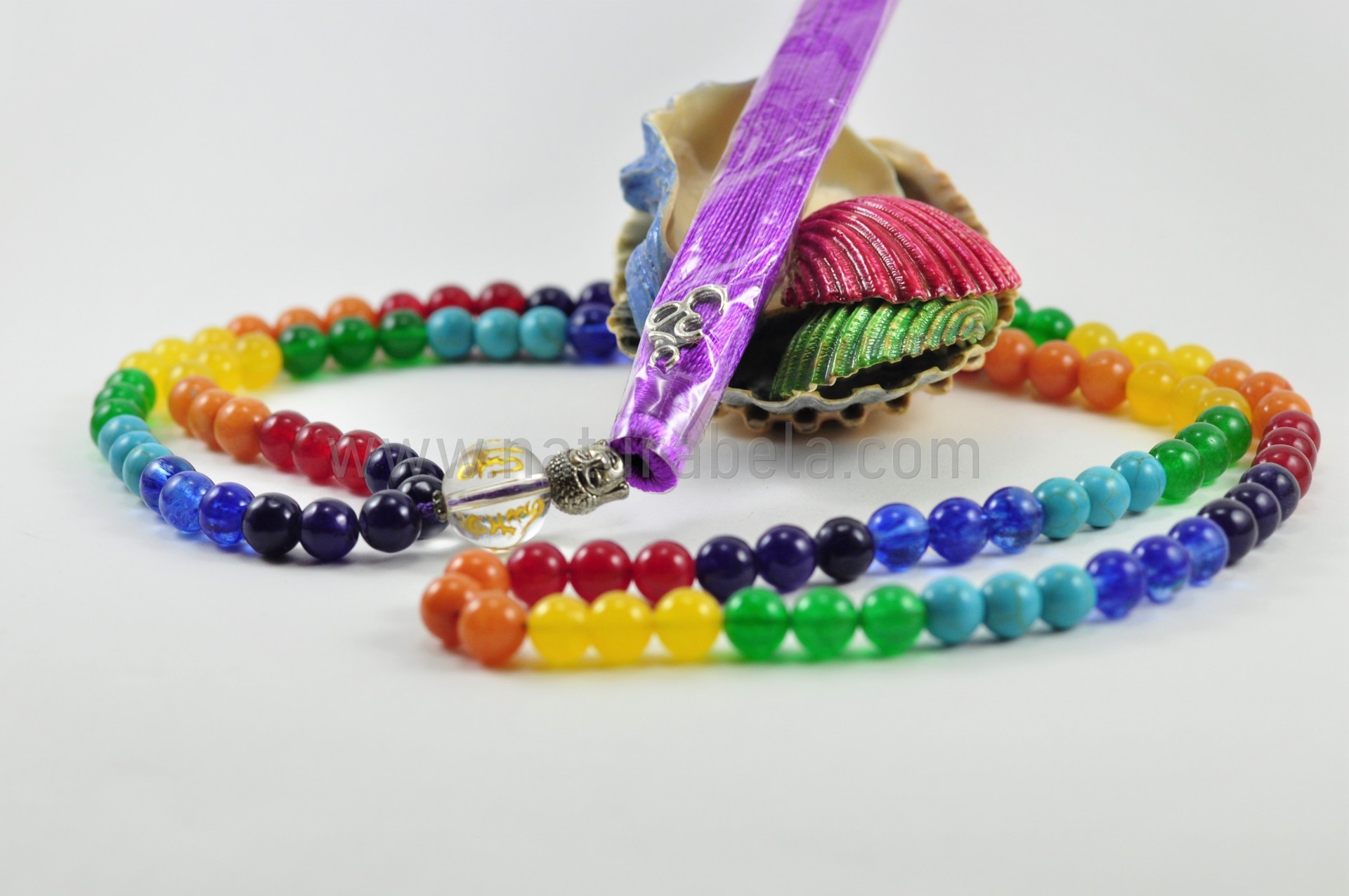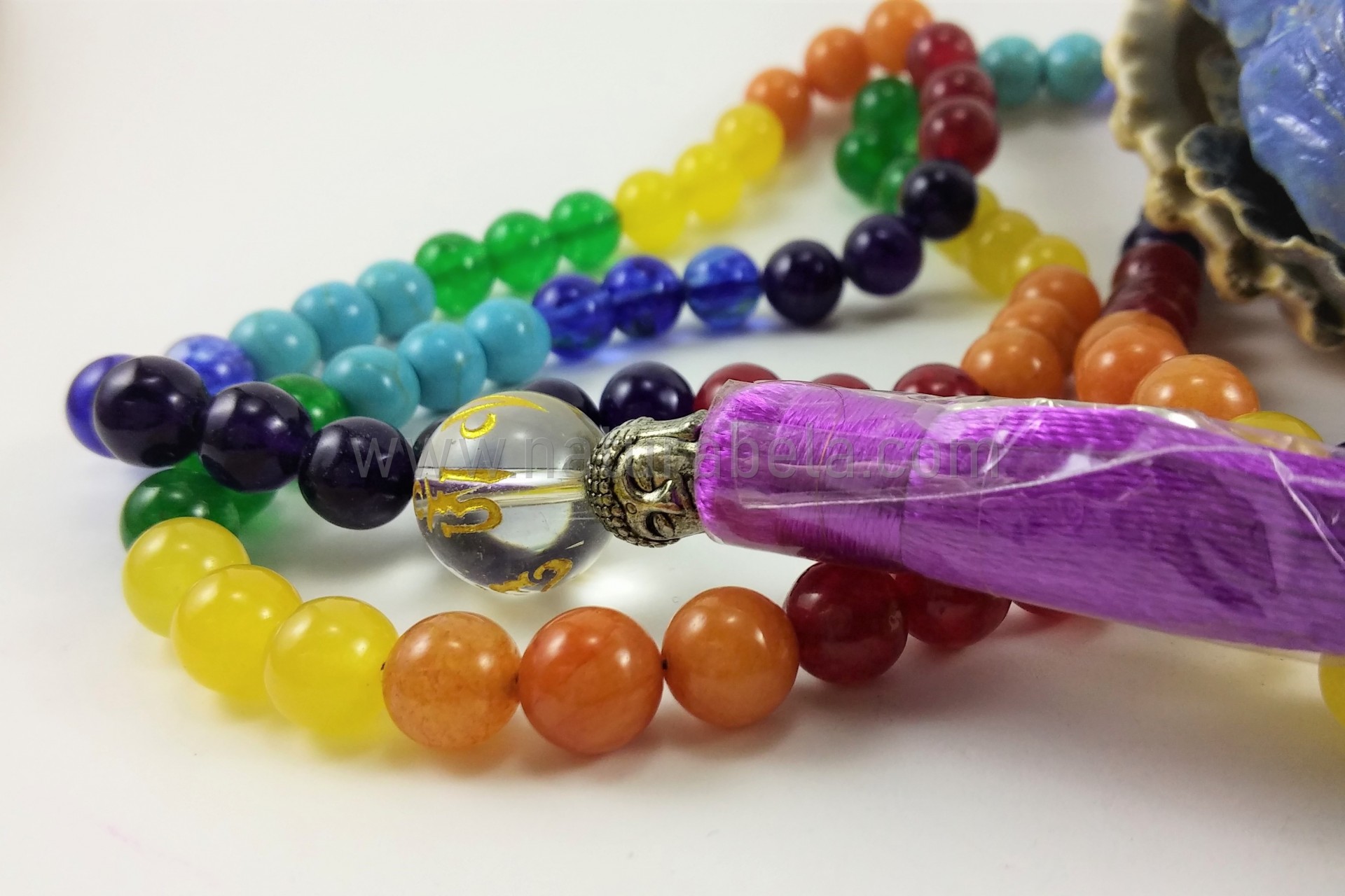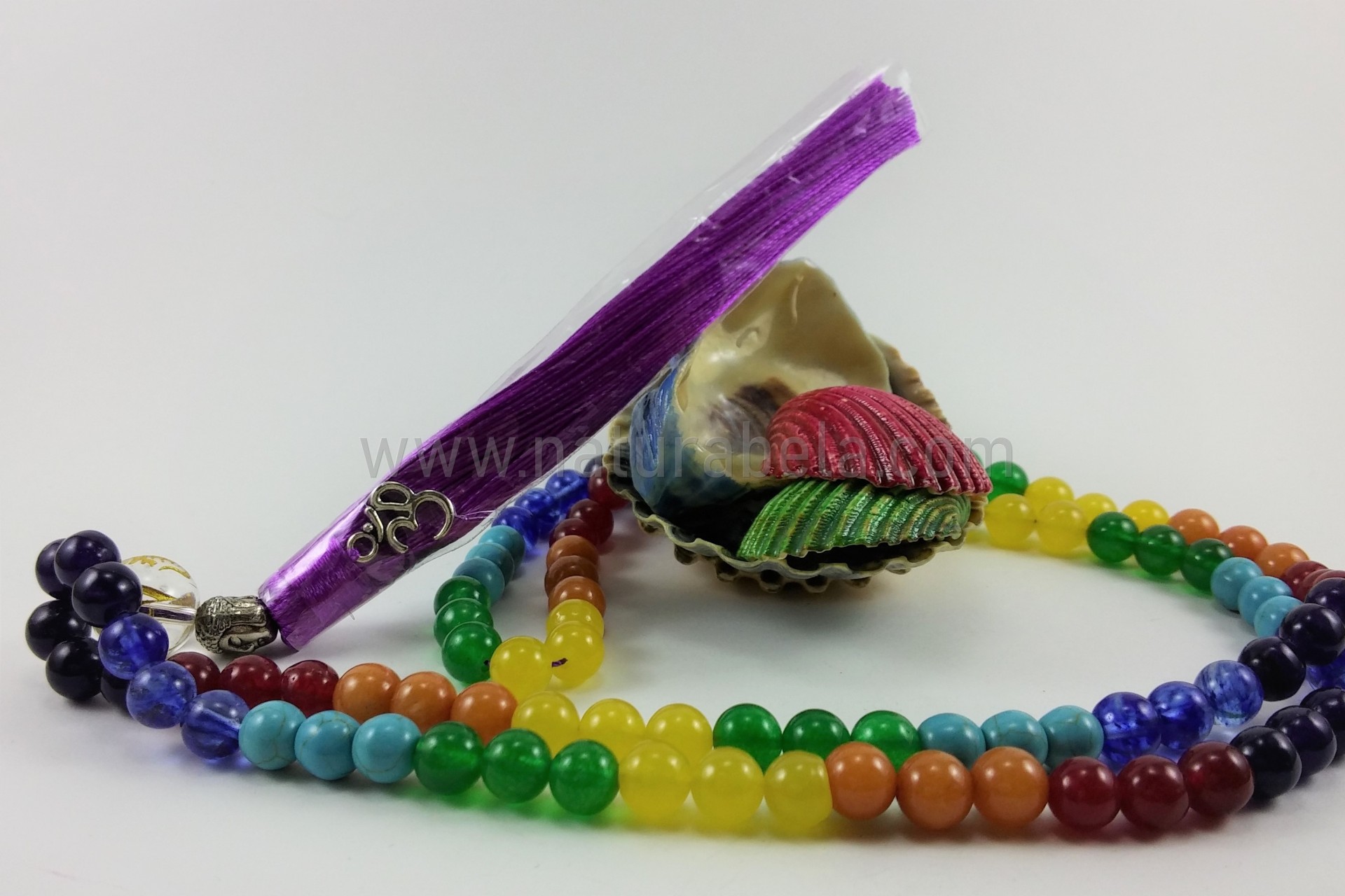 Japamala construído por pedras naturais com as cores que correspondem aos 7 Chakras. Possuí uma conta com o Mantra OM MANI PADME HUM, uma conta com a forma da cabeça de Buda, e ainda o símbolo OM.