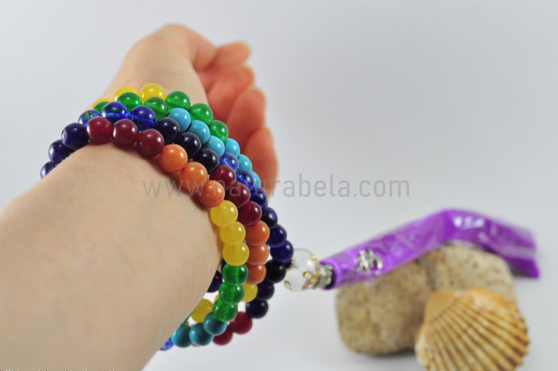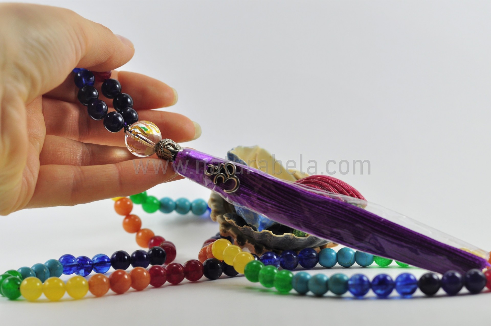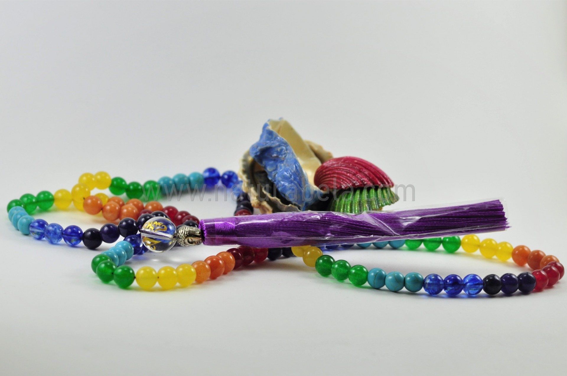 Japamala construído por pedras naturais com as cores que correspondem aos 7 Chakras. Possuí uma conta com o Mantra OM MANI PADME HUM, uma conta com a forma da cabeça de Buda, e ainda o símbolo OM.