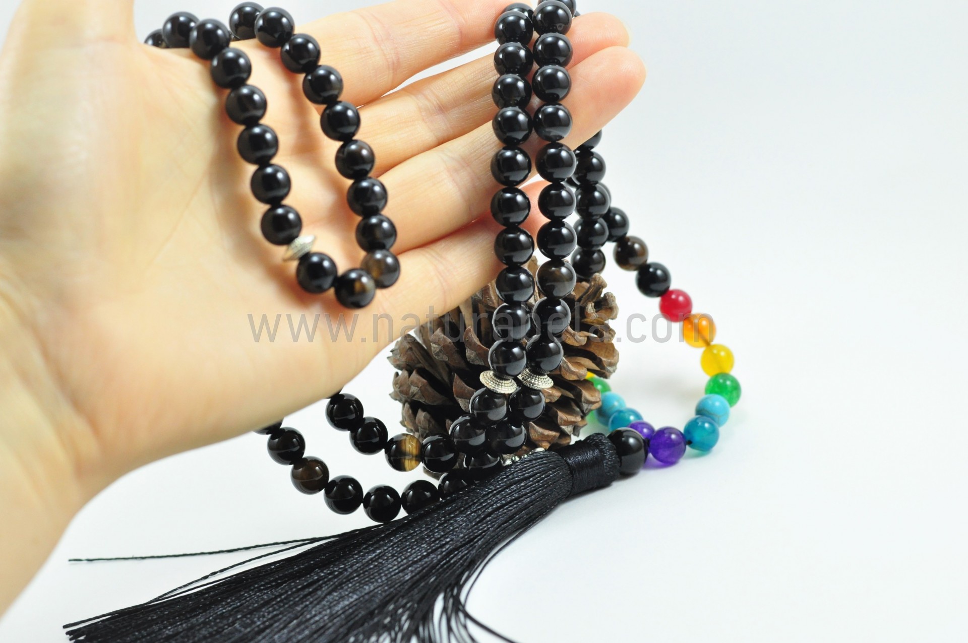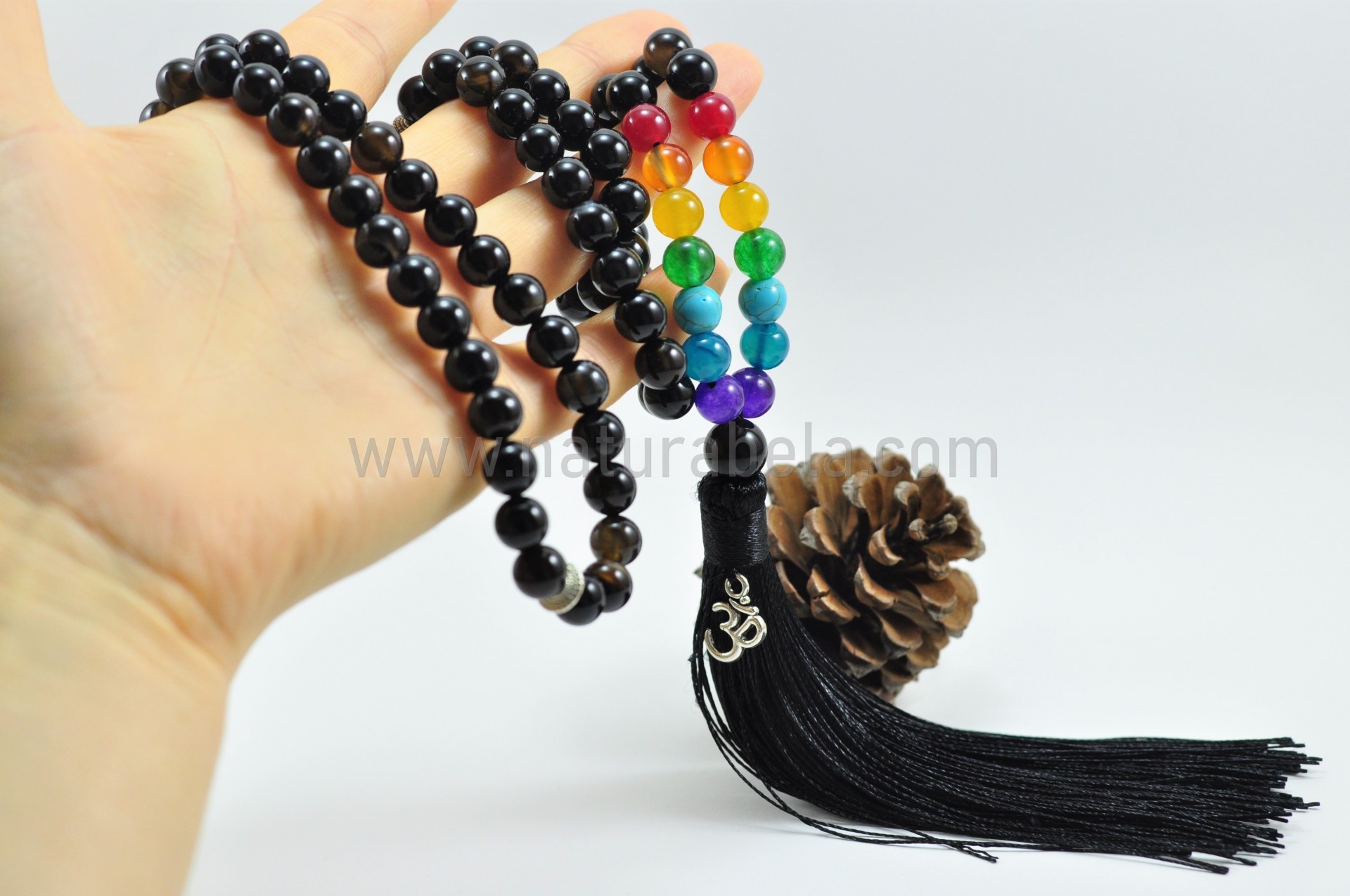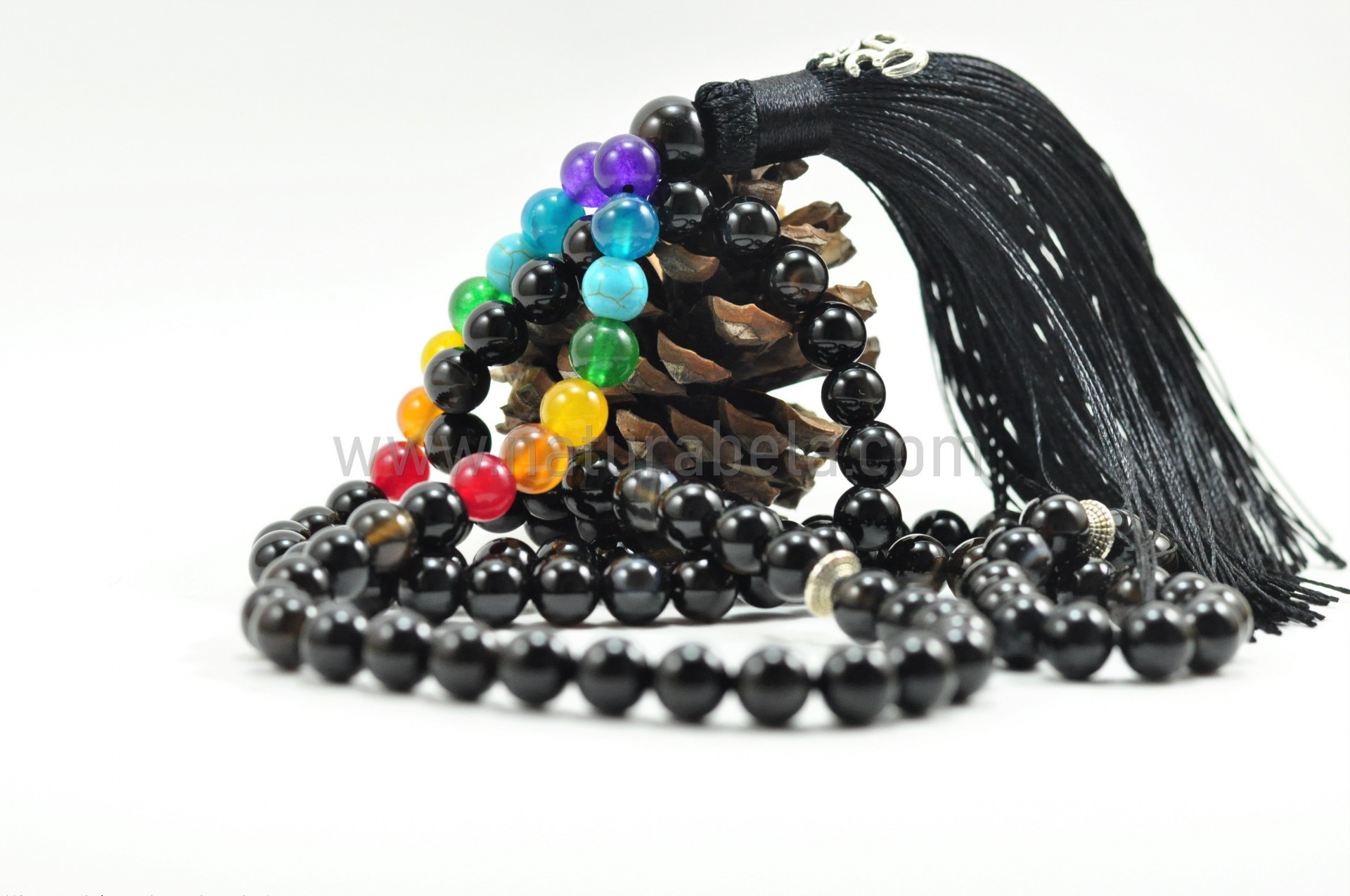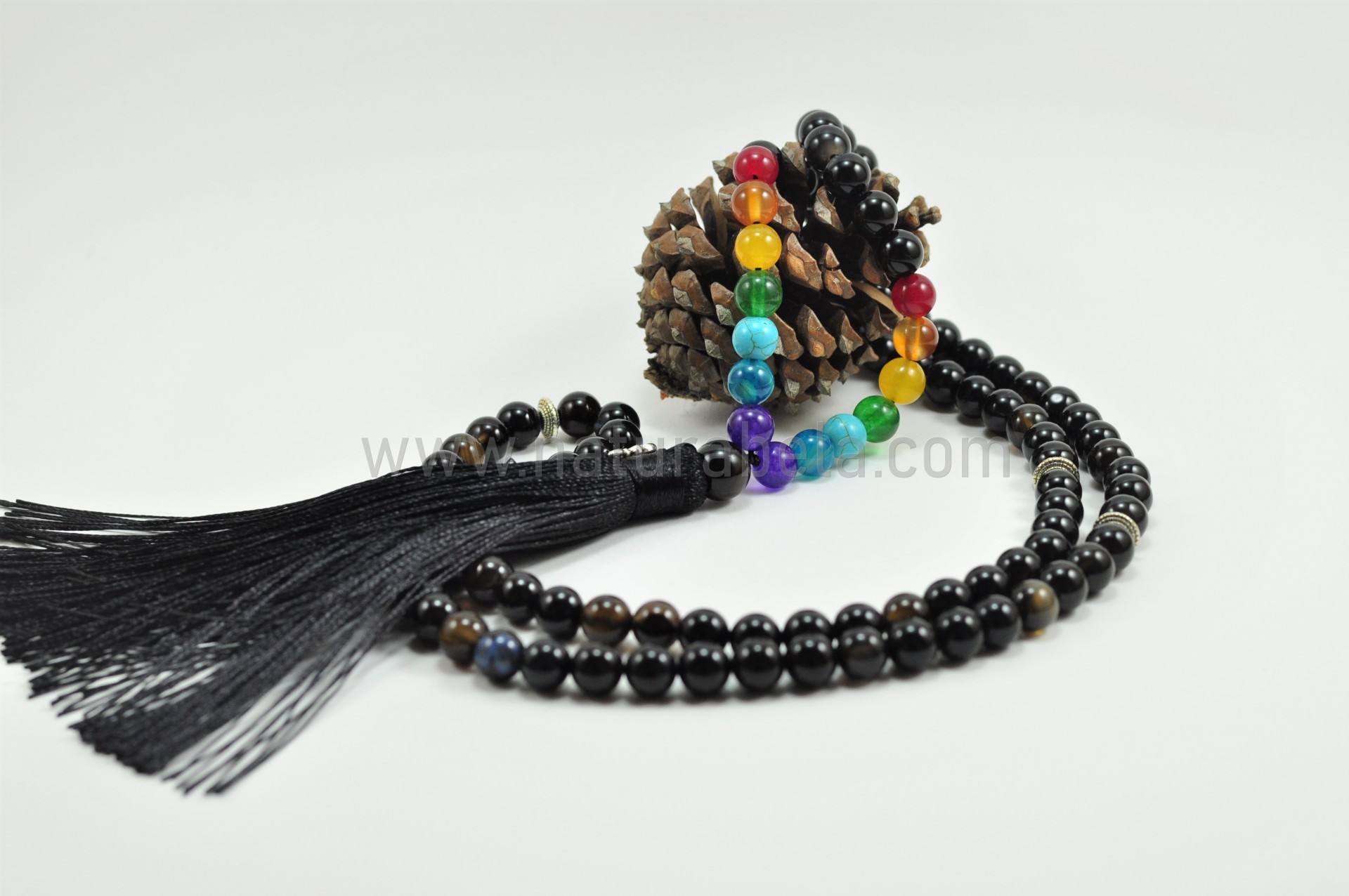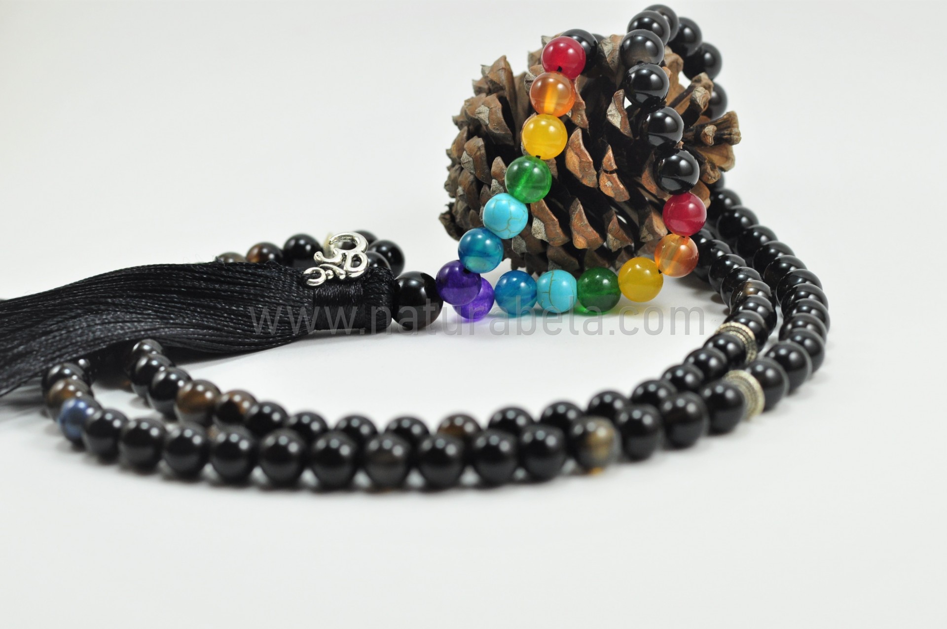JapaMala de Ágata negra com bolas de 8 mm e 7 Chakras