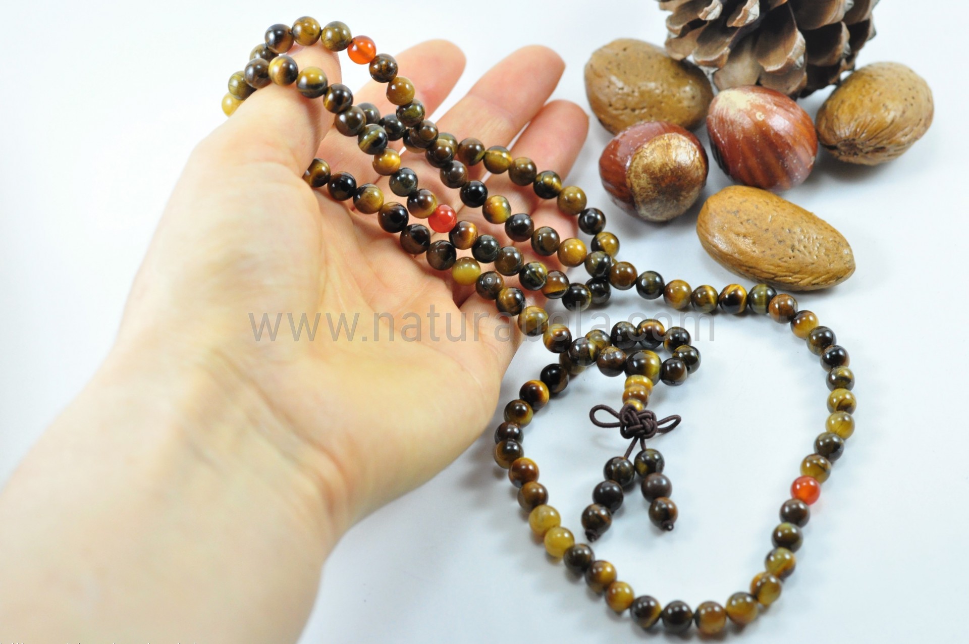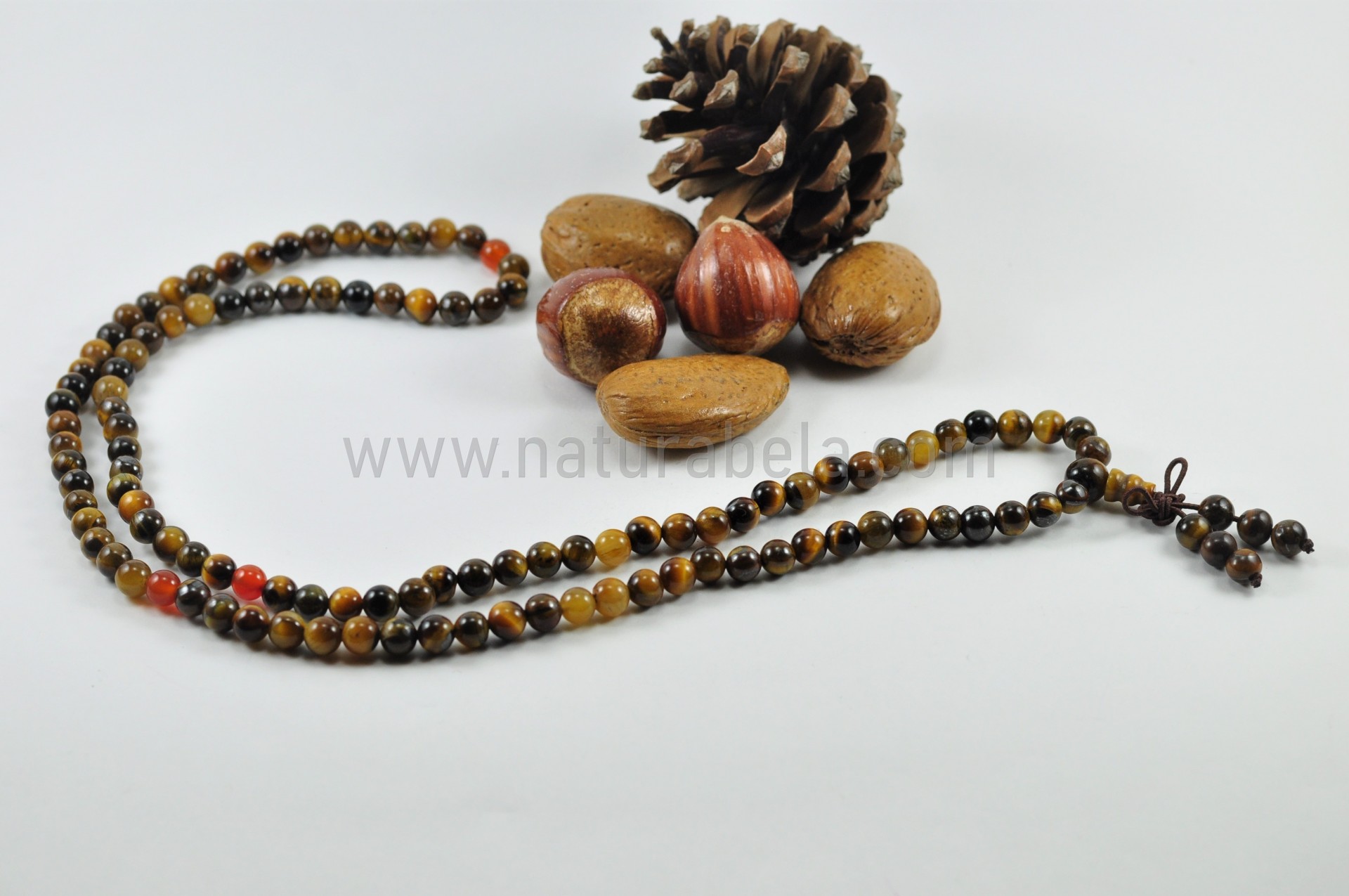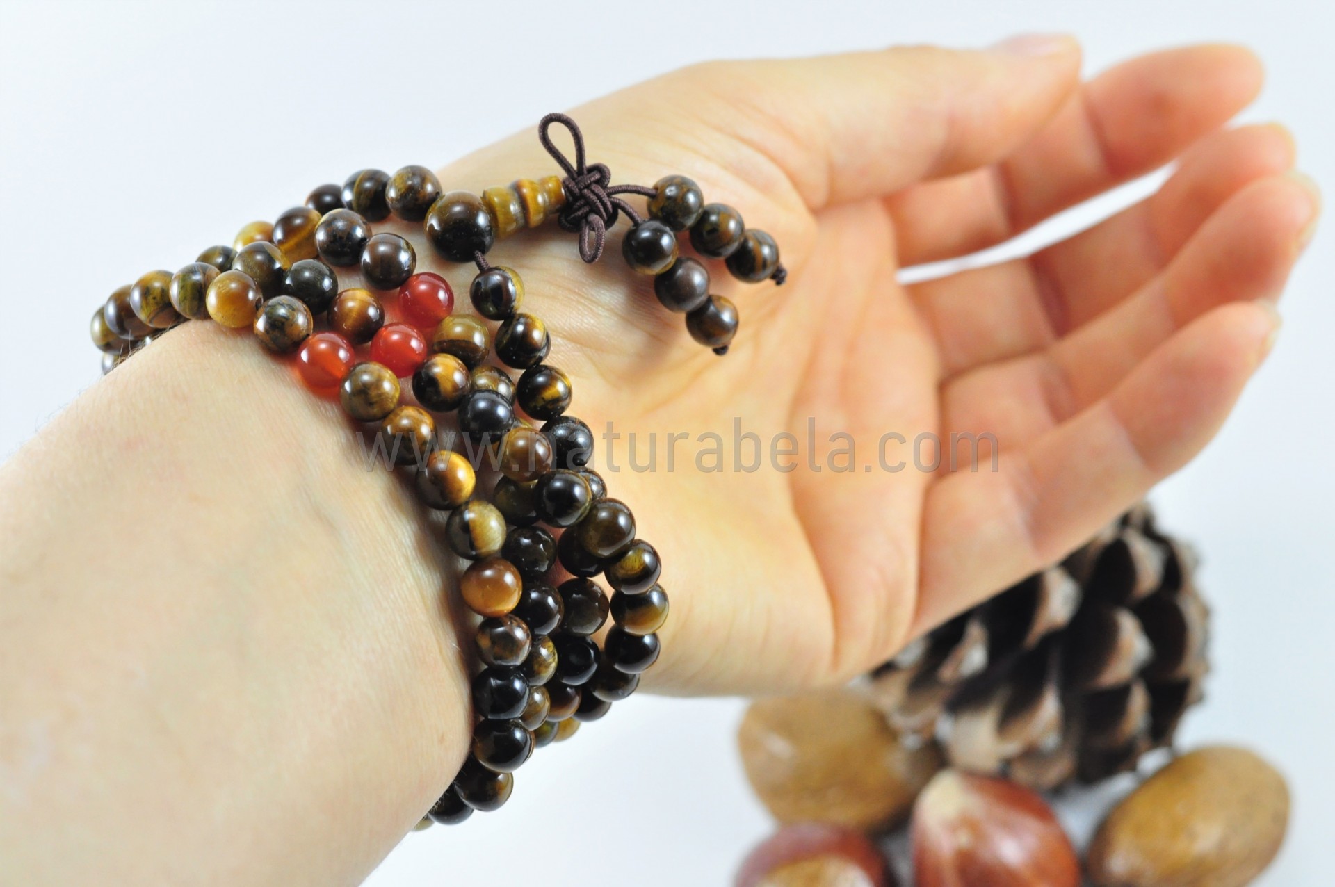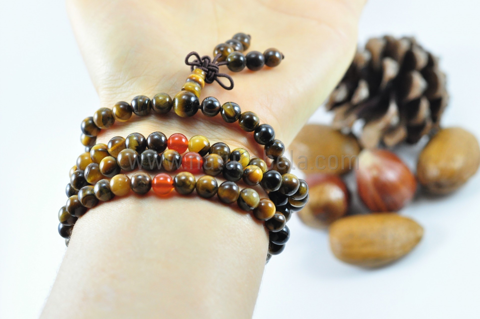 Japamala artesanal elástico com 108 contas de 6,5mm e 1 de 8mm, em Pedra Olho-de-Tigre e carneola (ou cornalina).