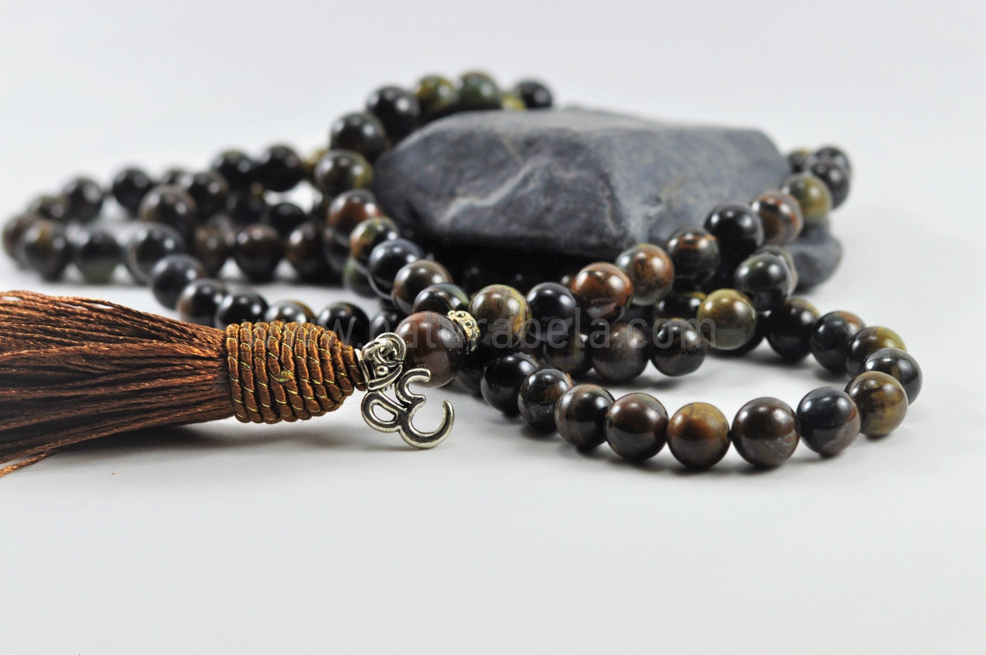 Japamala artesanal com 108 contas de 8mm e uma de 10mm, em Pedra natural de Olho-de-Falcão e simbolo OM.