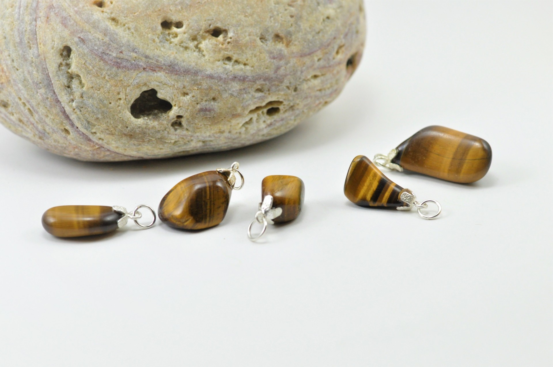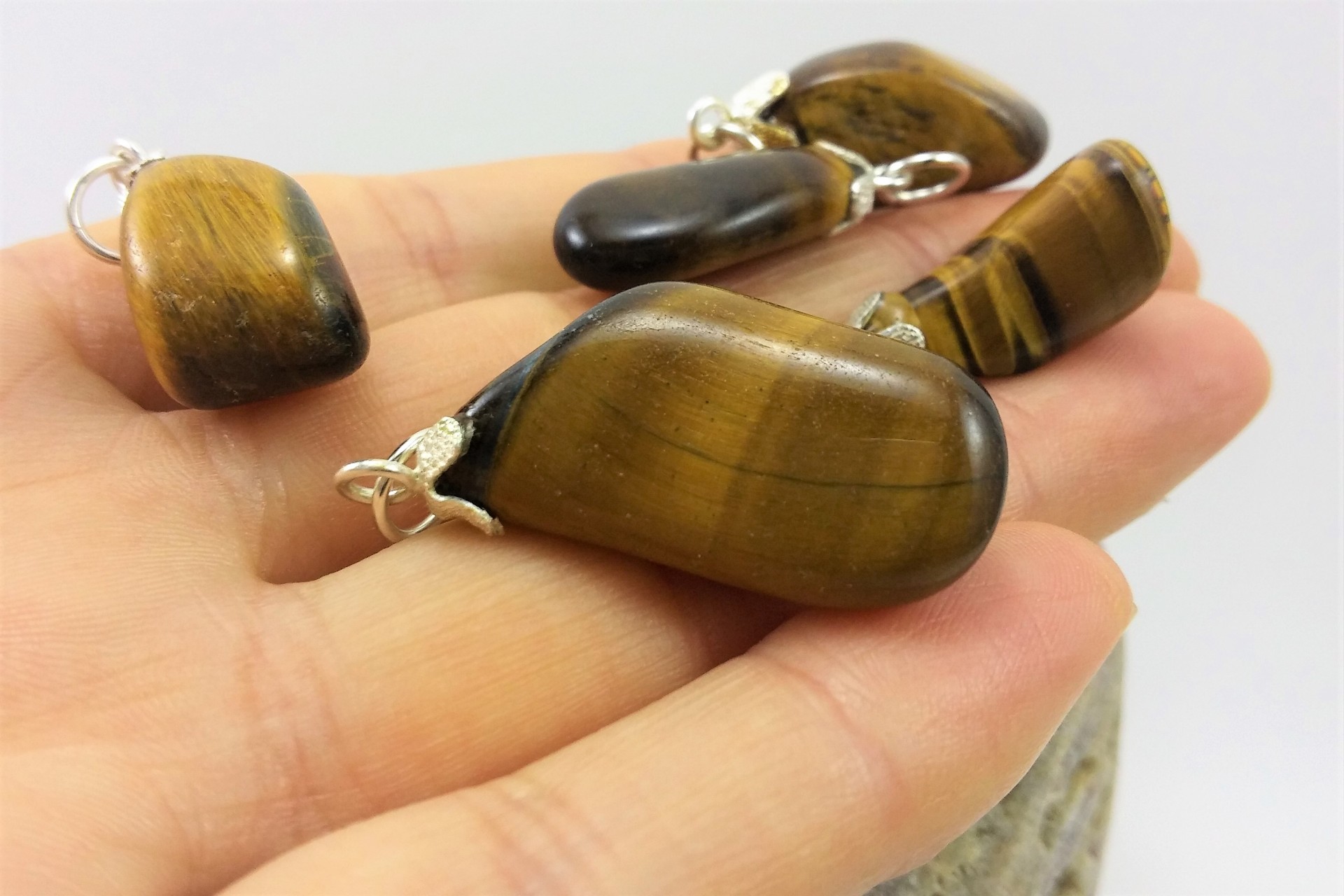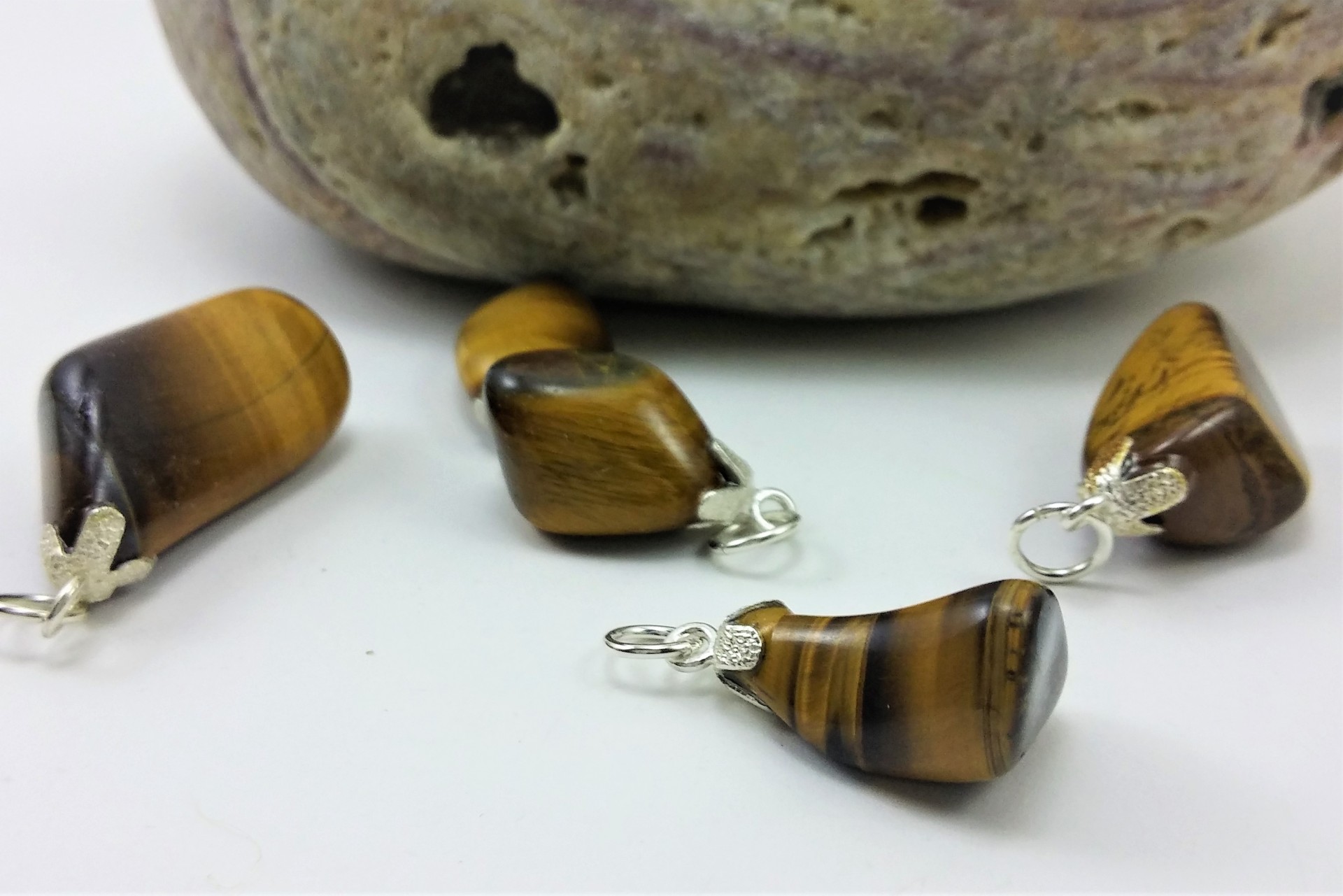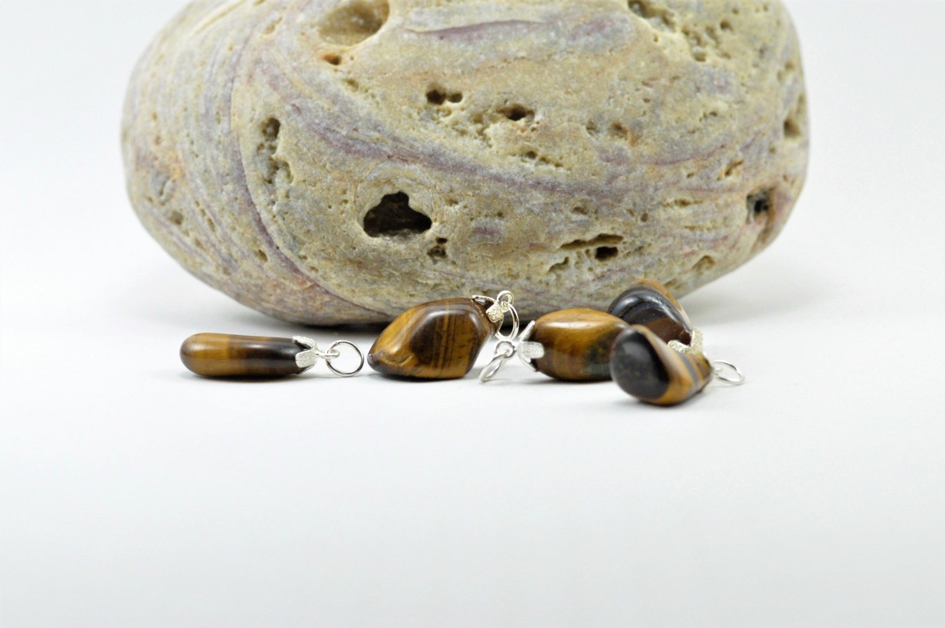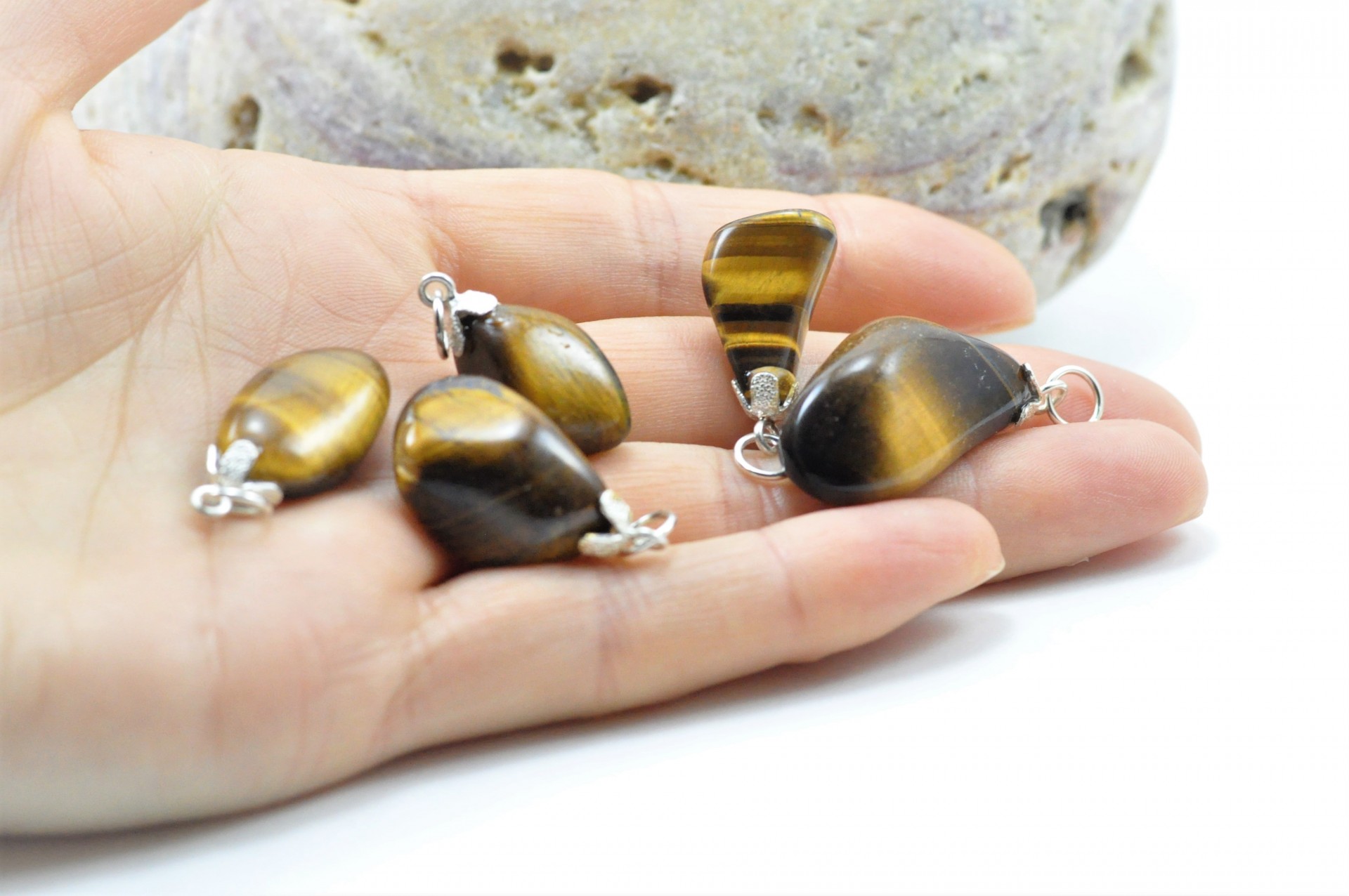 Olho de tigre - Como propriedades terapêuticas, a pedra olho de tigre, ajuda a afastar sentimentos de medo, transmitindo ao indivíduo coragem para enfrentar situações pelas quais teme; facilita a espontaneidade e a superar a timidez. Neste sentido, ajuda a superar bloqueios, promovendo o bem-estar, a auto-confiança e a harmonia. Equilibra as emoções, ajuda a obter harmonia na vida conjugal e familiar.