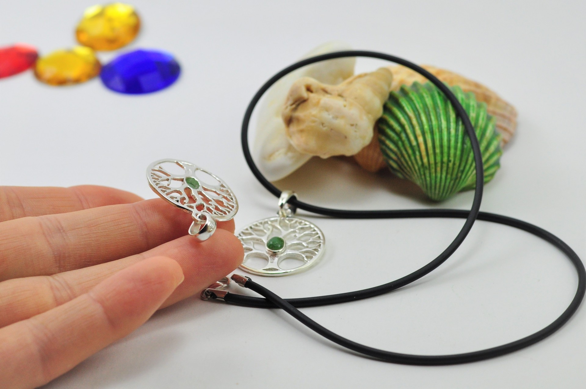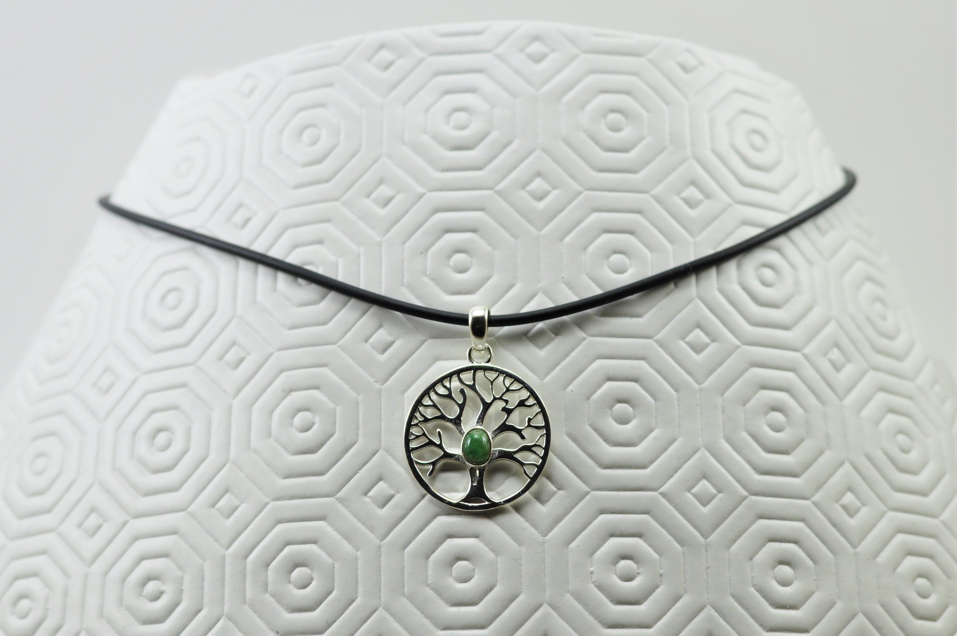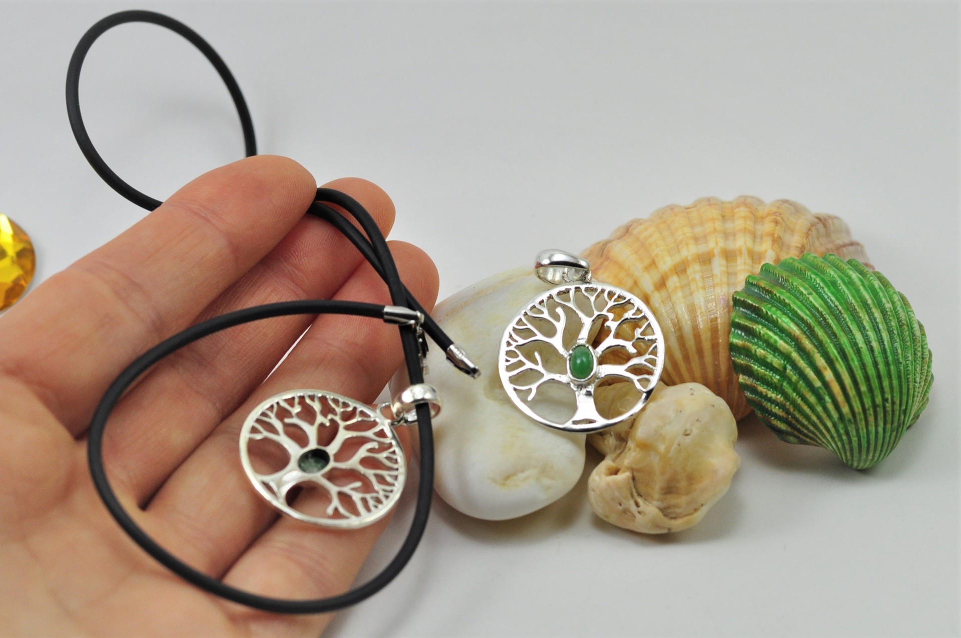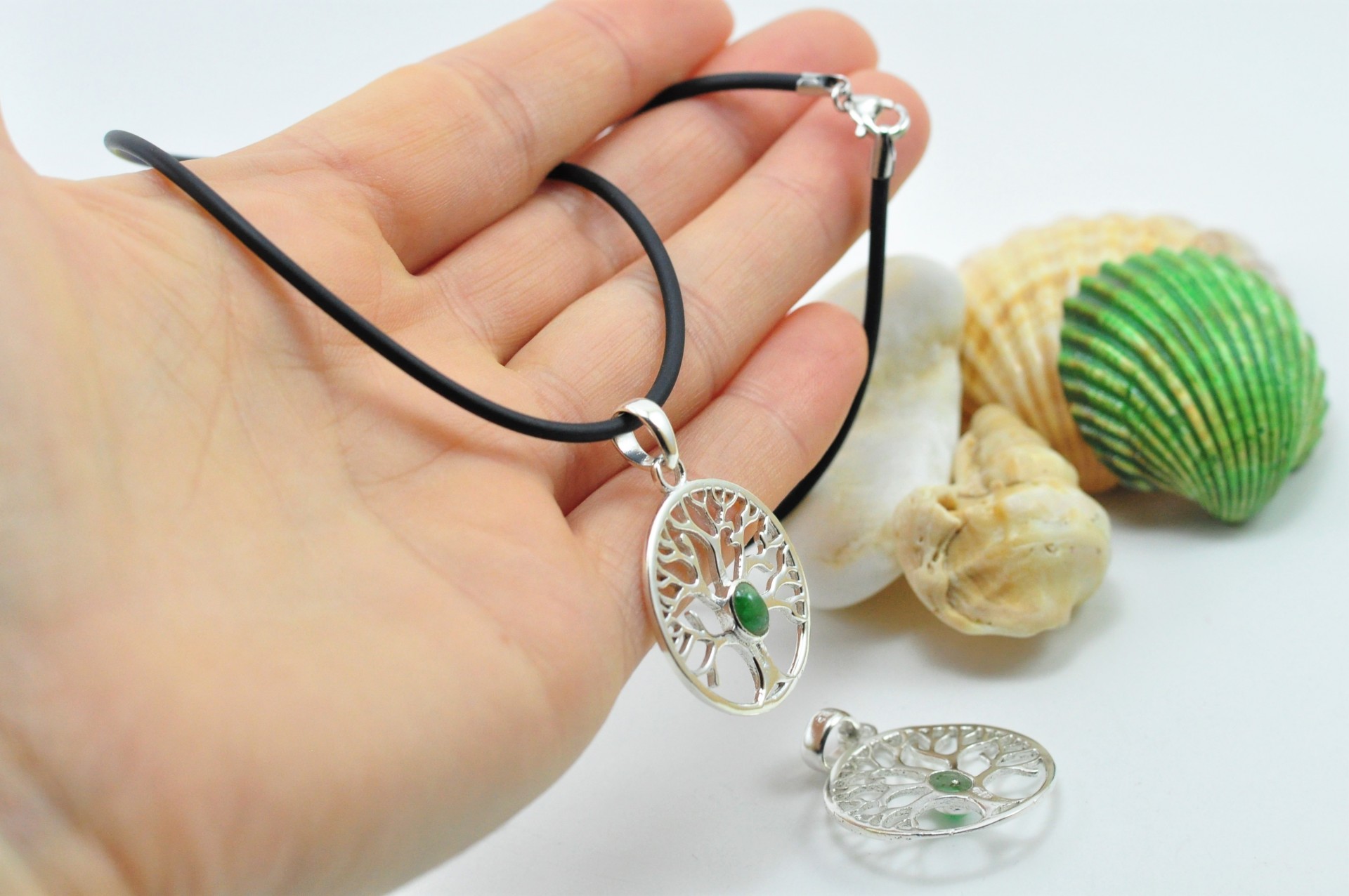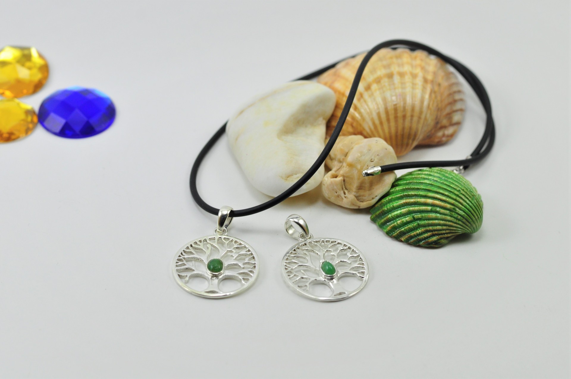 Este pendente com o simbolo "Árvore da Vida" está elaborado em PRATA e no centro tem um cabochão de Esmeralda oval. Este mede cerca de 4x5mm.