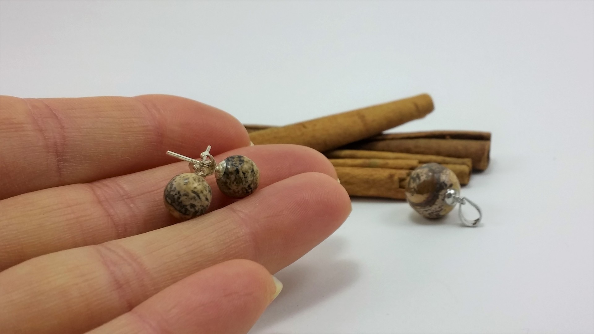 Conjunto de Brincos e Pendente em Prata com Pedra Jaspe Paisagem