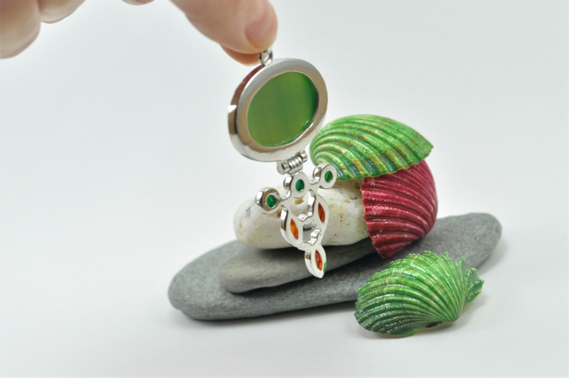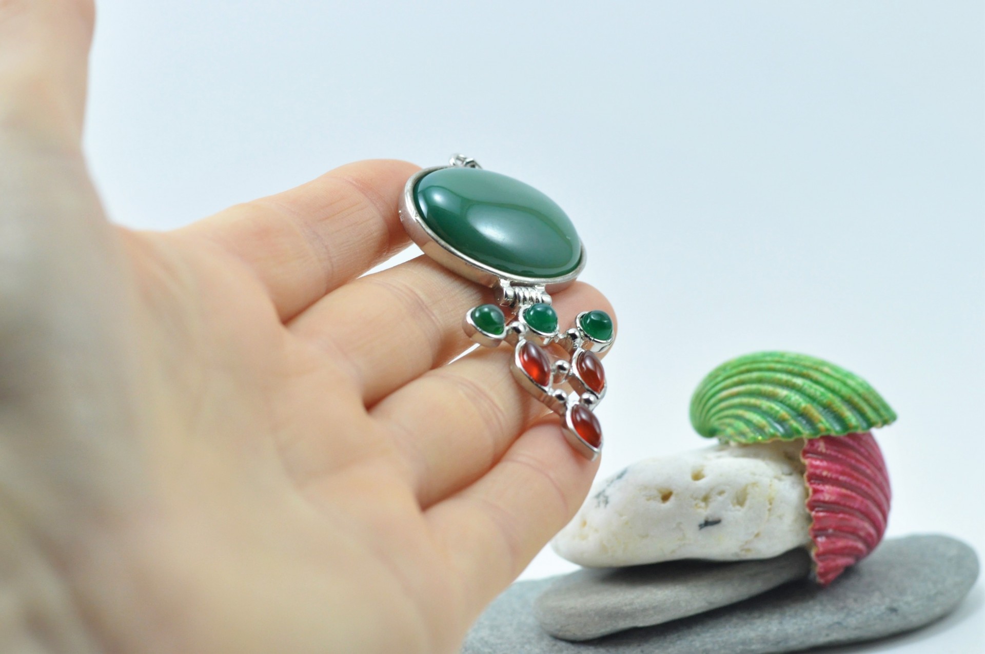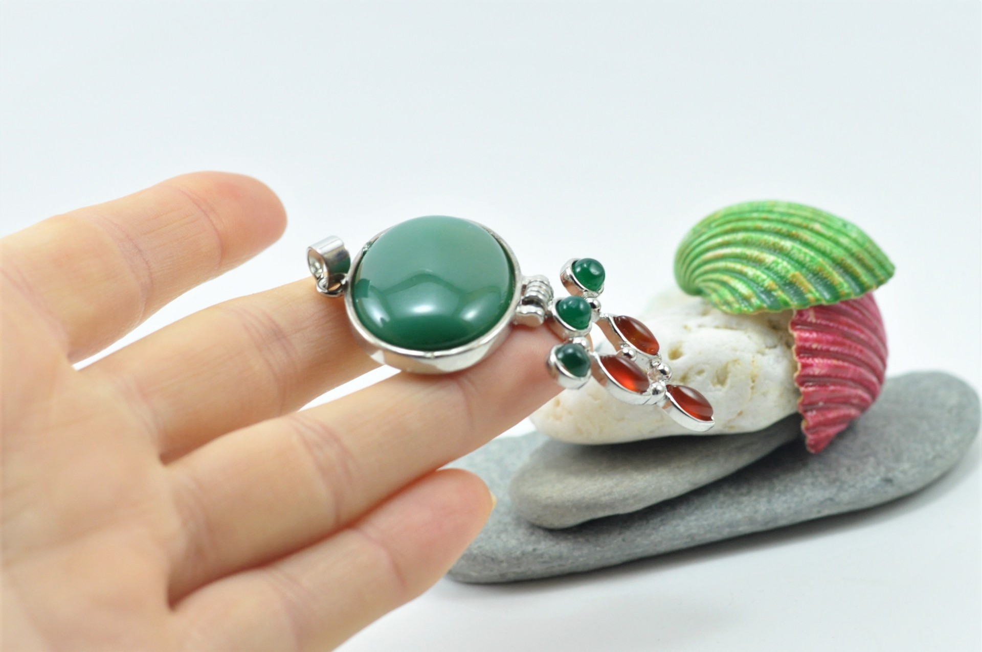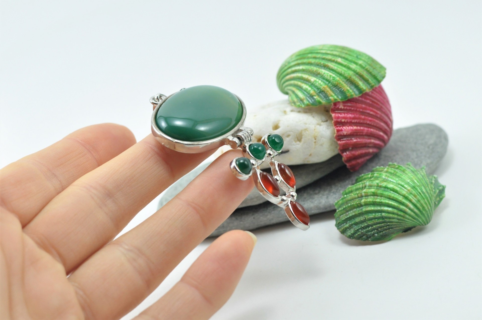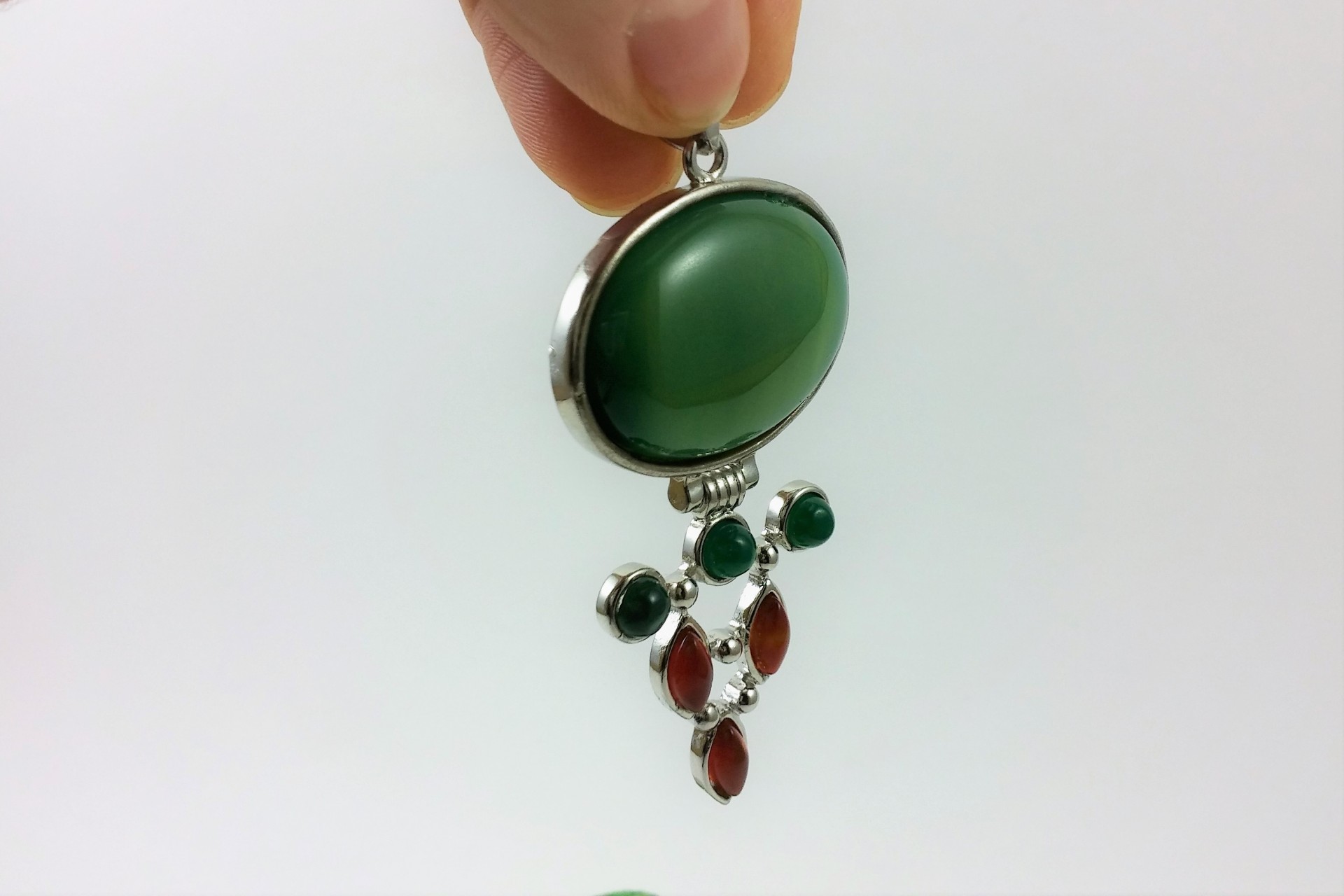Este pendente de Ágata verde e Cornalina tem uma especie de dobradiça a meio, onde na parte de cima está um cabochão oval de Ágata verde. Este pendente está inserido numa armação de metal prateado.