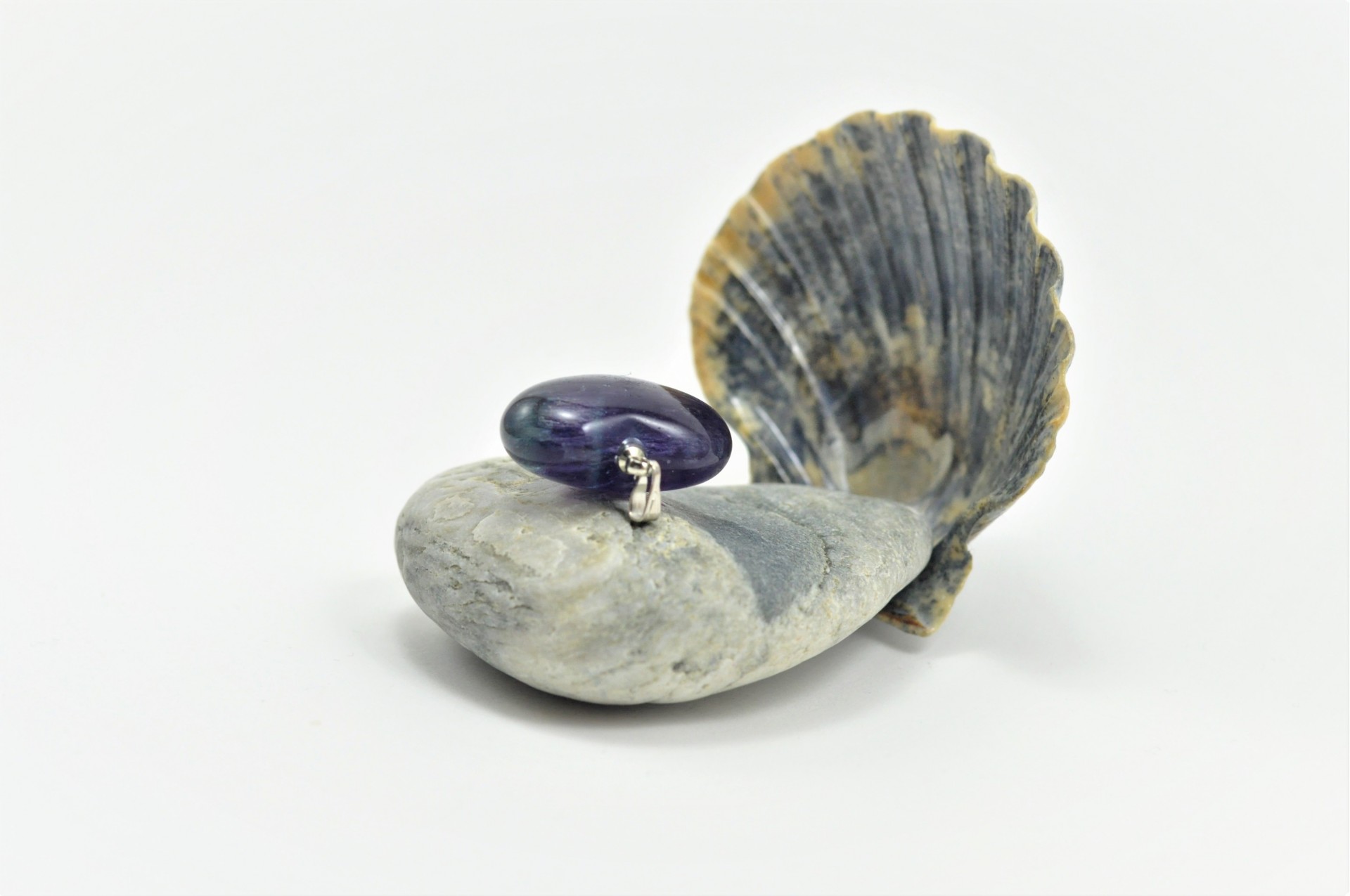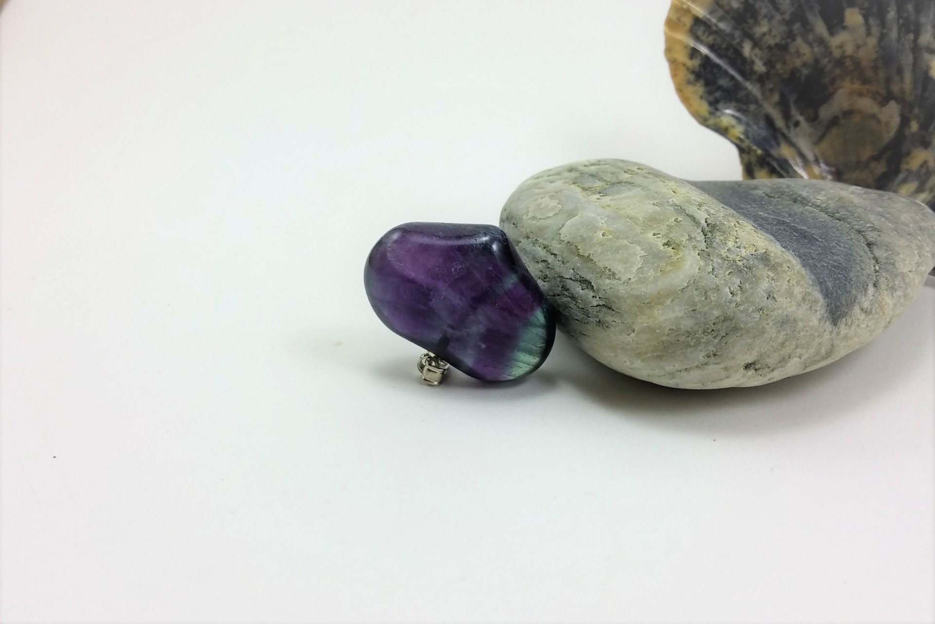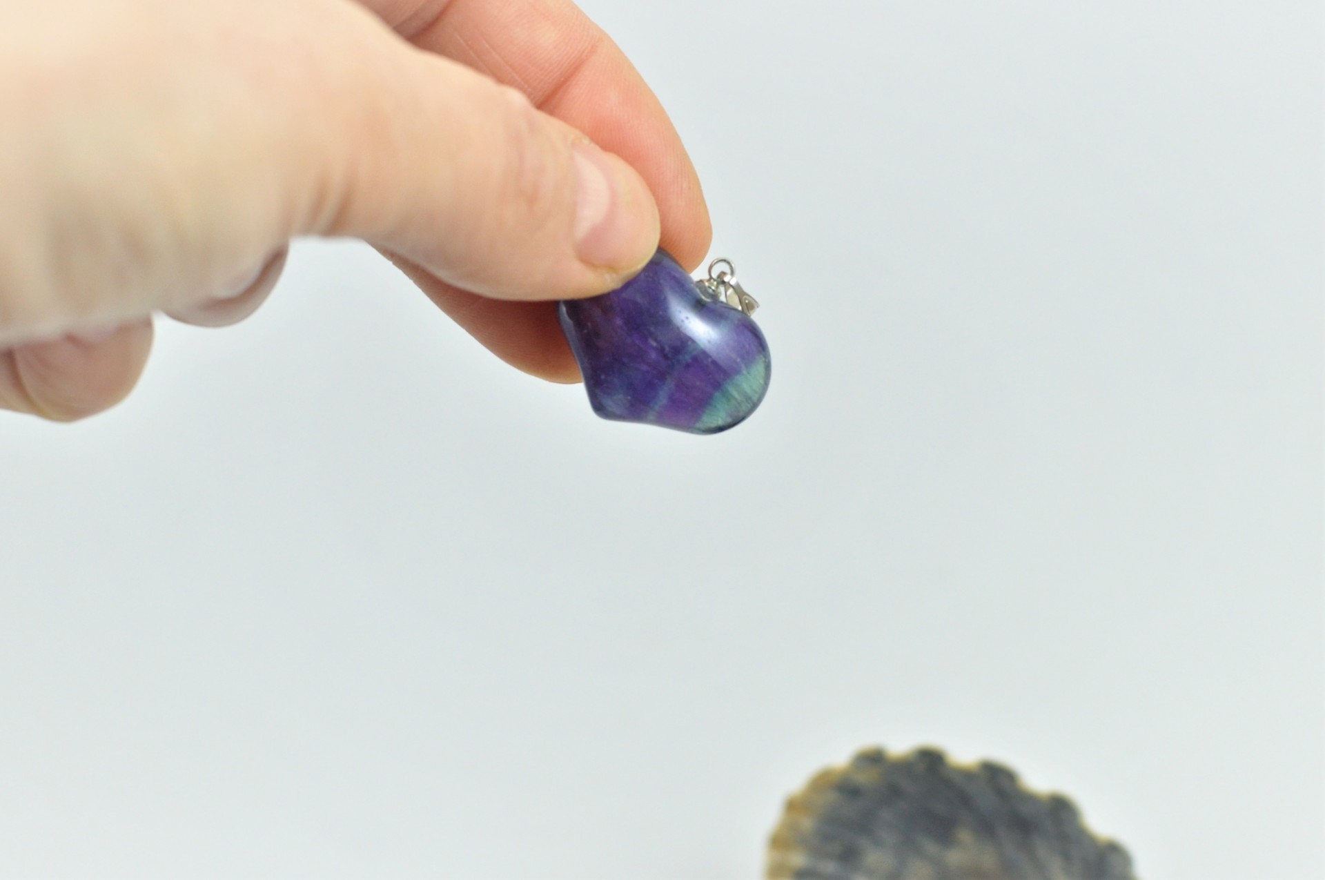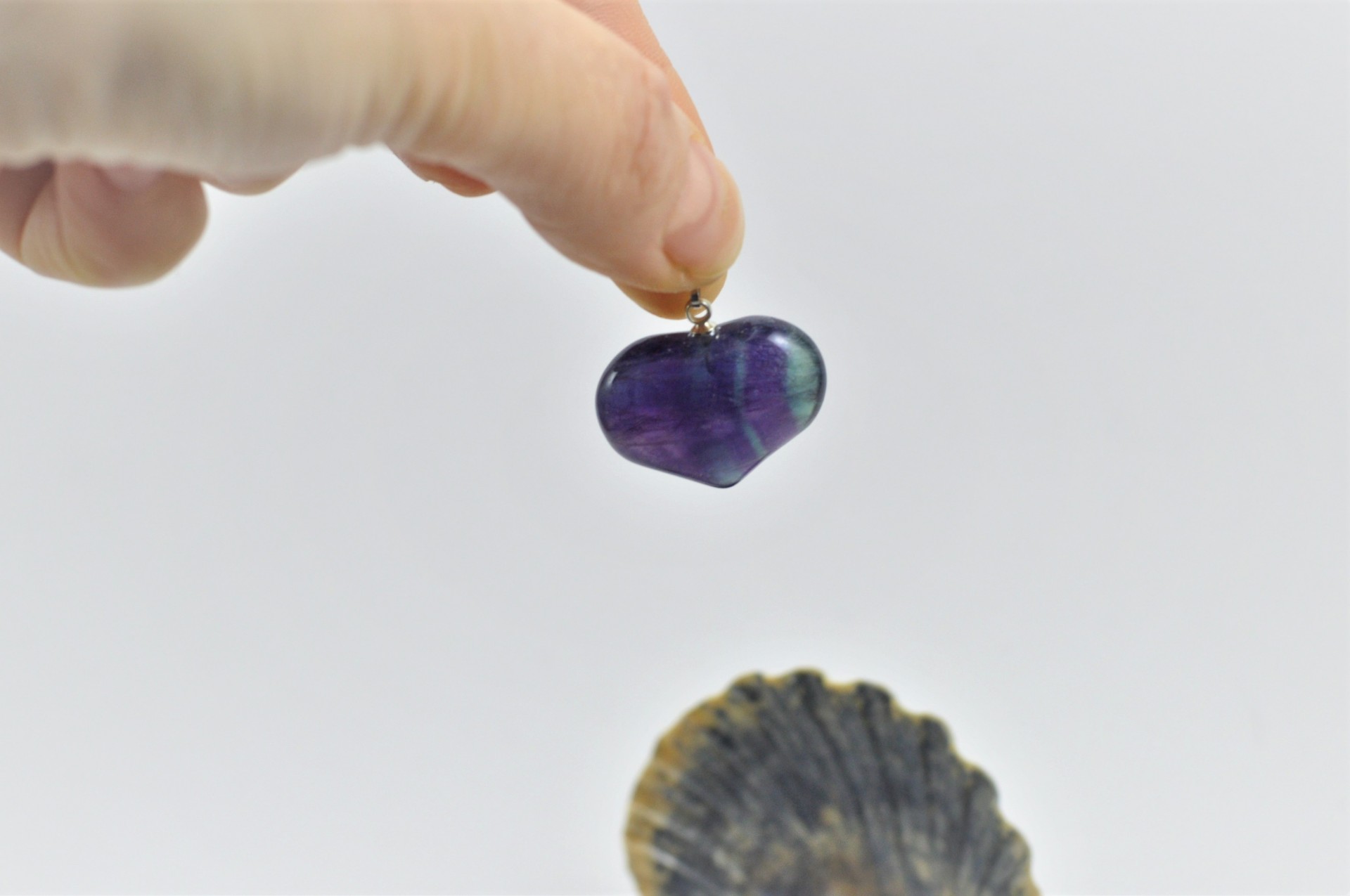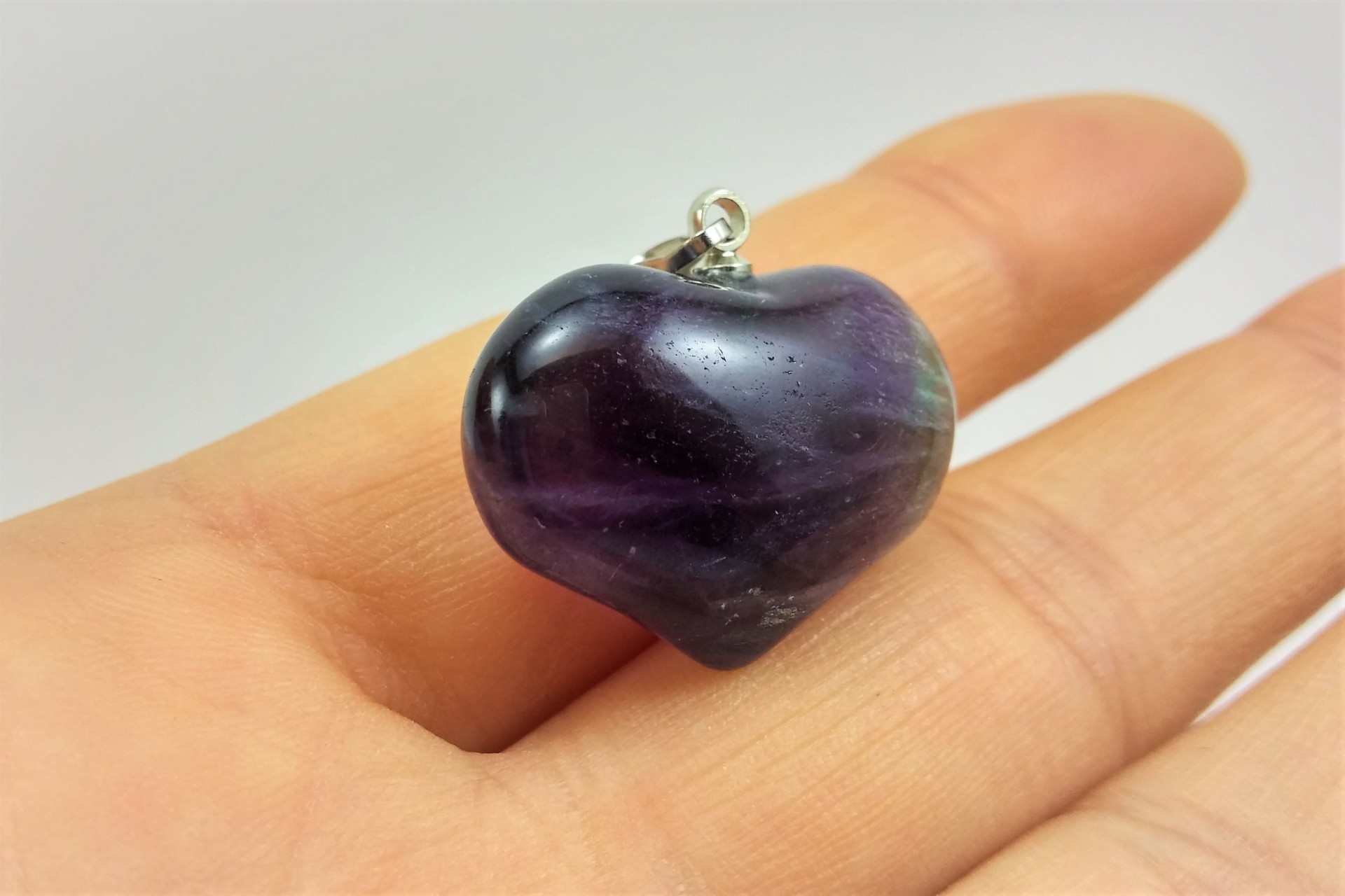 Este pendente tem o seu encanto, não só por ser em forma de coração, mas também por ser em Fluorita, pois parece conter raios de cor lilás, verde, no seu interior