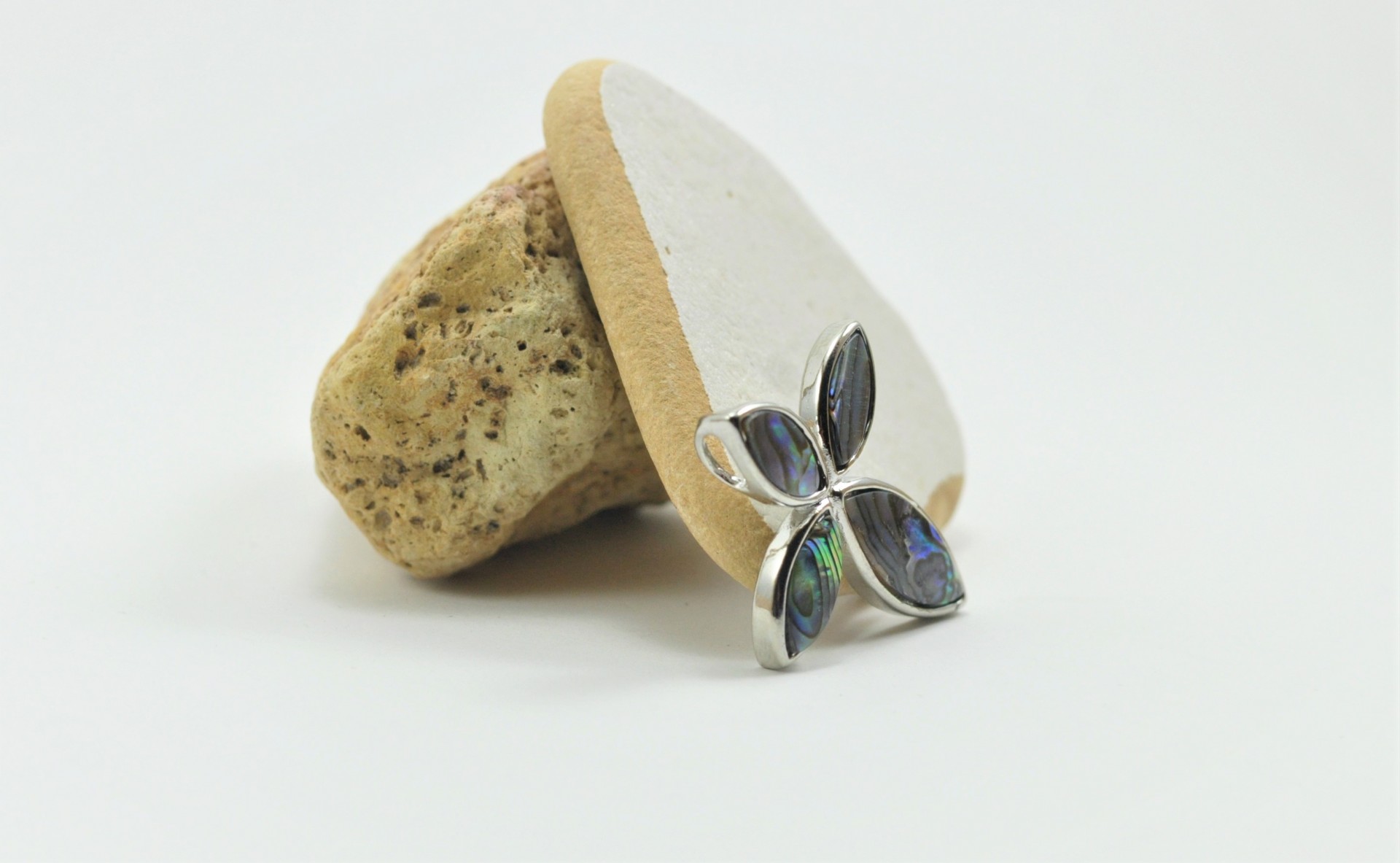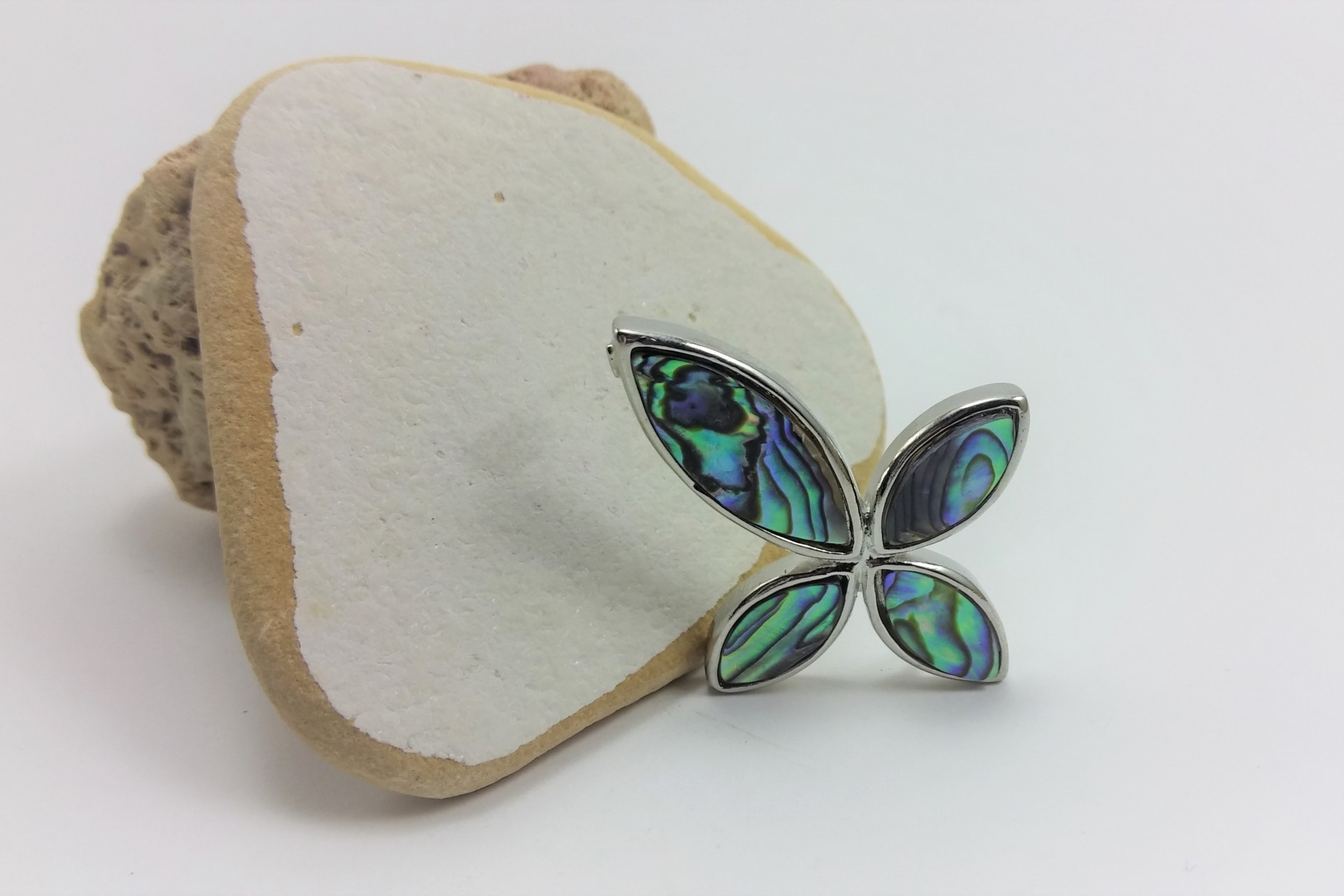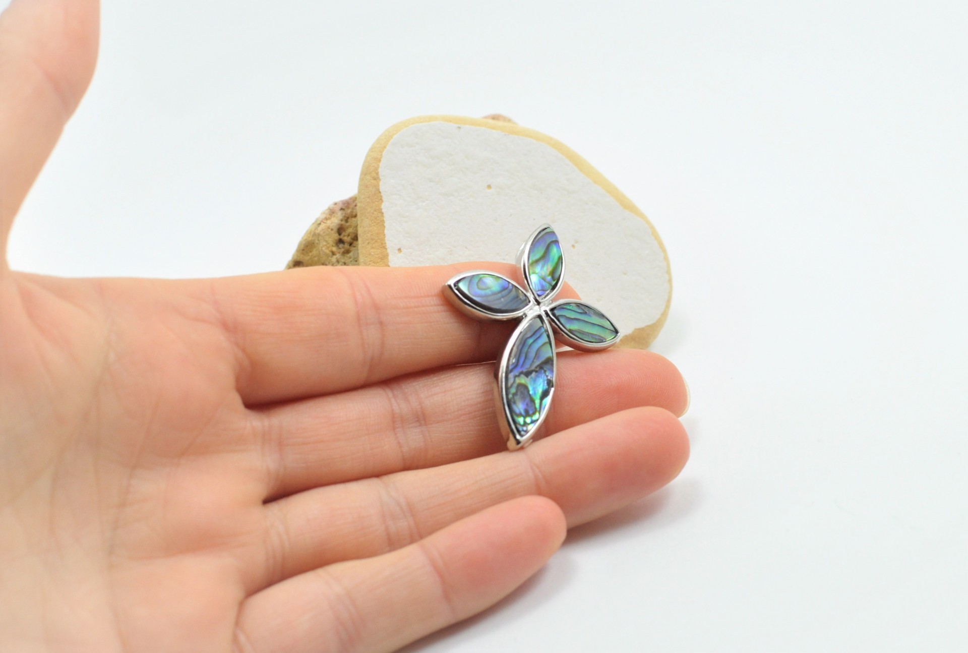 Esta bonita cruz, de Madrepérola (ou Nácar), está construída numa armação metálica prateada brilhante e leva 4 peças inseridas em forma de lágrimas.