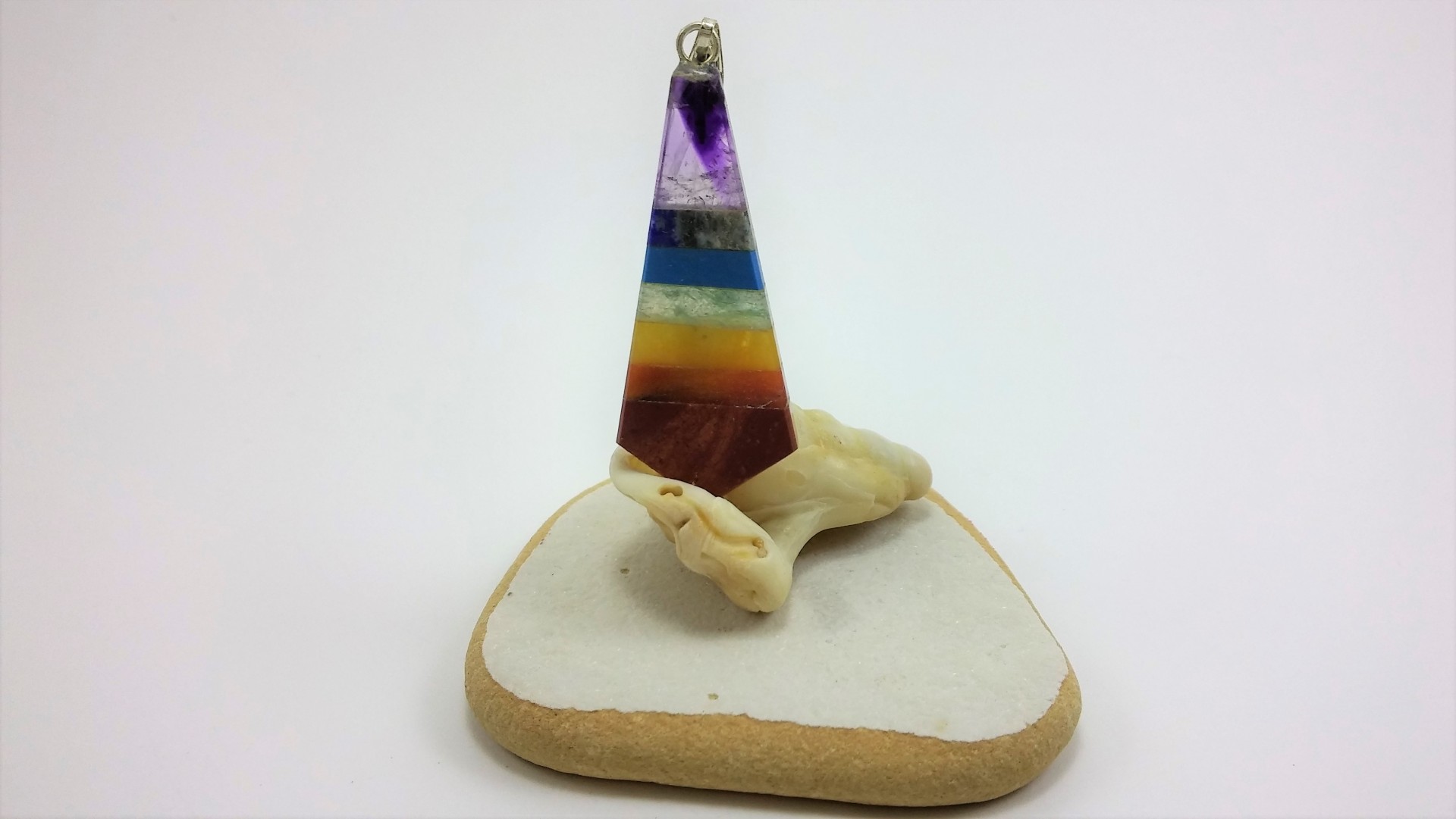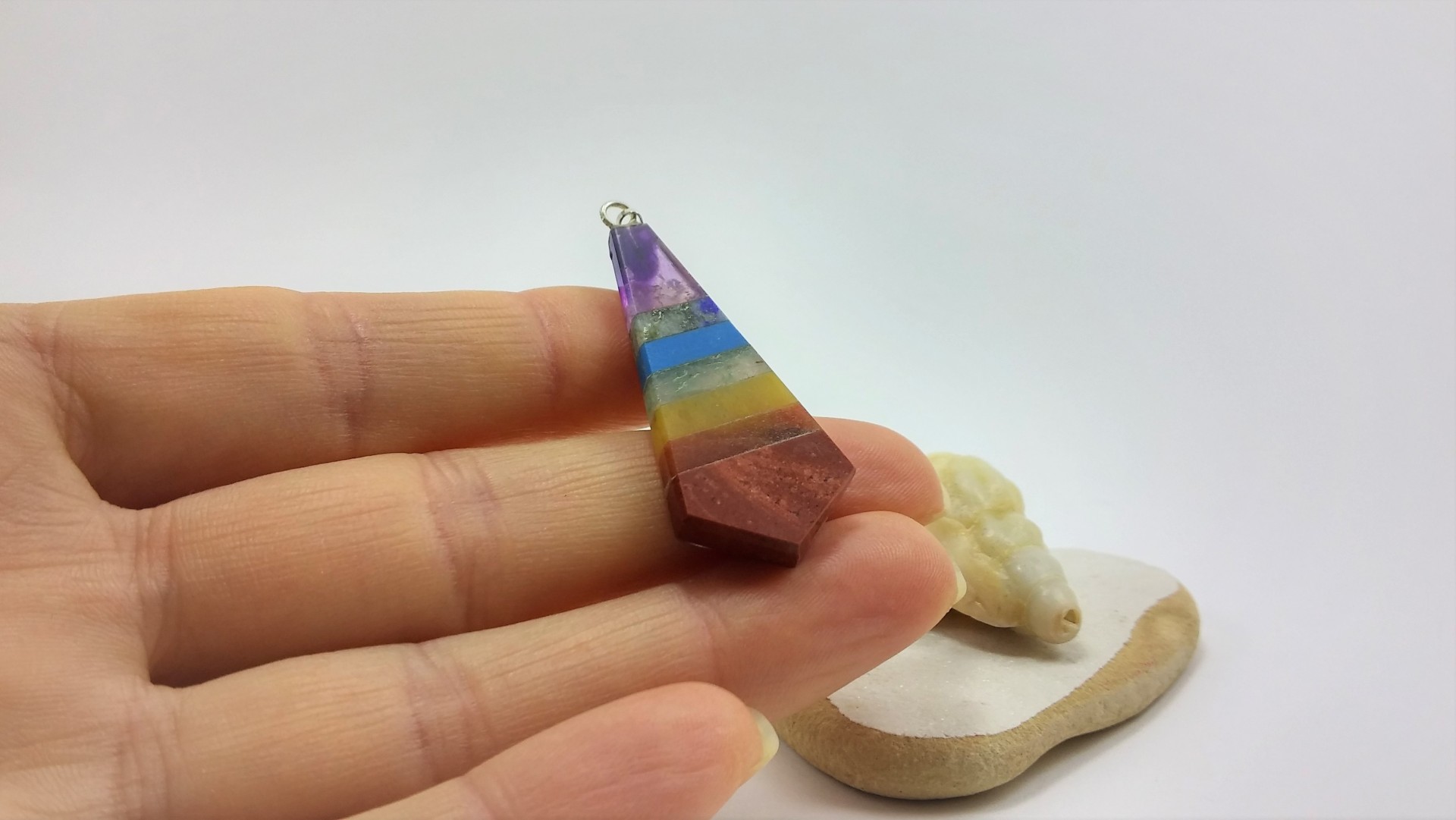 Este Pendente, talhado com 7 pedras para o equilibrio dos 7 Chakras, é ideal para Gemoterapia e Reiki.