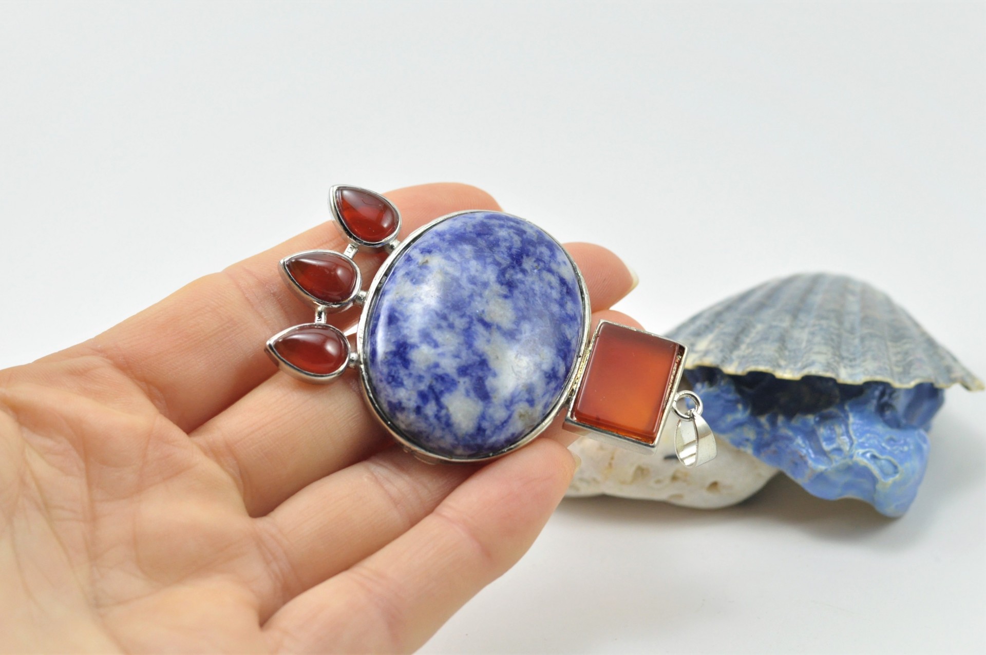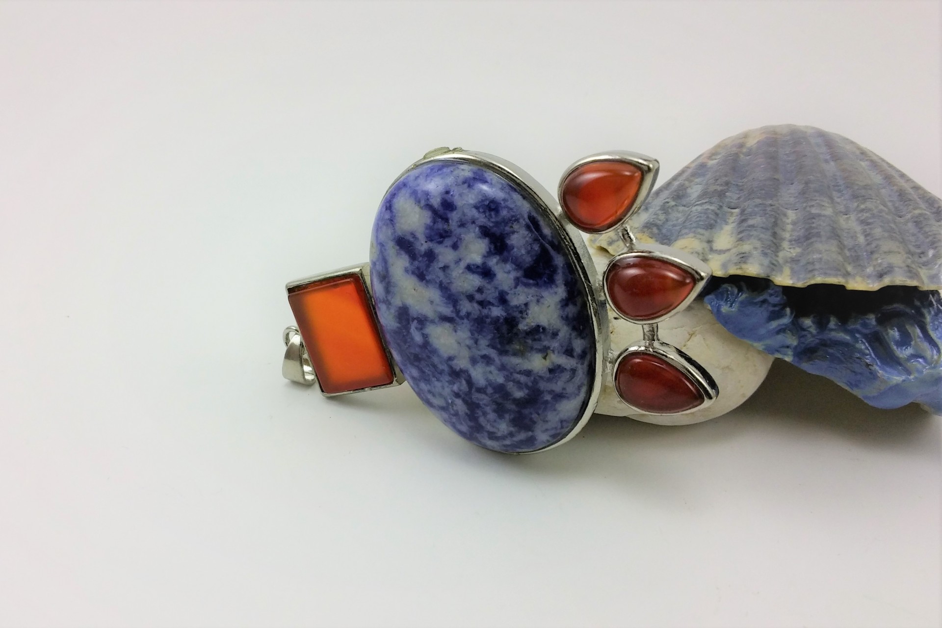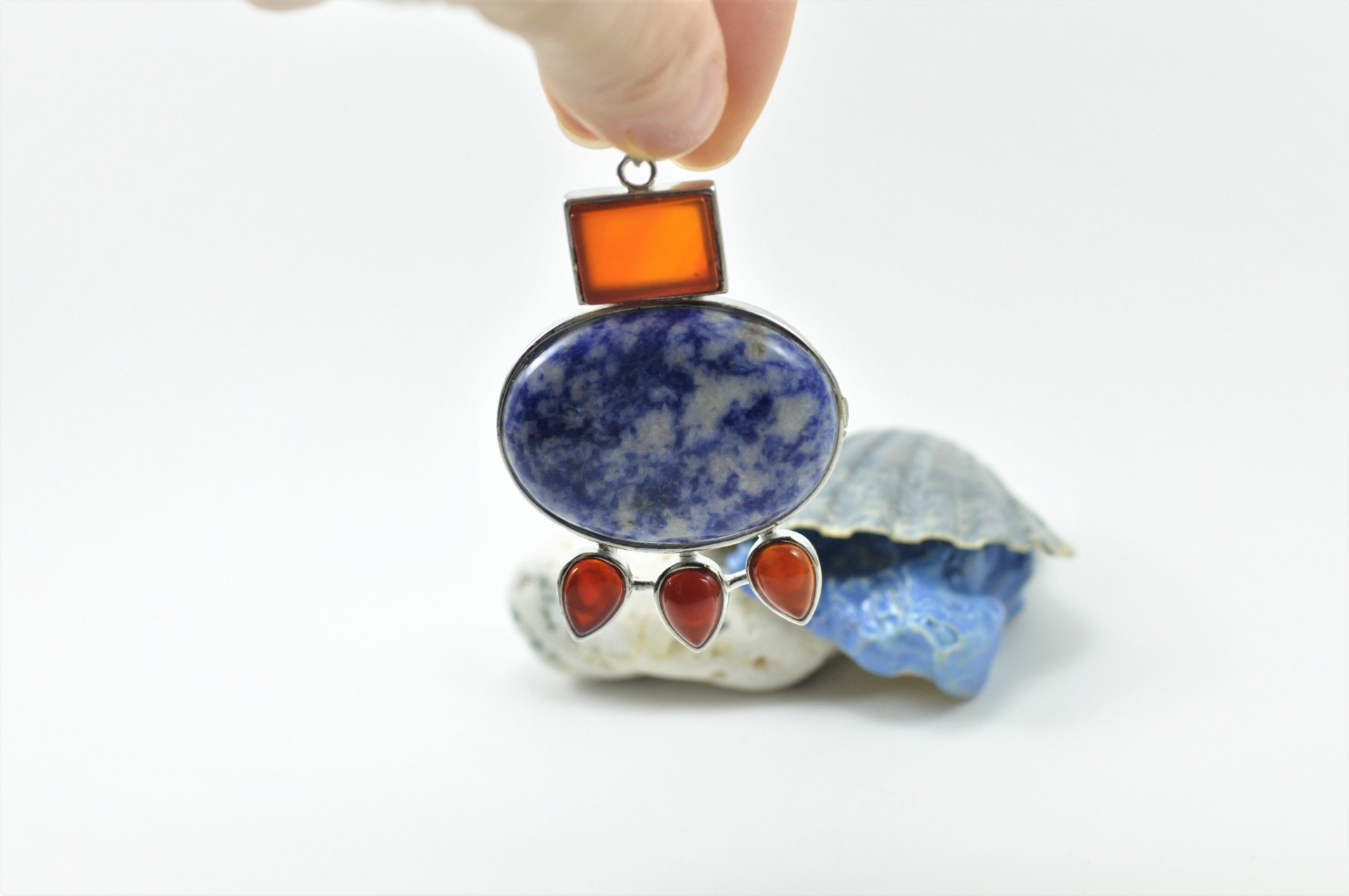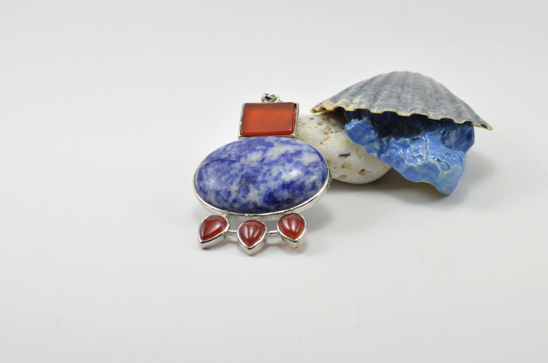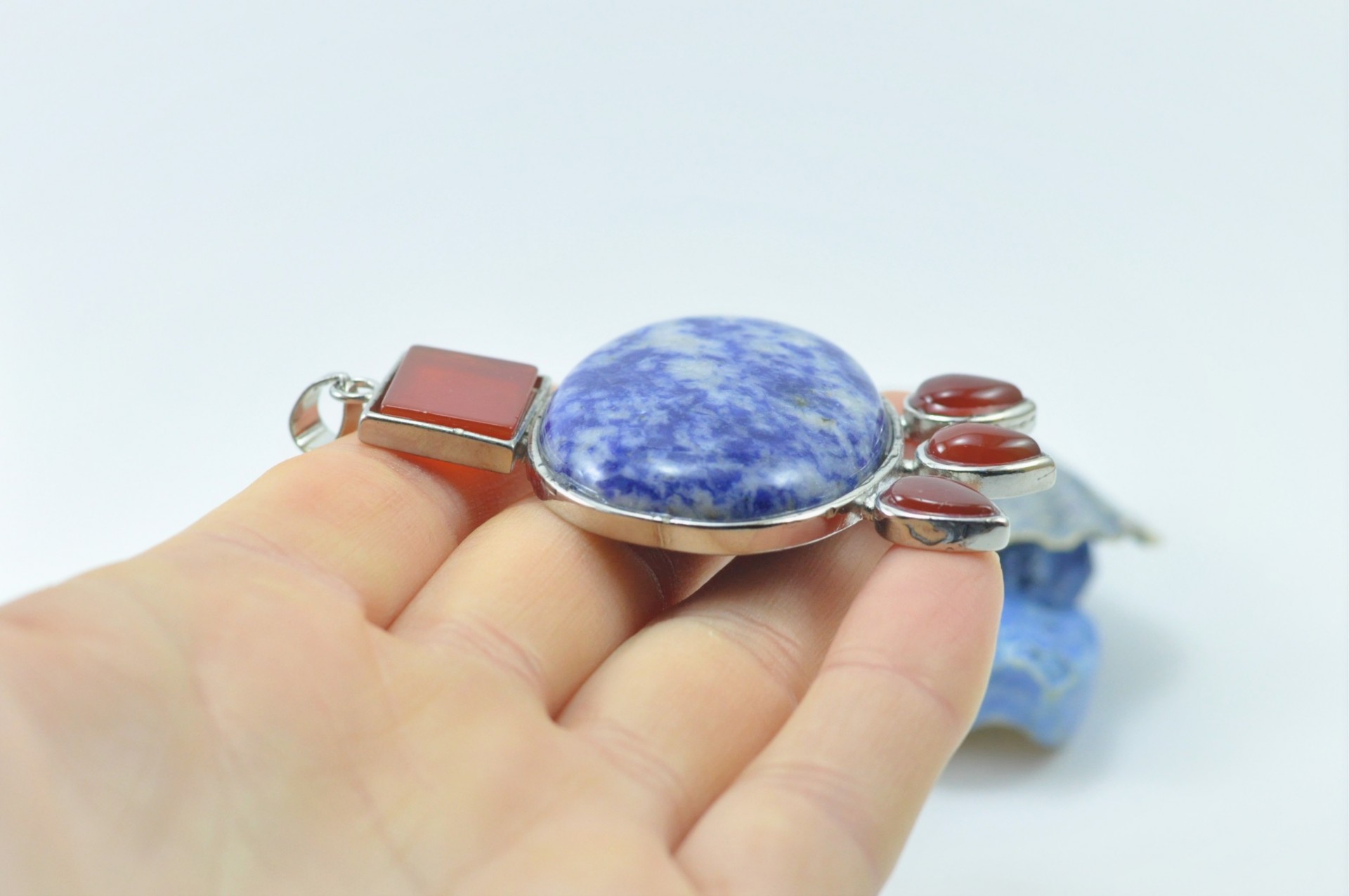 Este bonito pendente está elaborado com inspiração nas jóias do antigo Egipto. Está confeccionado na combinação de duas pedras naturais sendo elas, a Sodalita e a Cornalina e estão inseridas em armação de metal prateado.