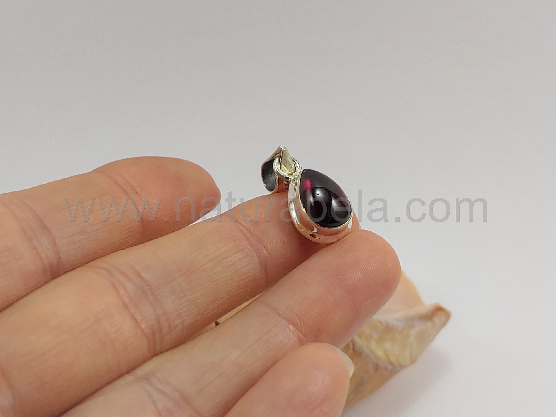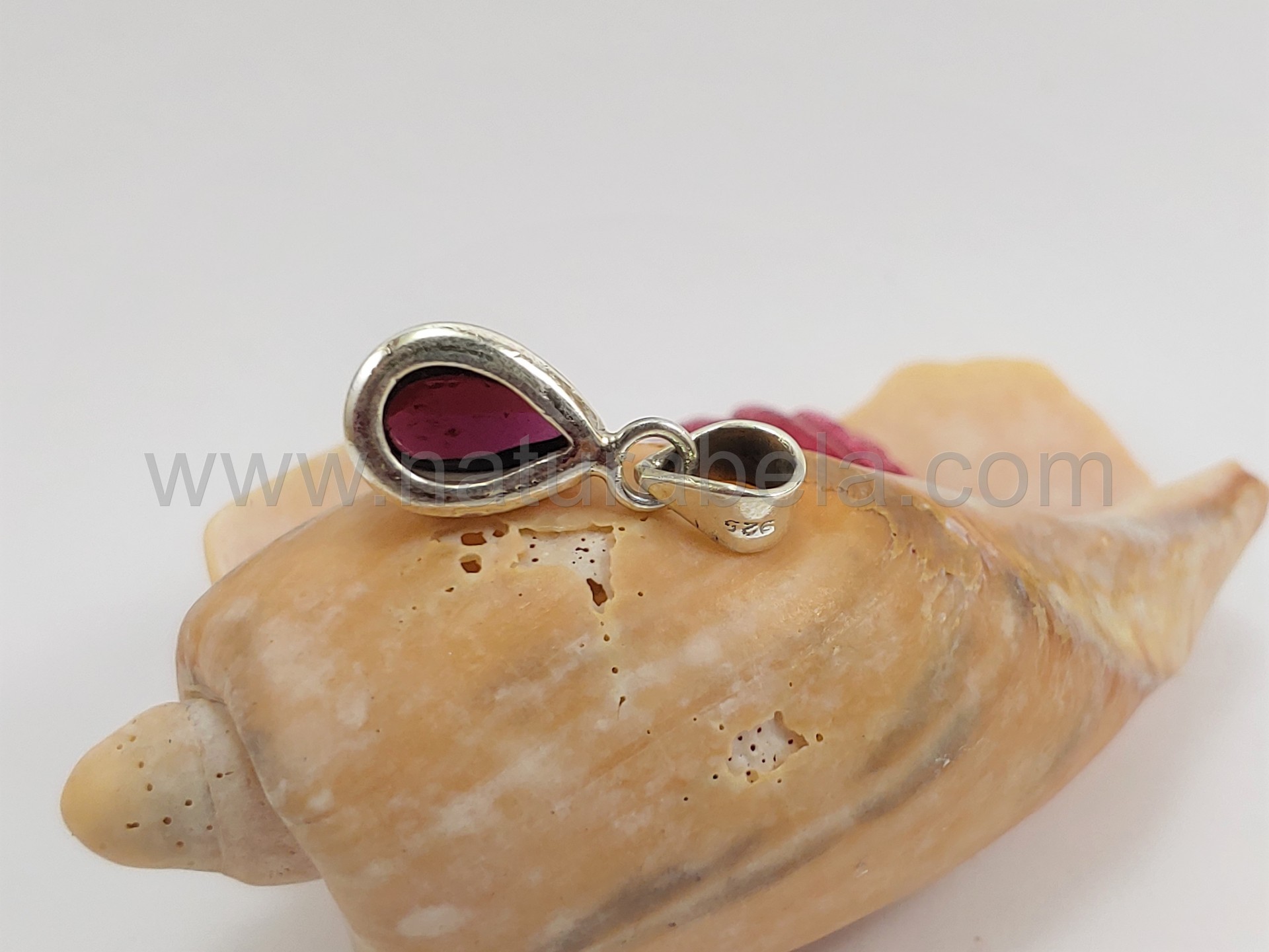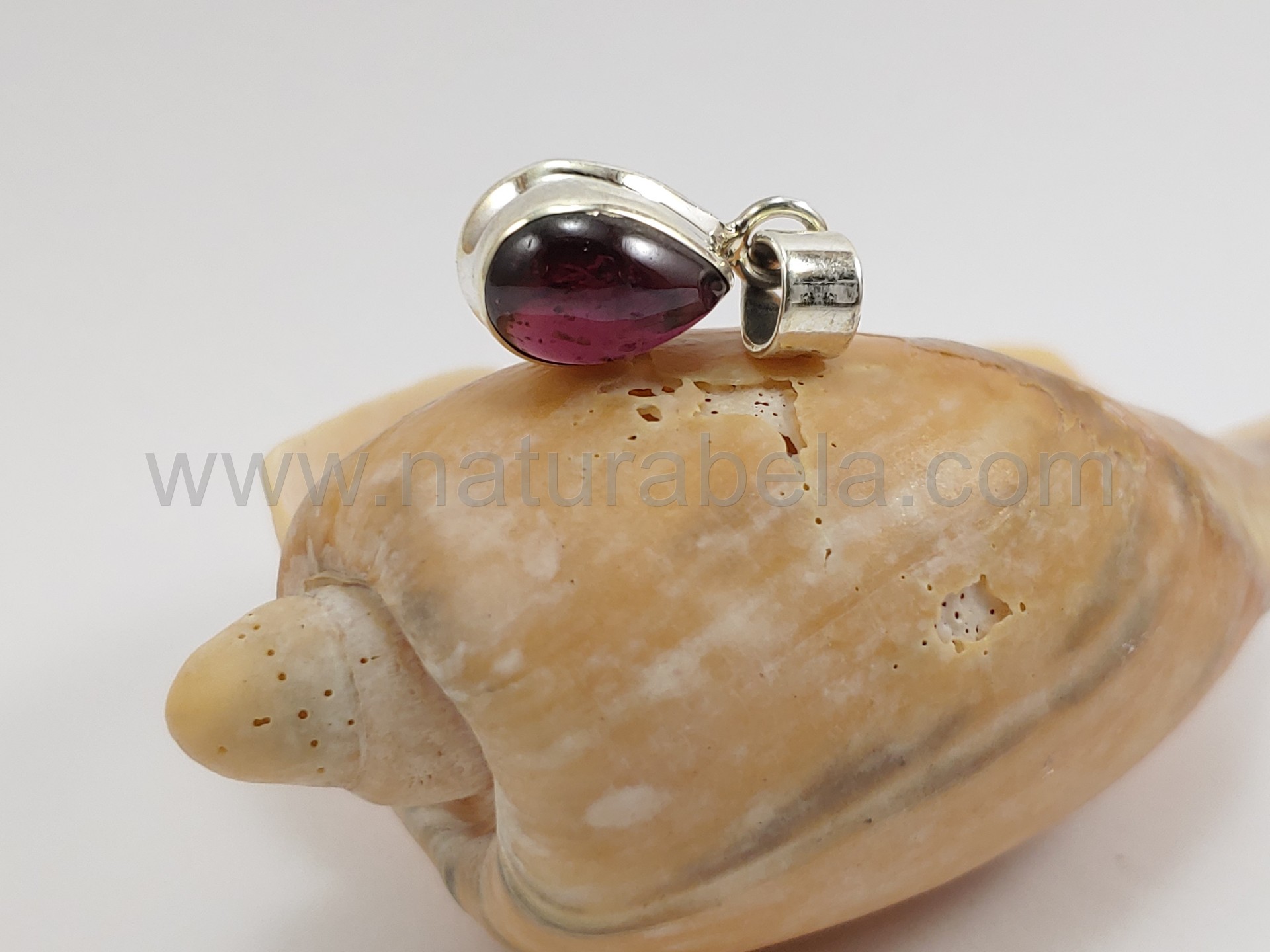 Este pendente é em prata e contém uma linda pedra Granada polida em forma de gota.