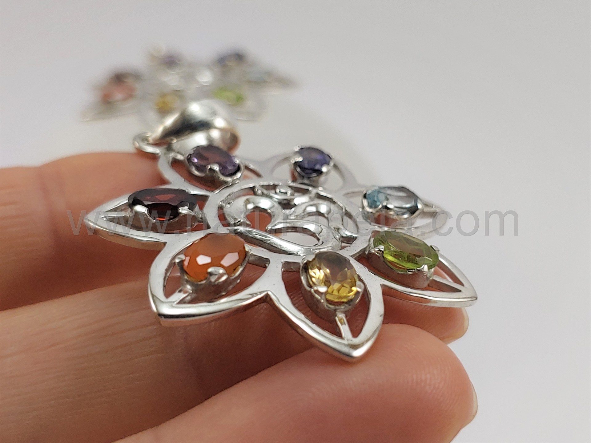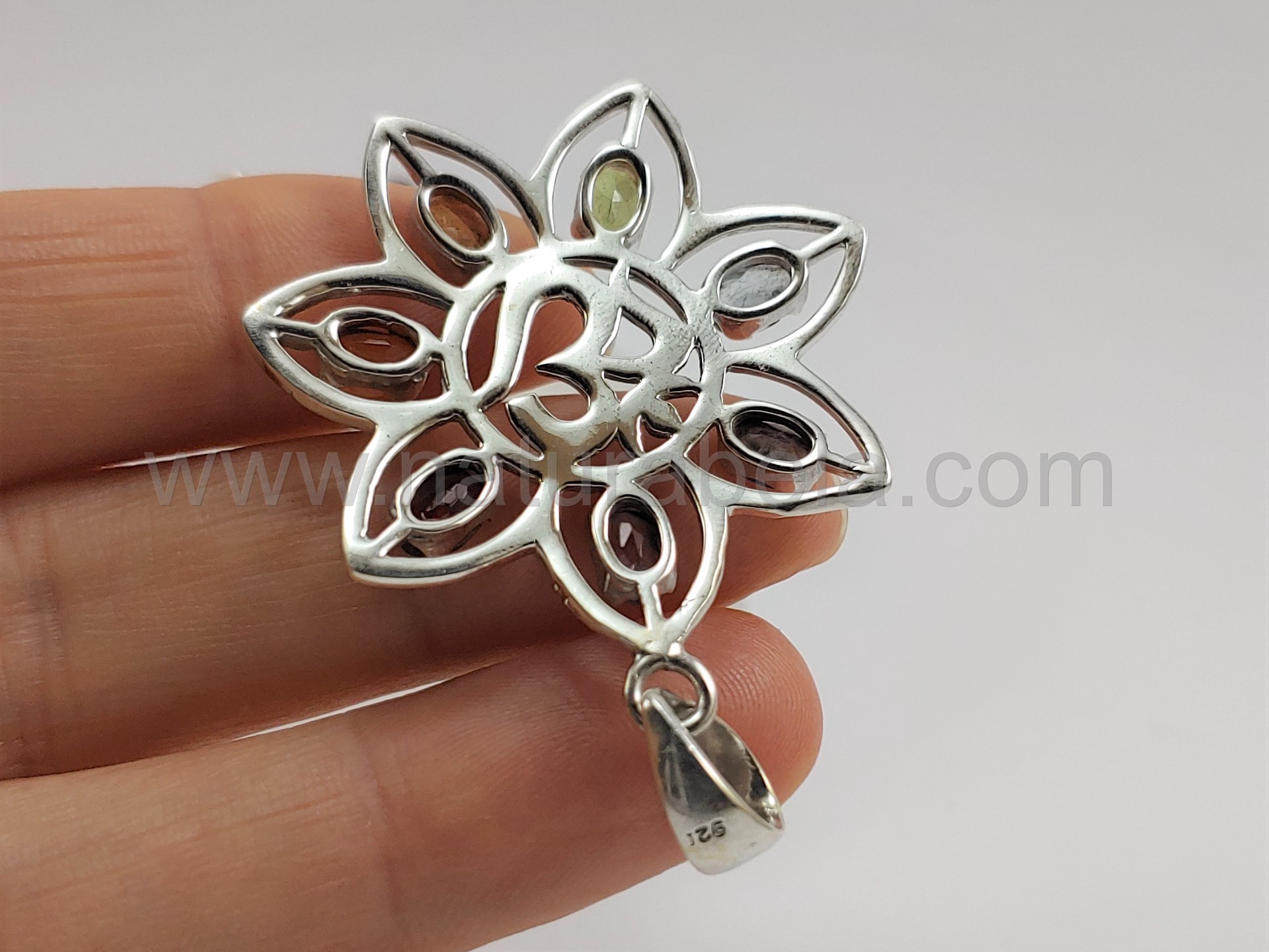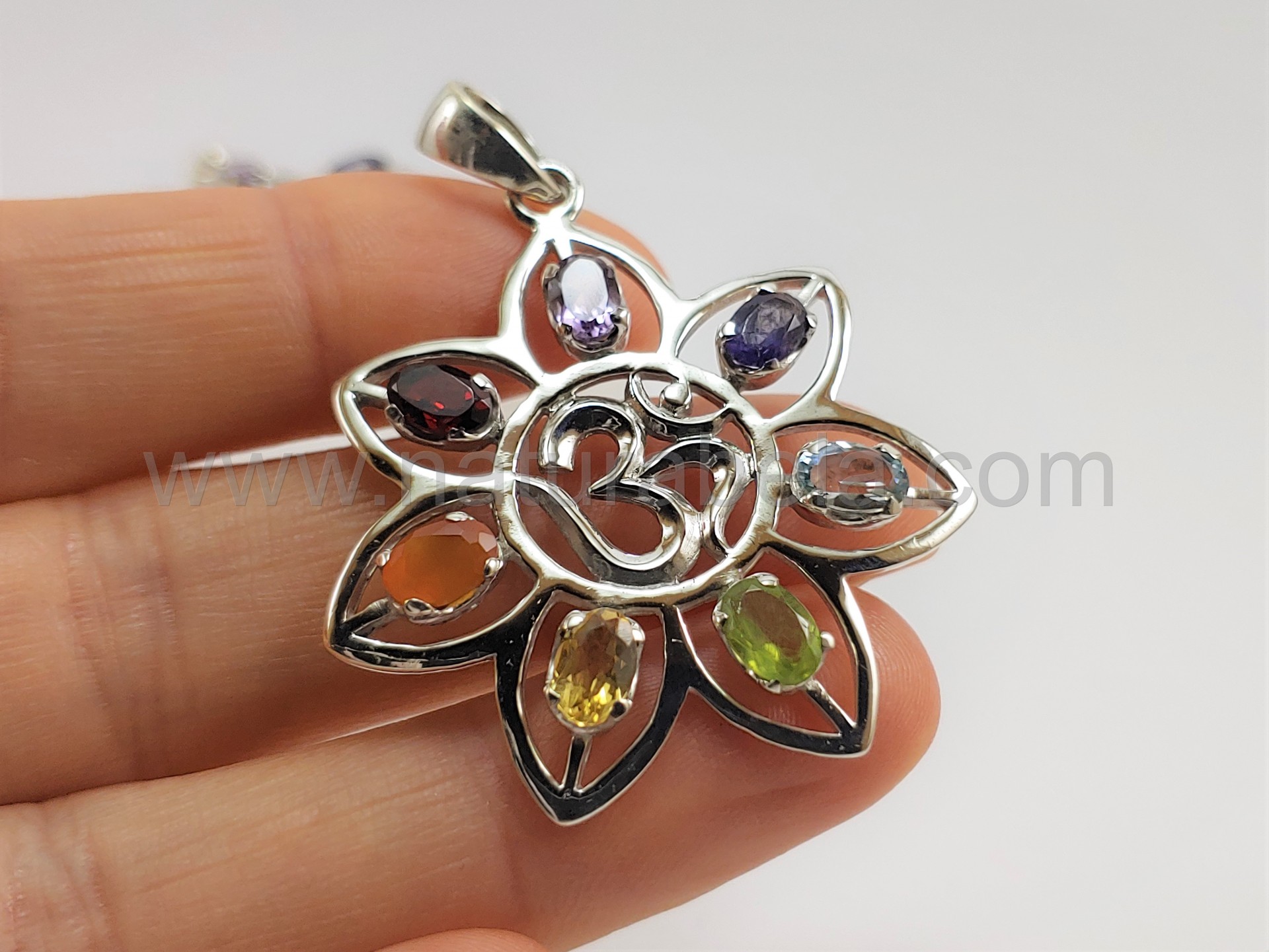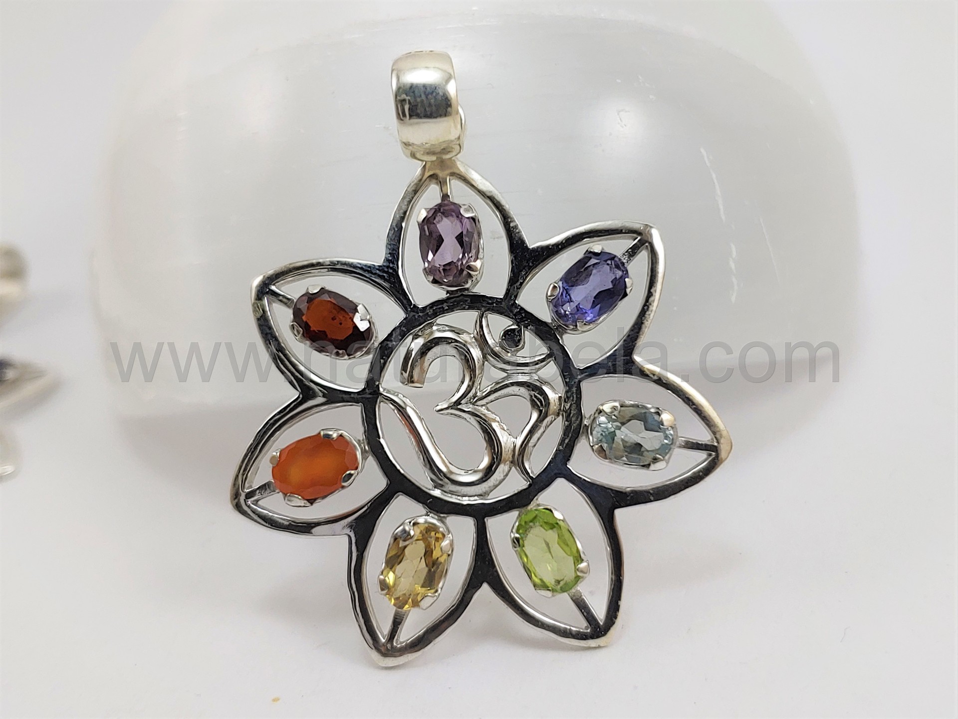 Este pendente com símbolo OM em prata 925 é realizado artesanalmente e contém as seguintes pedras naturais: Ametista, Cornalina, Citrino, Peridoto, Topázio Azul, Iolita e Granada. Estas pedras naturais são todas facetadas e estão inseridas no pendente através de garras. É dos pendentes mais bonitos e cheio de simbologia.