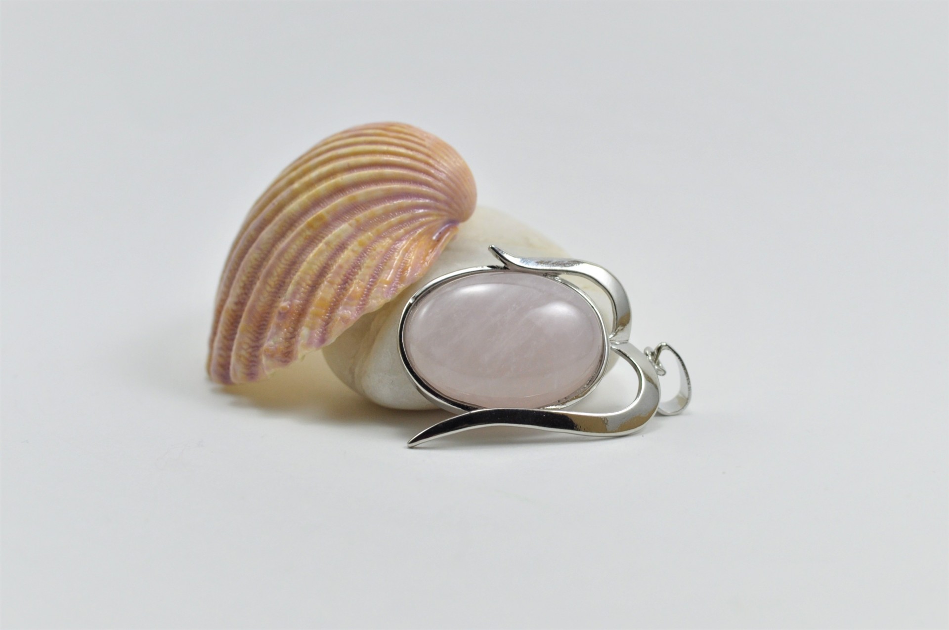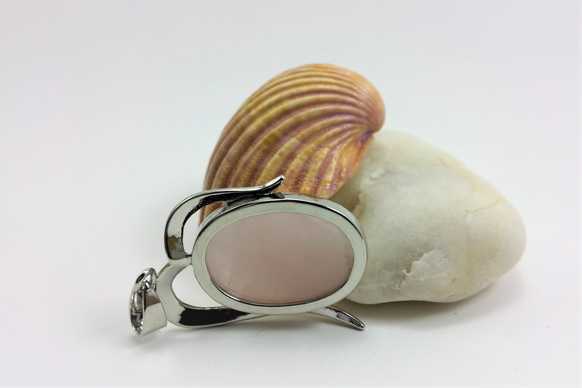 Este pendente ovalado está formado por um marco metálico em relevo que imita as ondas do mar e leva encastrado um lindo quartzo rosa.