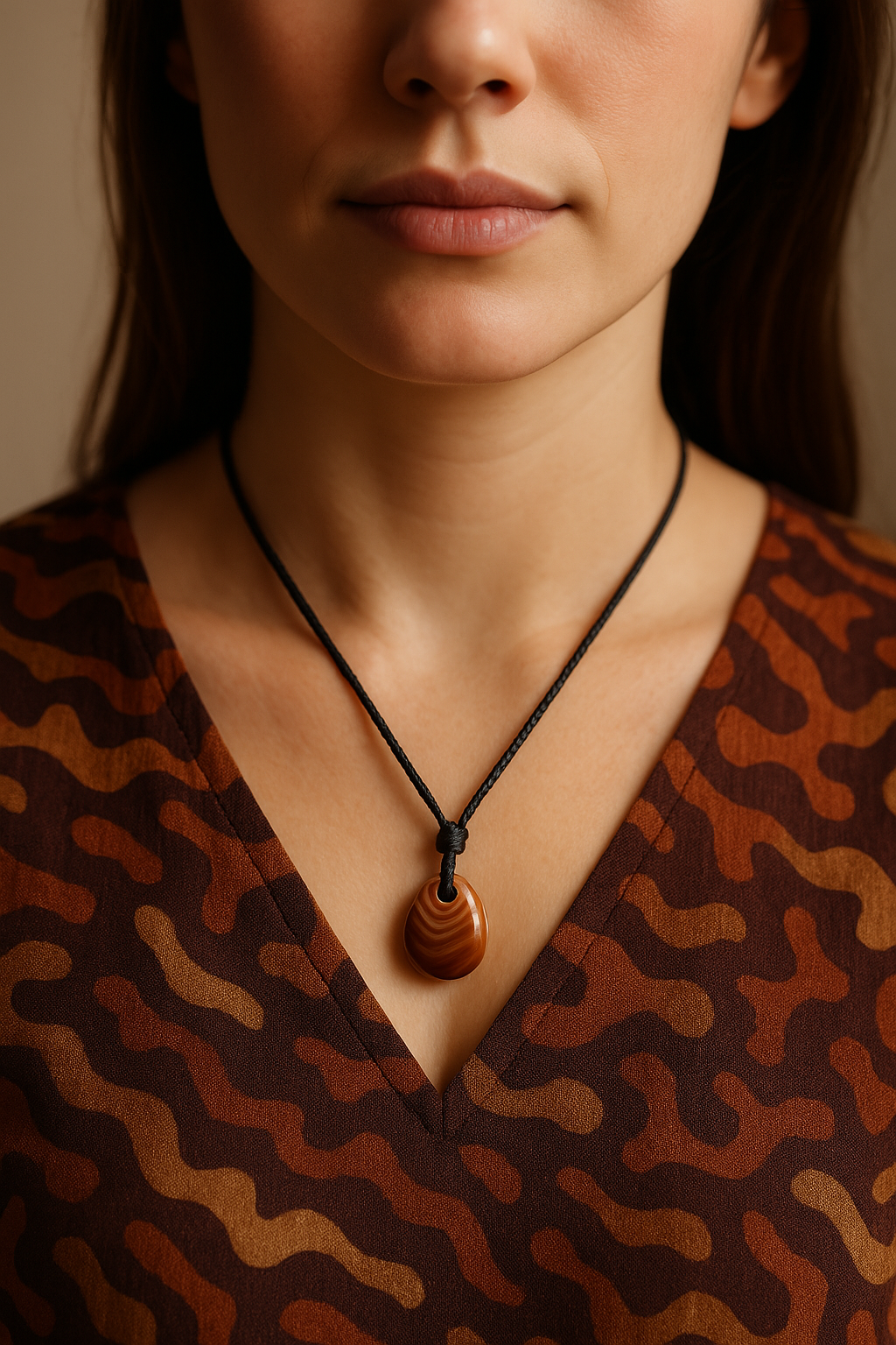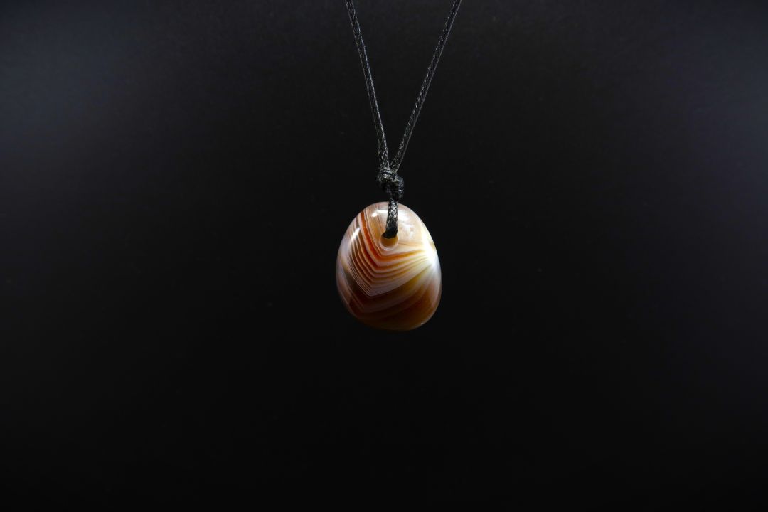 Este pendente apresenta uma pedra natural de Ágata Bandeada em formato oval irregular, com cerca de 2 a 3 cm, acompanhada por um fio de nylon confortável e ajustável, pensado para se adaptar facilmente a qualquer pessoa.