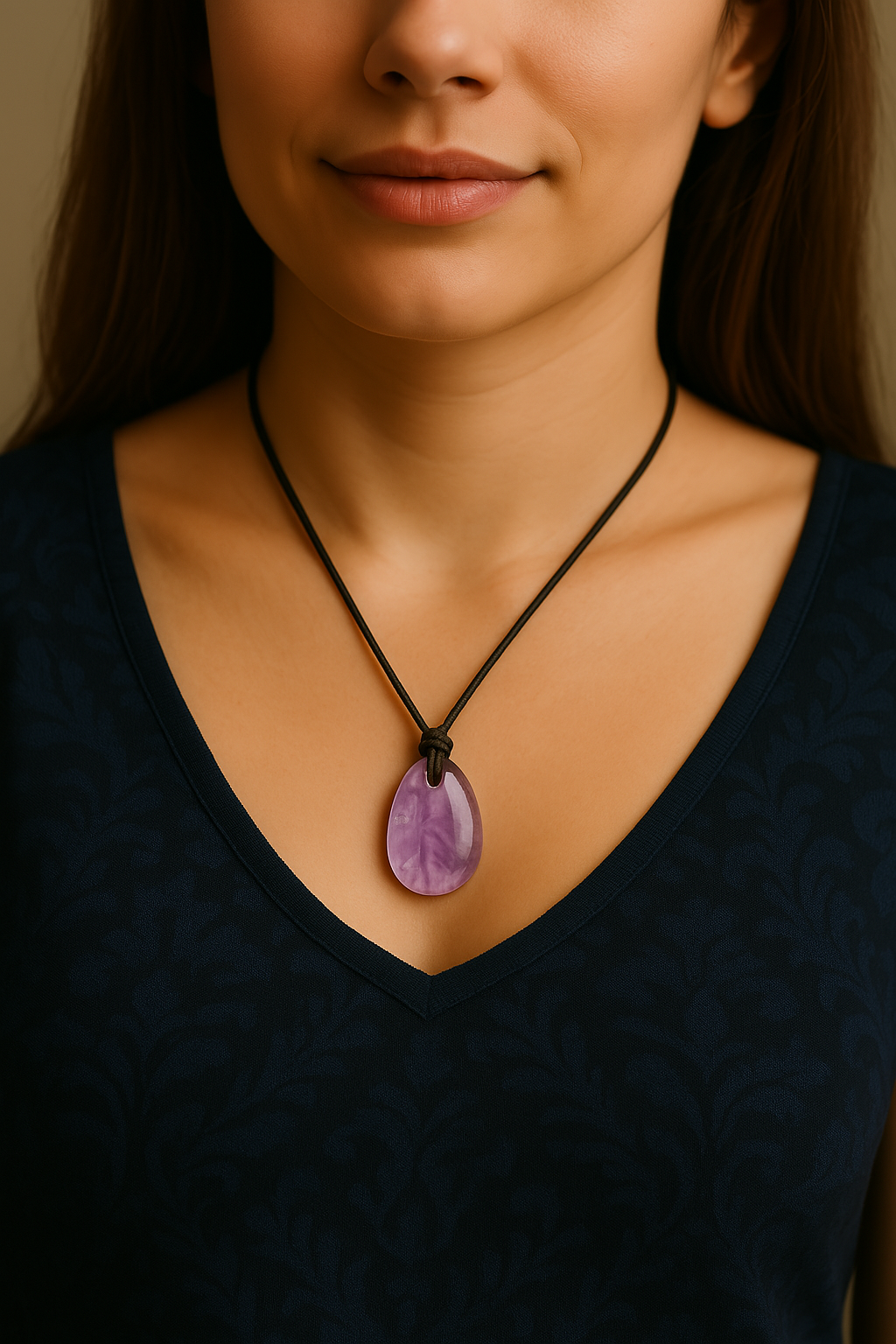 Este pendente apresenta uma pedra natural de Ametista em formato oval irregular (entre 2 e 3 cm), acompanhada por um fio de nylon discreto e ajustável. Uma peça de visual delicado e profundo simbolismo, perfeita para quem valoriza conexão espiritual e equilíbrio interior.