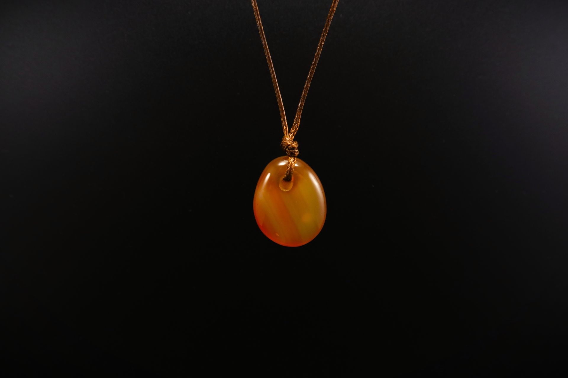 Este pendente apresenta uma pedra natural de Cornalina em formato oval irregular (entre 2 e 3 cm), acompanhada por um fio de nylon discreto e ajustável. Uma peça que alia simplicidade a um profundo simbolismo, ideal para uso diário.