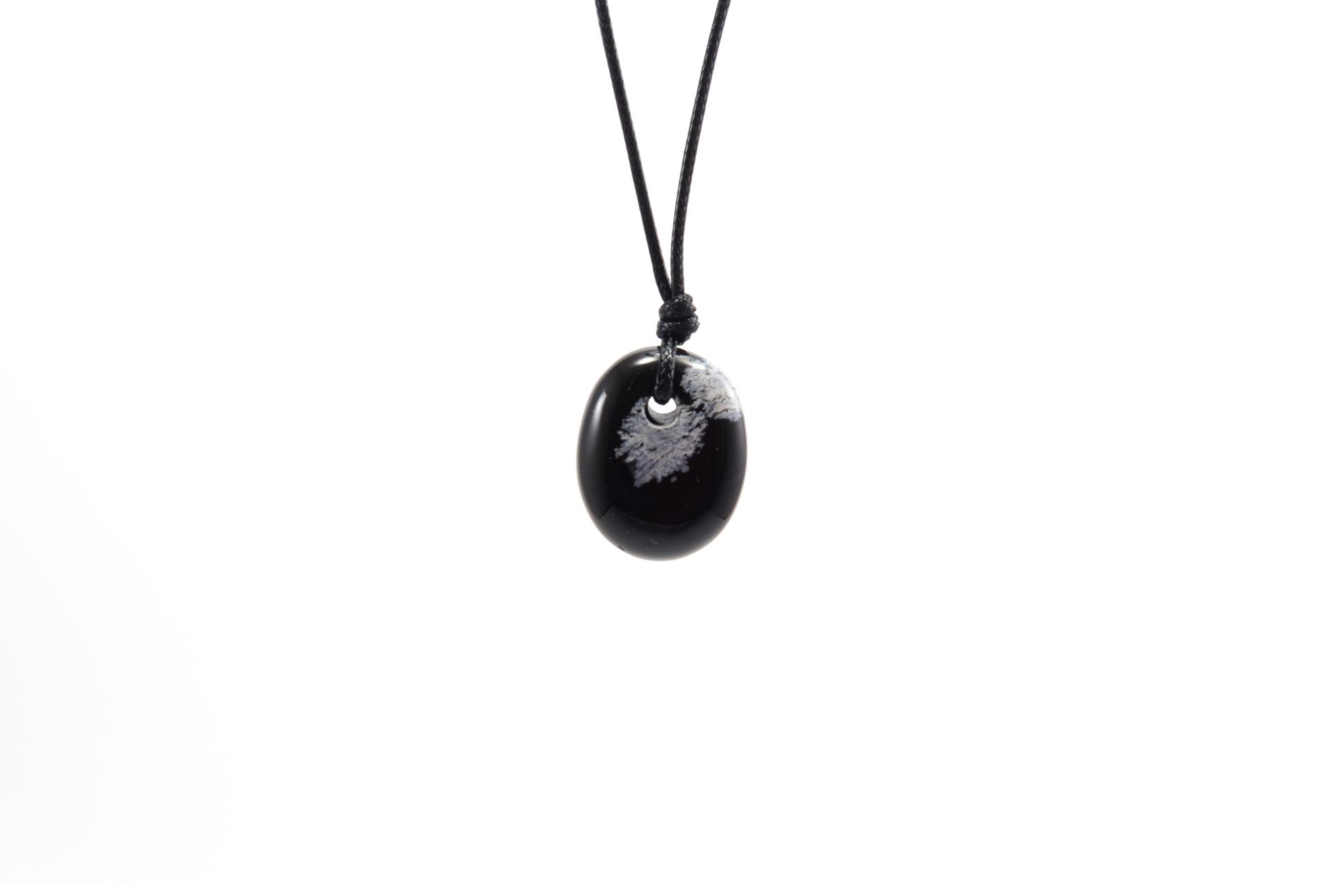 Este pendente é composto por uma pedra natural de Obsidiana Nevada em formato oval irregular, com cerca de 2 a 3 cm de tamanho, pendurado num fio de nylon discreto e ajustável, ideal para qualquer ocasião.