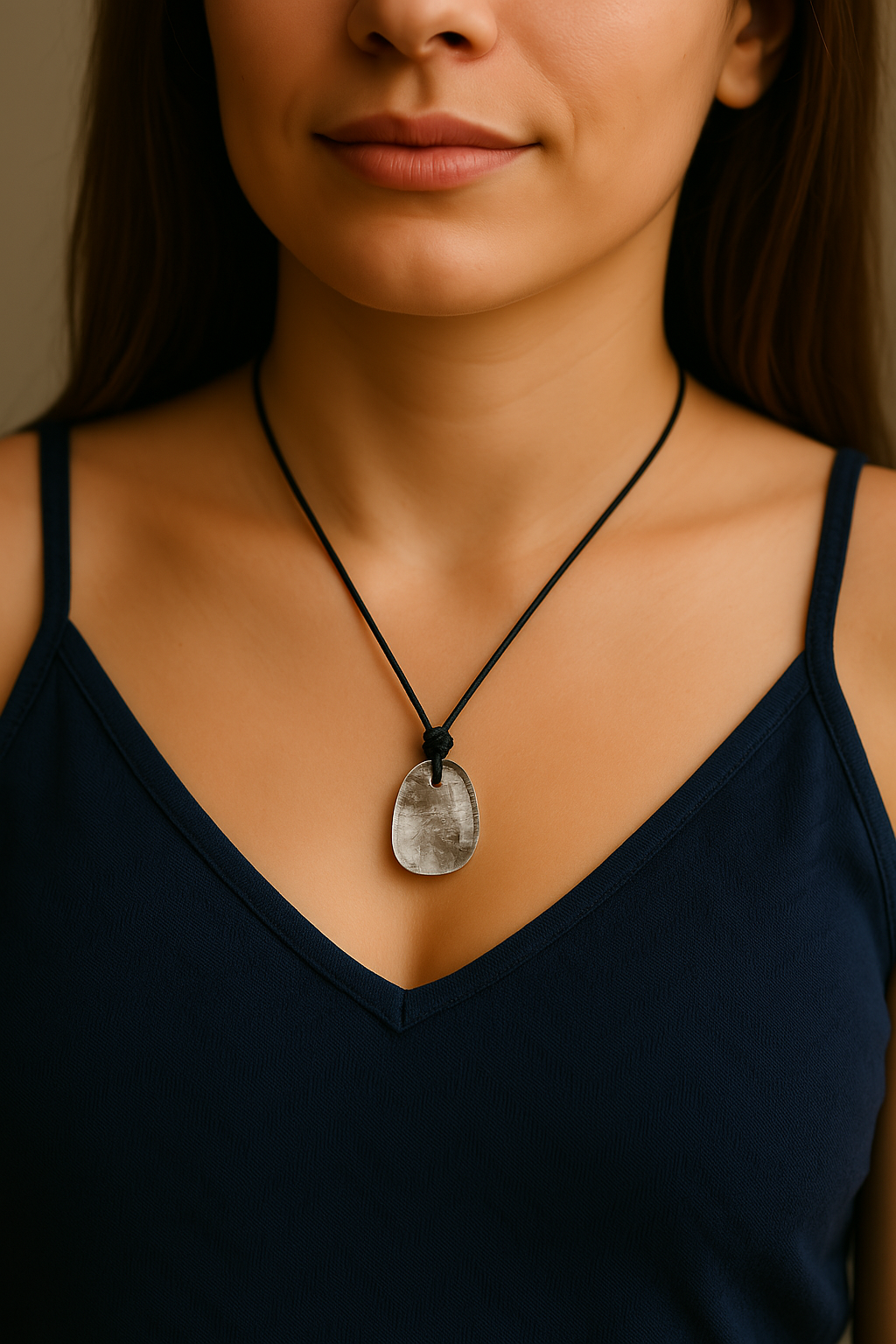 Este pendente apresenta uma pedra natural de Quartzo Cristal em formato oval irregular (entre 2 e 3 cm), acompanhada por um fio de nylon discreto e ajustável. Uma peça de aspeto puro e brilhante, ideal para quem deseja alinhar-se com vibrações de luz e expansão.
