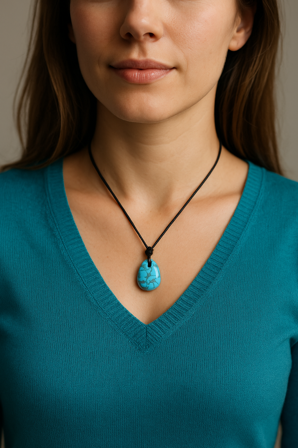 Este pendente é composto por uma pedra de Turquenite natural, com um formato oval irregular (entre 2 e 3 cm de tamanho), acompanhada de um fio de nylon discreto e confortável.