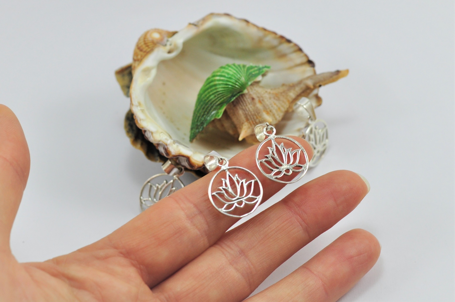 Lindo pendente redondo da flor "Flor de Lótus" em Prata de Lei 925. Incluindo o aro, mede aproximadamente 2,5cm x 1,5cm.