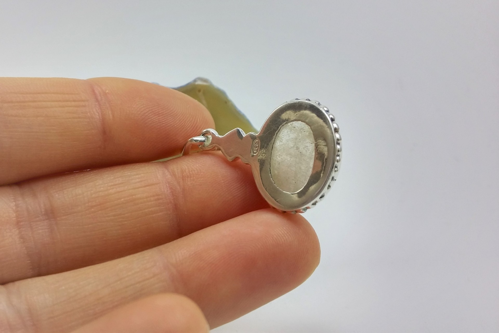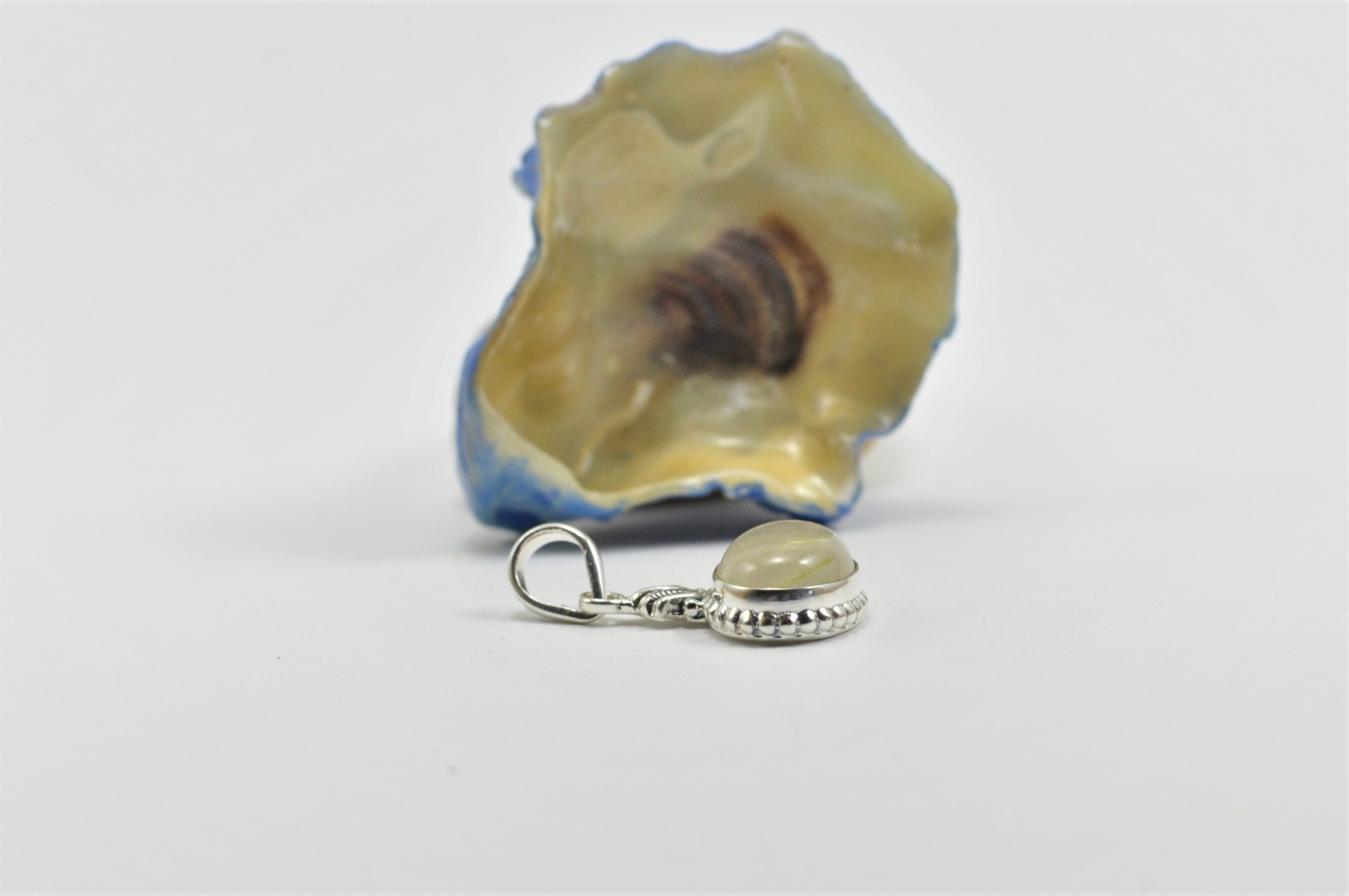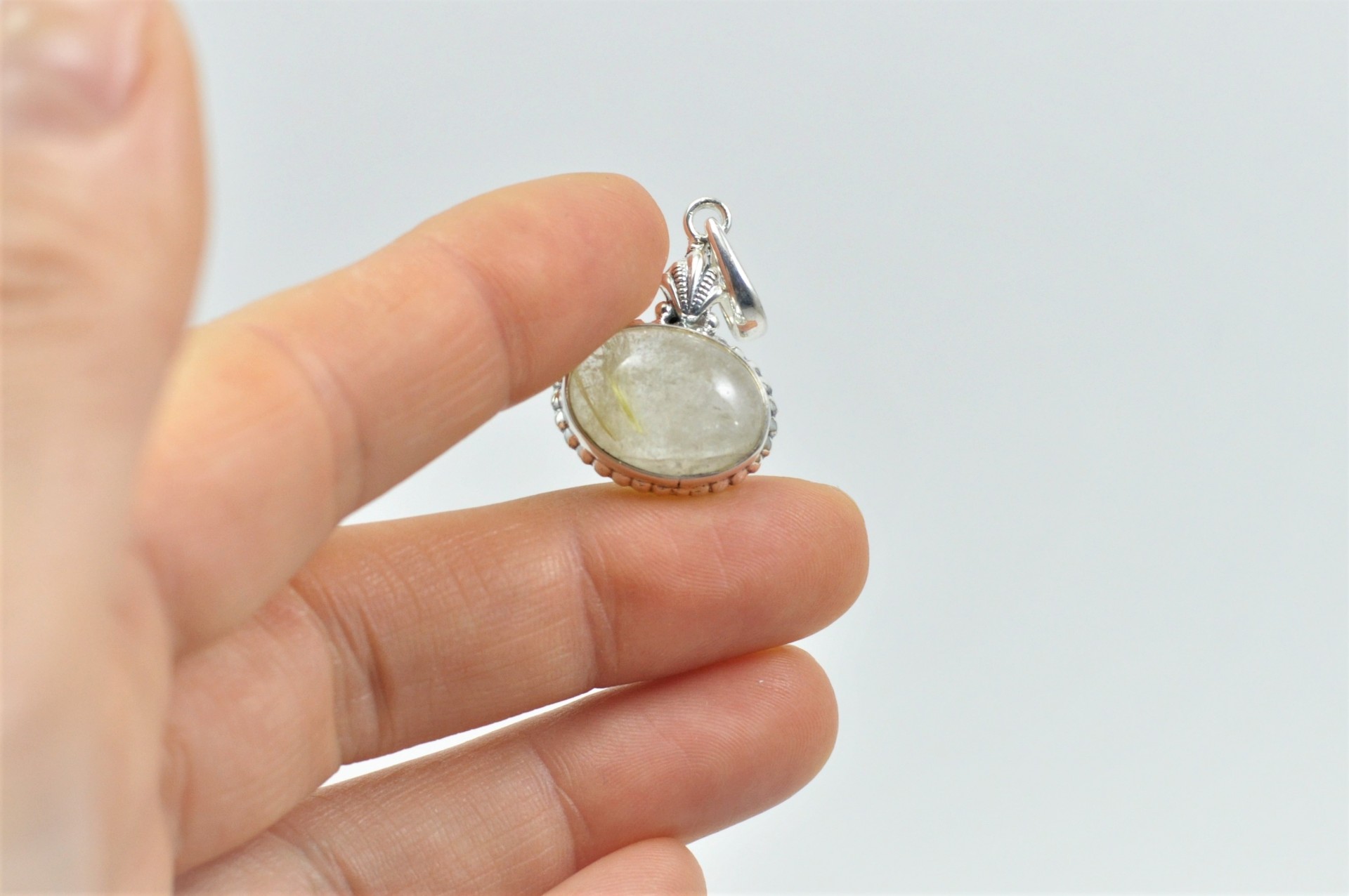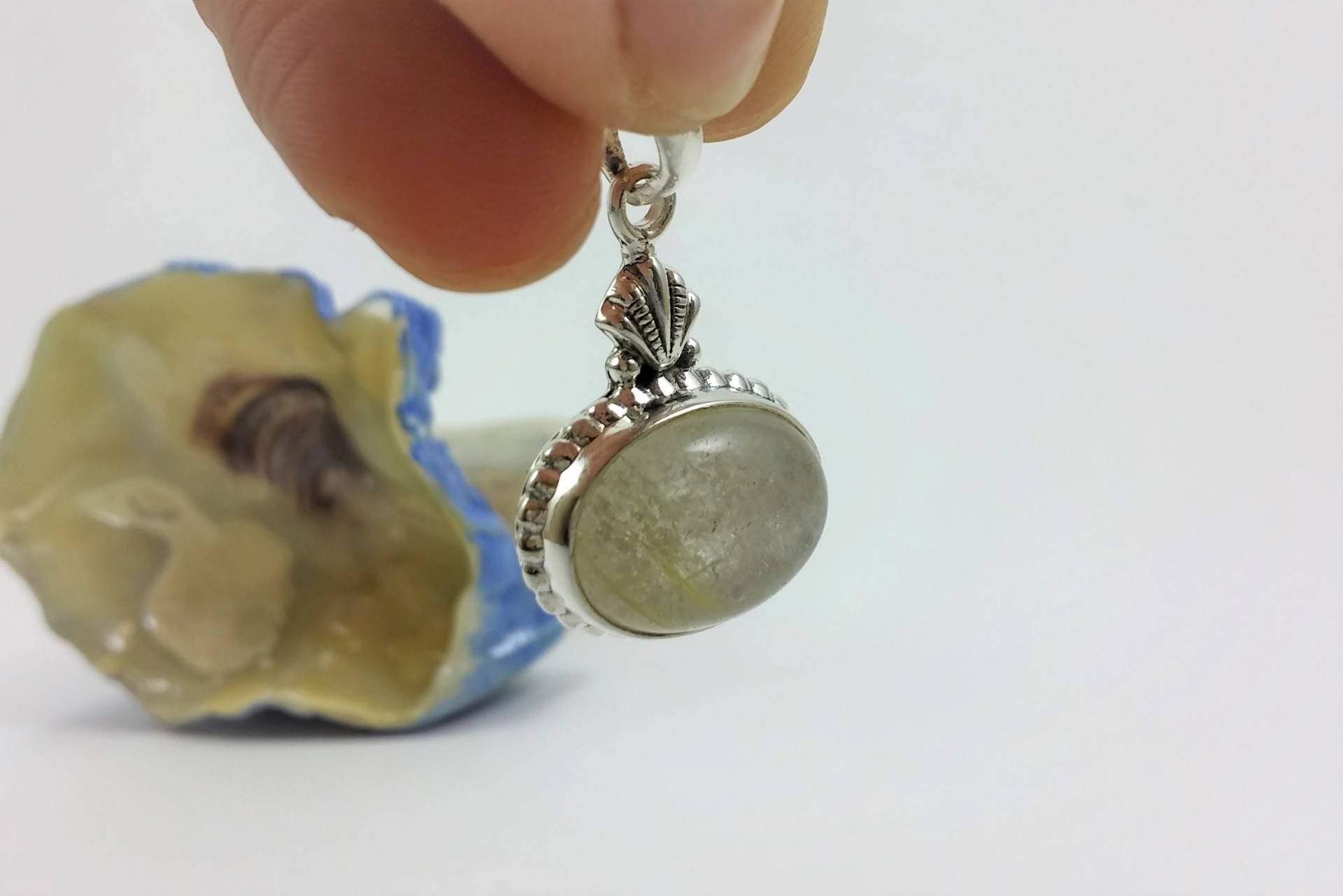 O pendente é em prata com forma oval, que leva um cabochão de pedra natural "Quartzo Rutilado". É um modelo muito original com pormenores muito bonitos. Por exemplo, a anilha é trabalhada em forma de Concha.