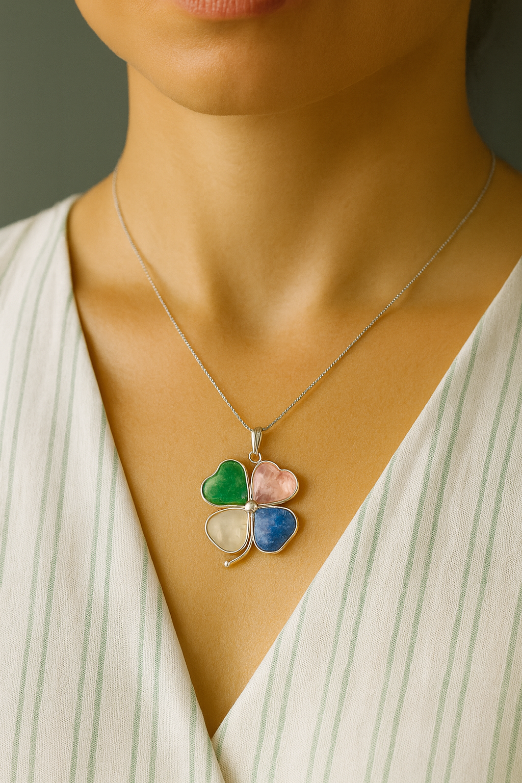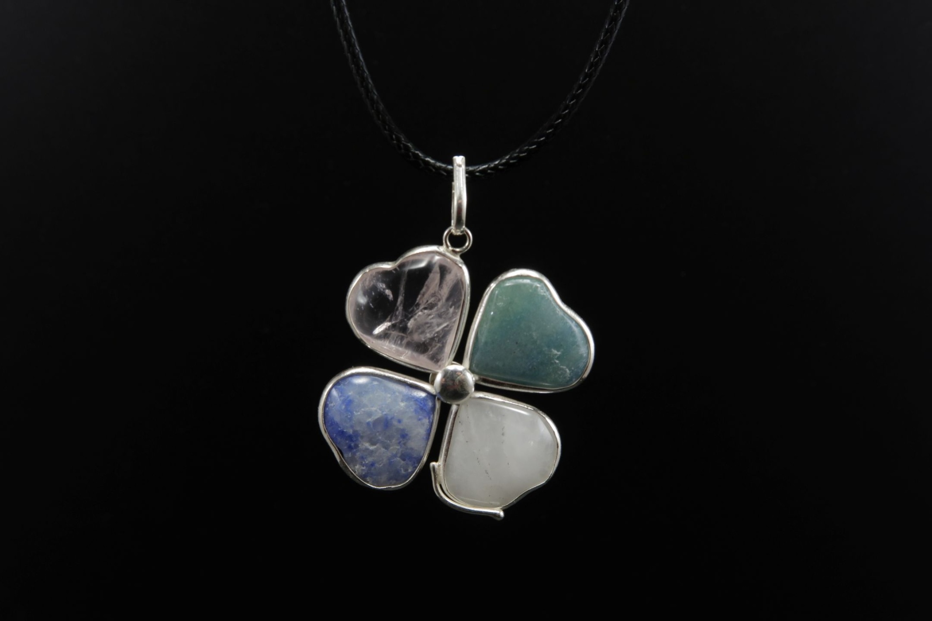Este pendente encantador em forma de trevo, feito em Prata de Lei 925, une quatro cristais naturais de rara beleza e grande valor energético: Aventurina, Sodalita, Quartzo Rosa e Quartzo Leitoso.