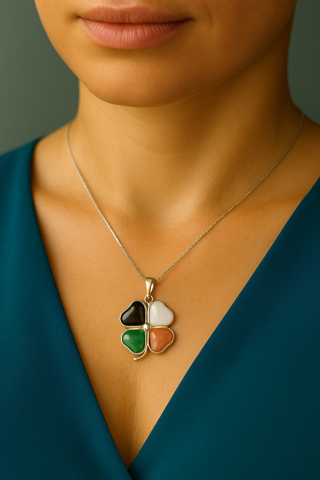 Este pendente artesanal em forma de trevo é trabalhado em Prata de Lei 925 e composto por quatro pedras naturais poderosas: Obsidiana, Aventurina Verde, Pedra da Lua e Quartzo Leitoso.