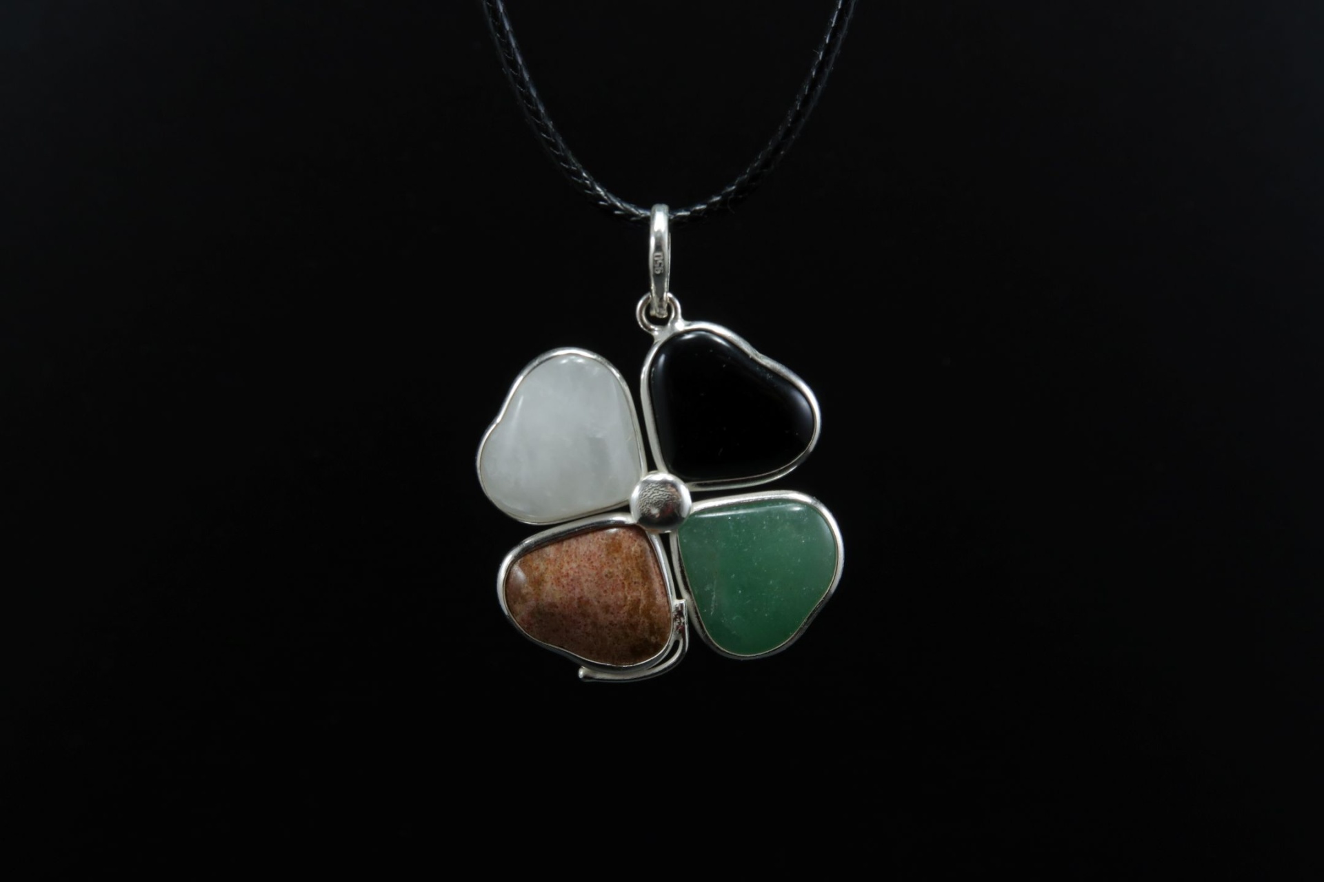 **Pendente Trevo em Prata com Obsidiana, Aventurina, Pedra da Lua e Quartzo Leitoso**