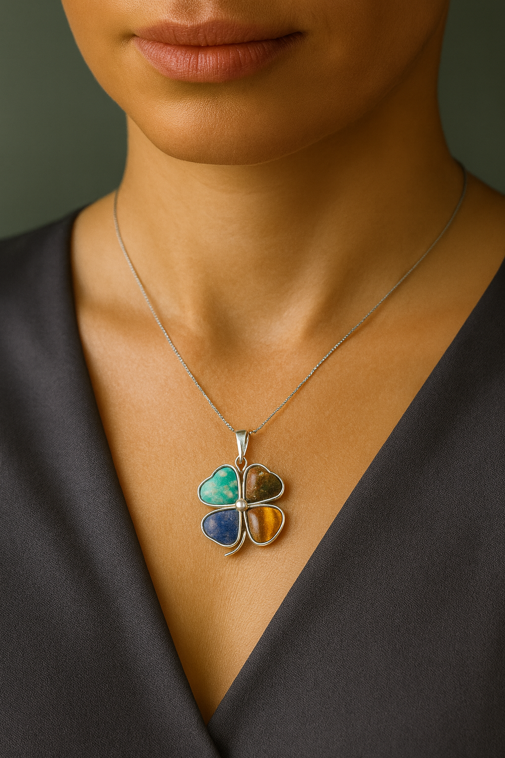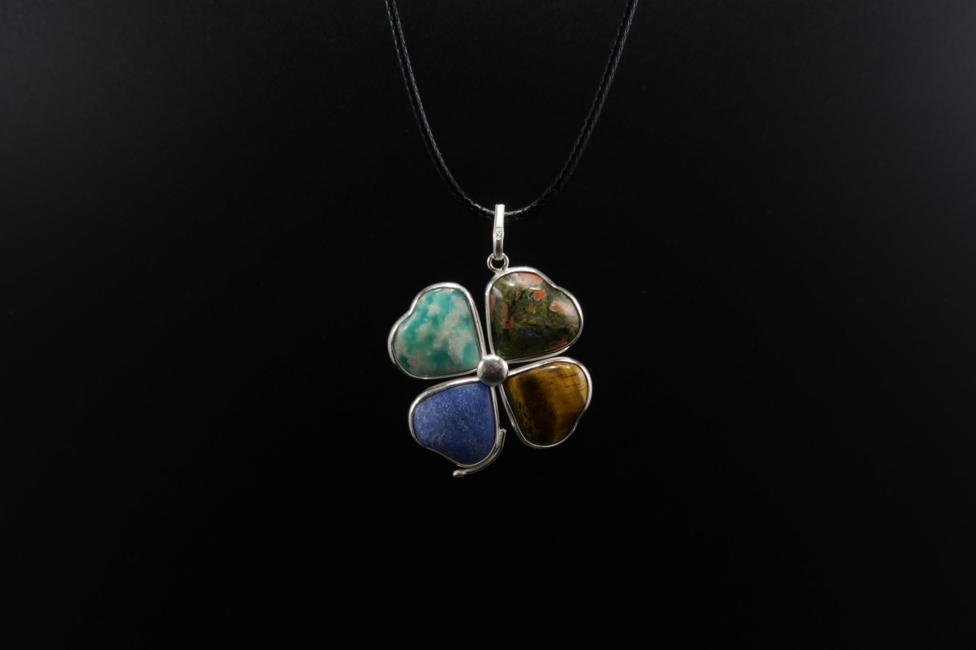 Este elegante pendente em forma de trevo é trabalhado em Prata de Lei 925 e une quatro cristais naturais com propriedades únicas: Olho de Tigre, Unakita, Aventurina Azul e Amazonite.