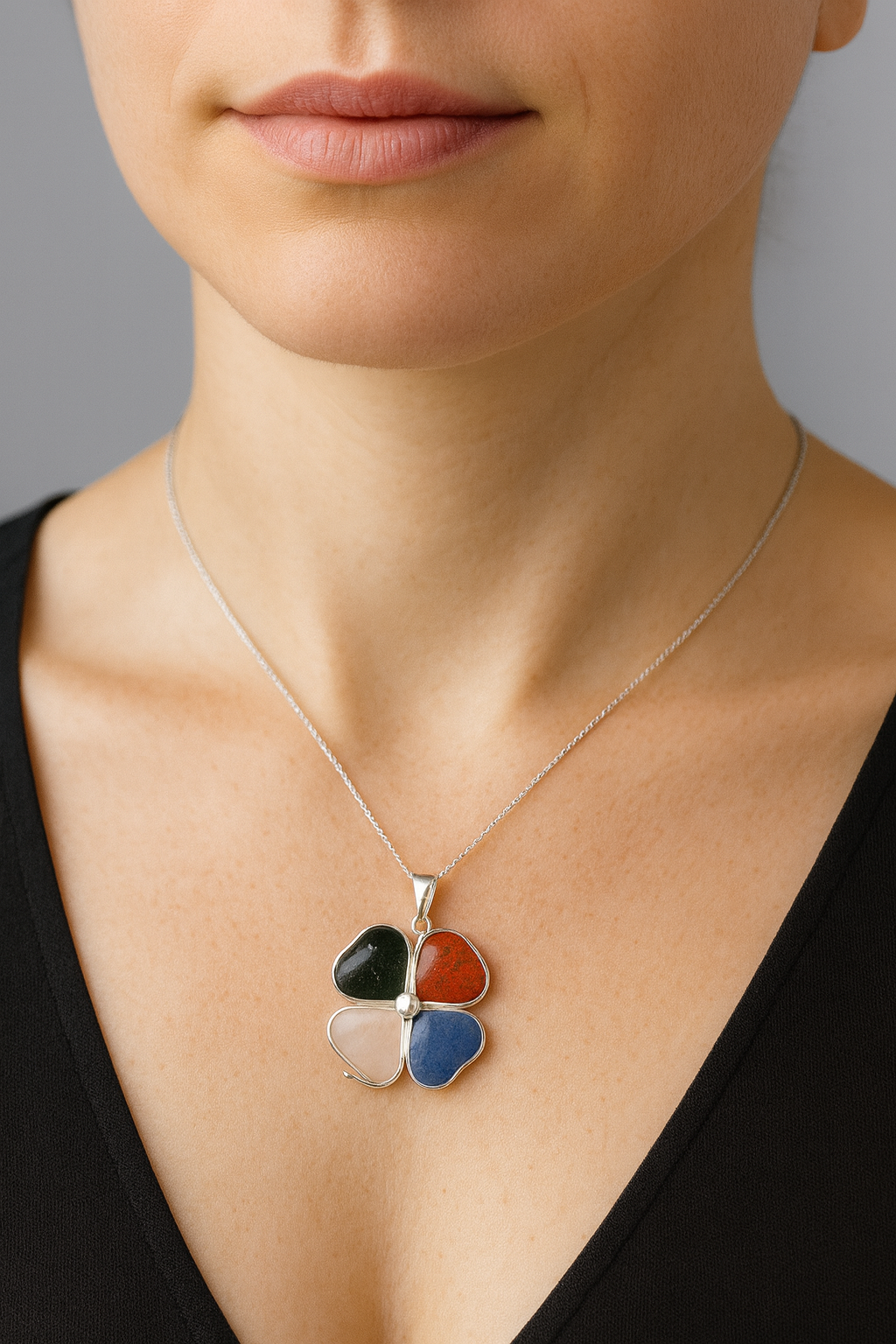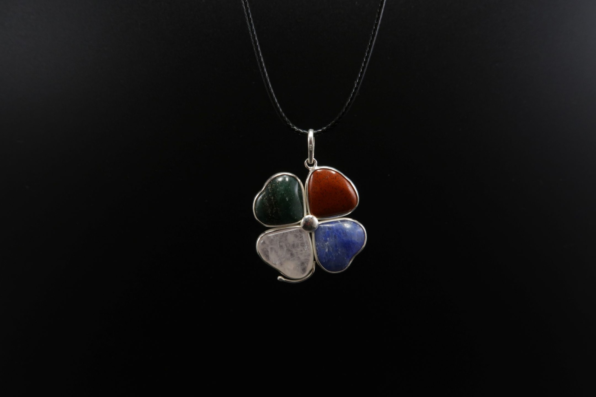 Este pendente artesanal em forma de trevo é trabalhado em Prata de Lei 925 e incorpora quatro cristais naturais cuidadosamente selecionados: Jaspe Vermelho, Aventurina Verde, Sodalita e Quartzo Rosa.