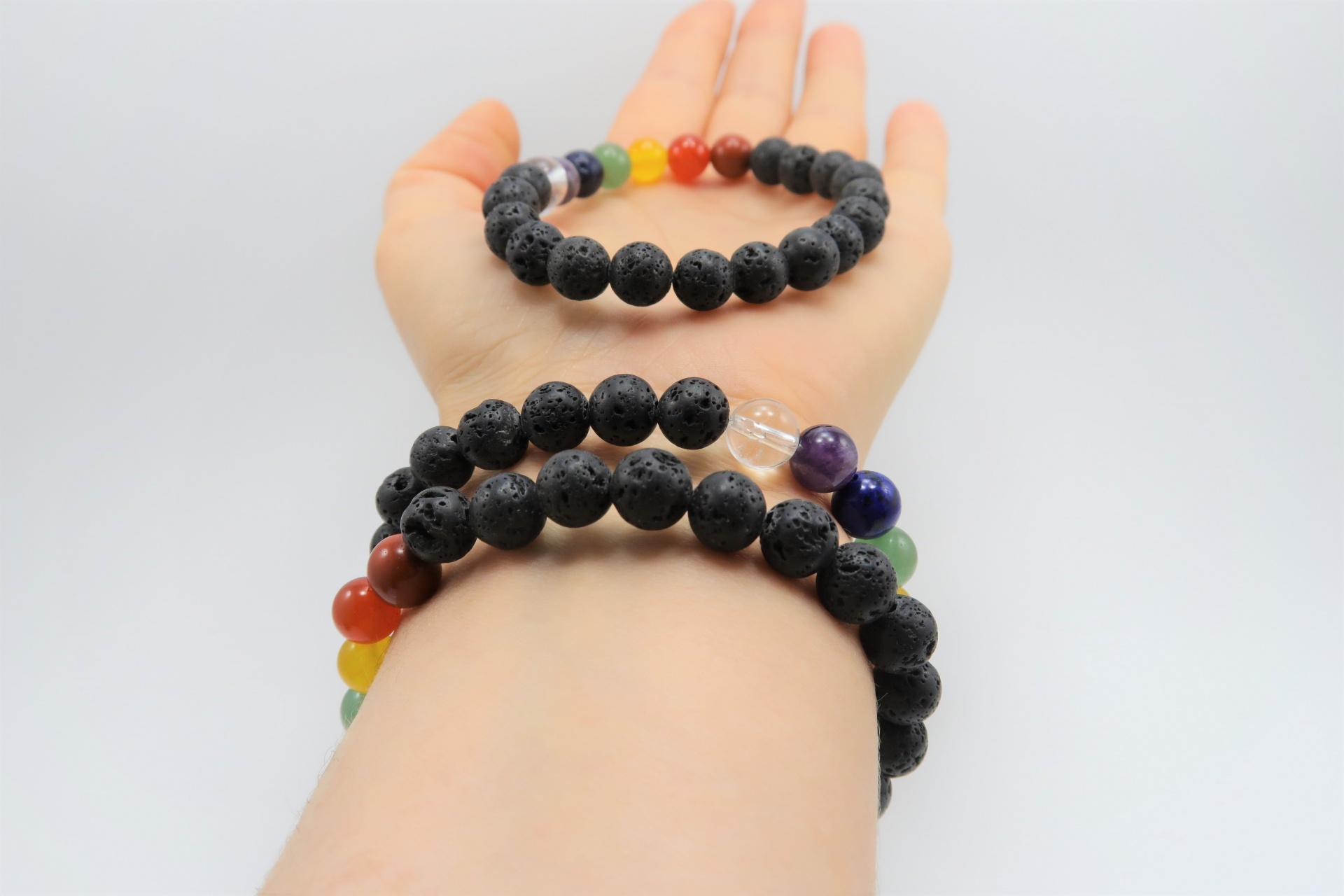 Cada pulseira contém 16 bolas de pedra vulcânica natural de 8mm e 7 bolas ás cores correspondente aos 7 Chacras.